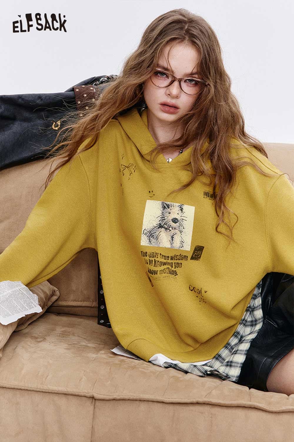 ELFSACK oversized plaid hoodie in yellow with graphic print, perfect for casual stylish looks