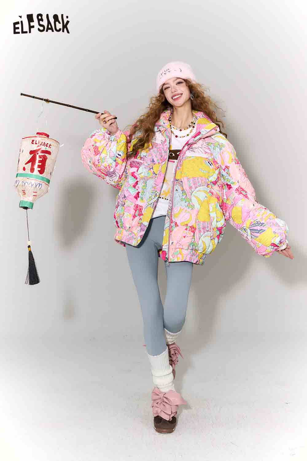 Playful Loose Original All Over Graphic Lapel Bomber Down Jacket