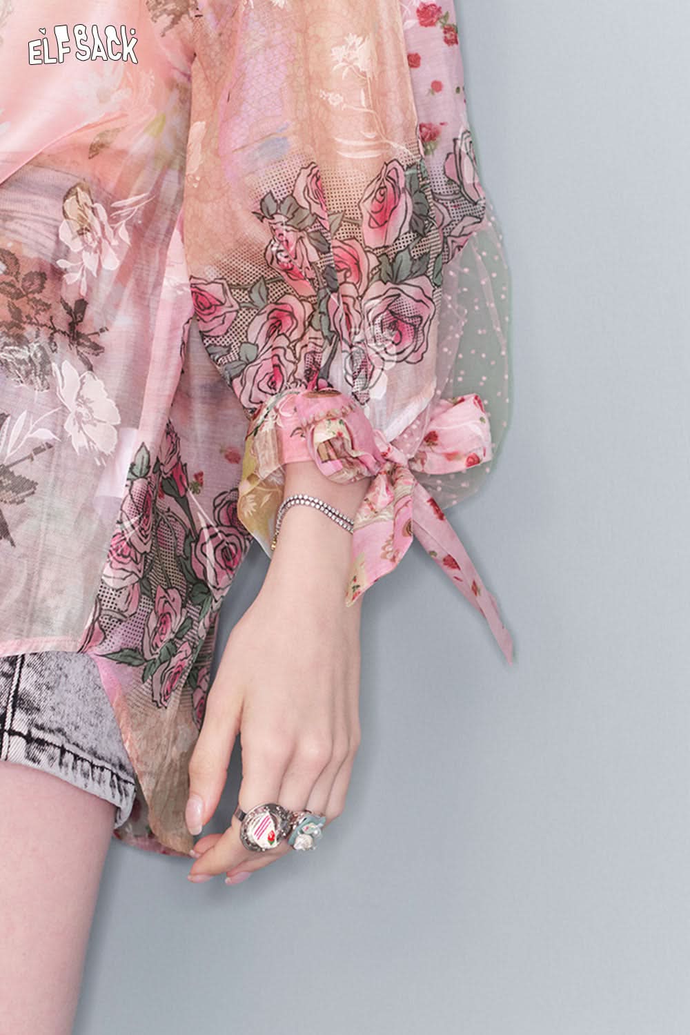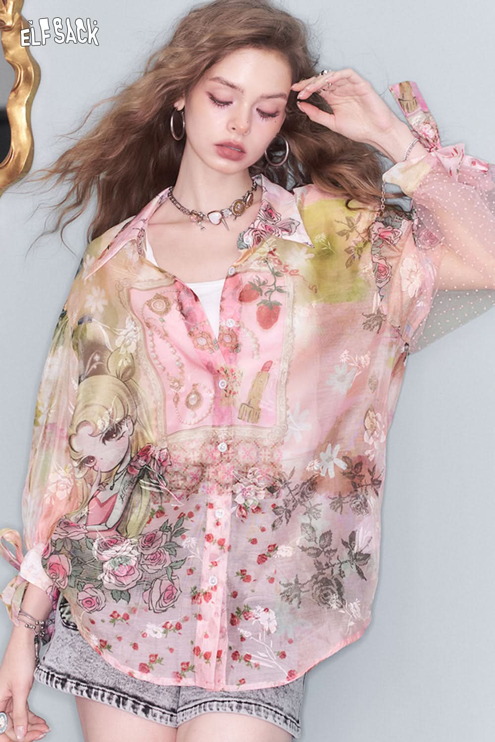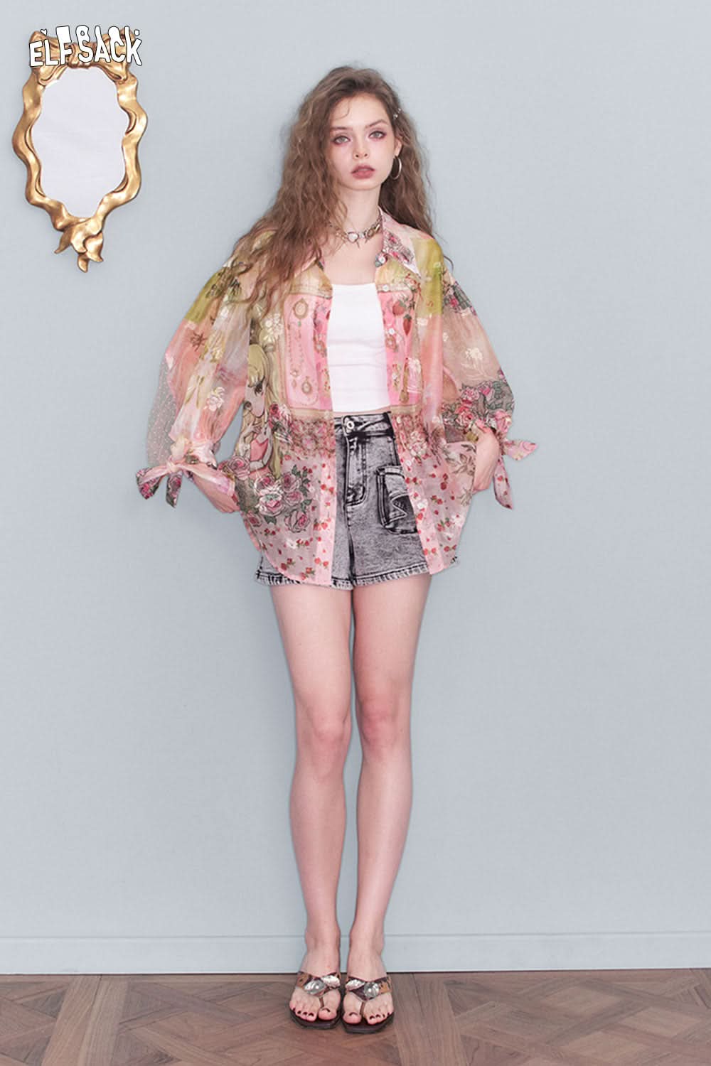 ELFSACK print mesh lace shirt in pastel colors with floral designs, layered over a white tank top