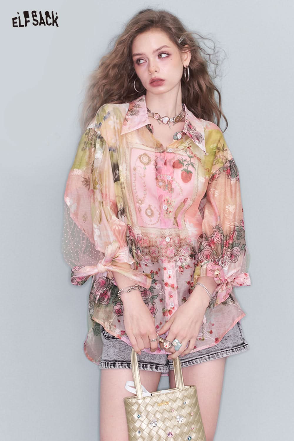 ELFSACK print mesh lace shirt with floral design and colorful graphic details, ideal for stylish layering