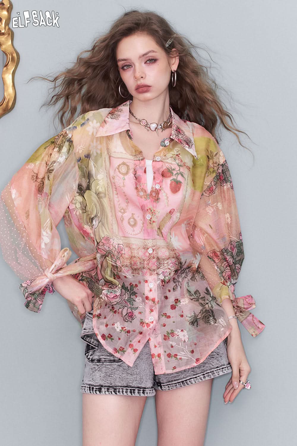 ELFSACK print mesh lace shirt featuring floral design, sheer fabric, and stylish long sleeves