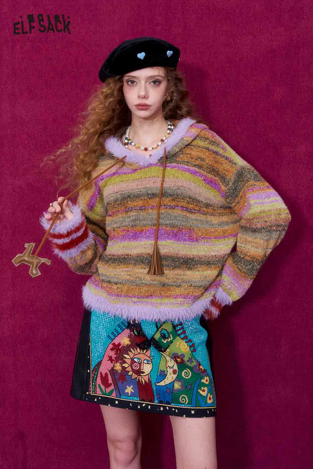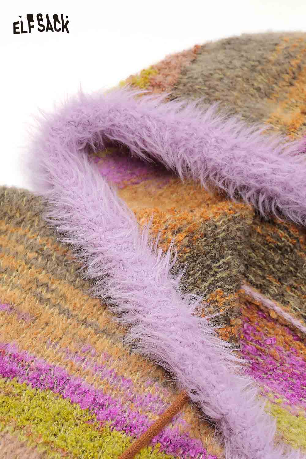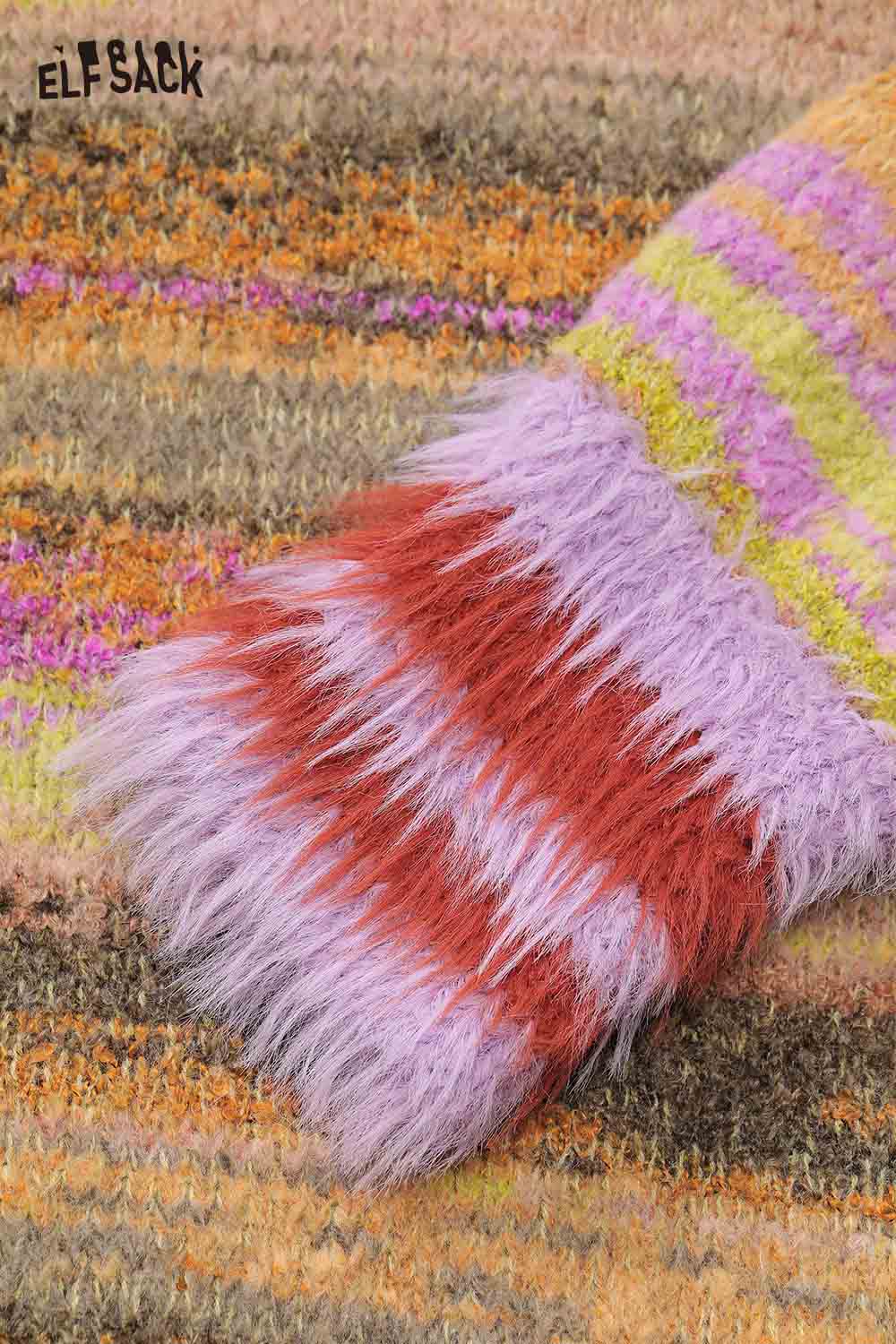 Rainbow Ombre Faux Fur Hem Pony Drawstring Hooded Pullover Sweater