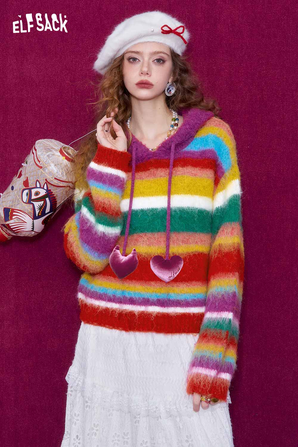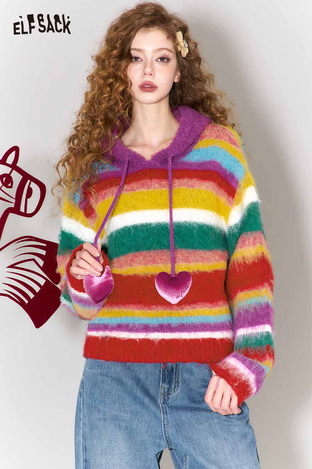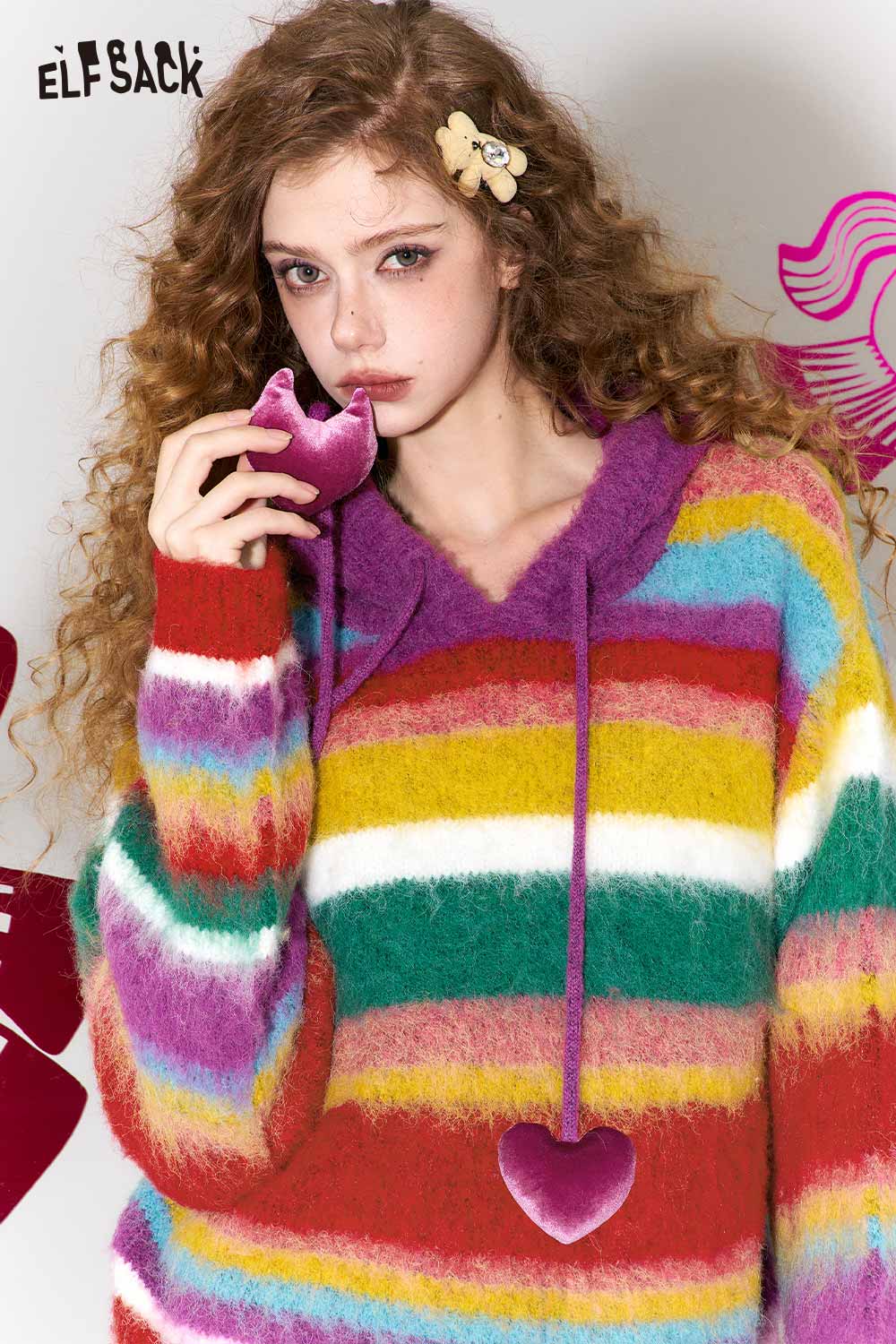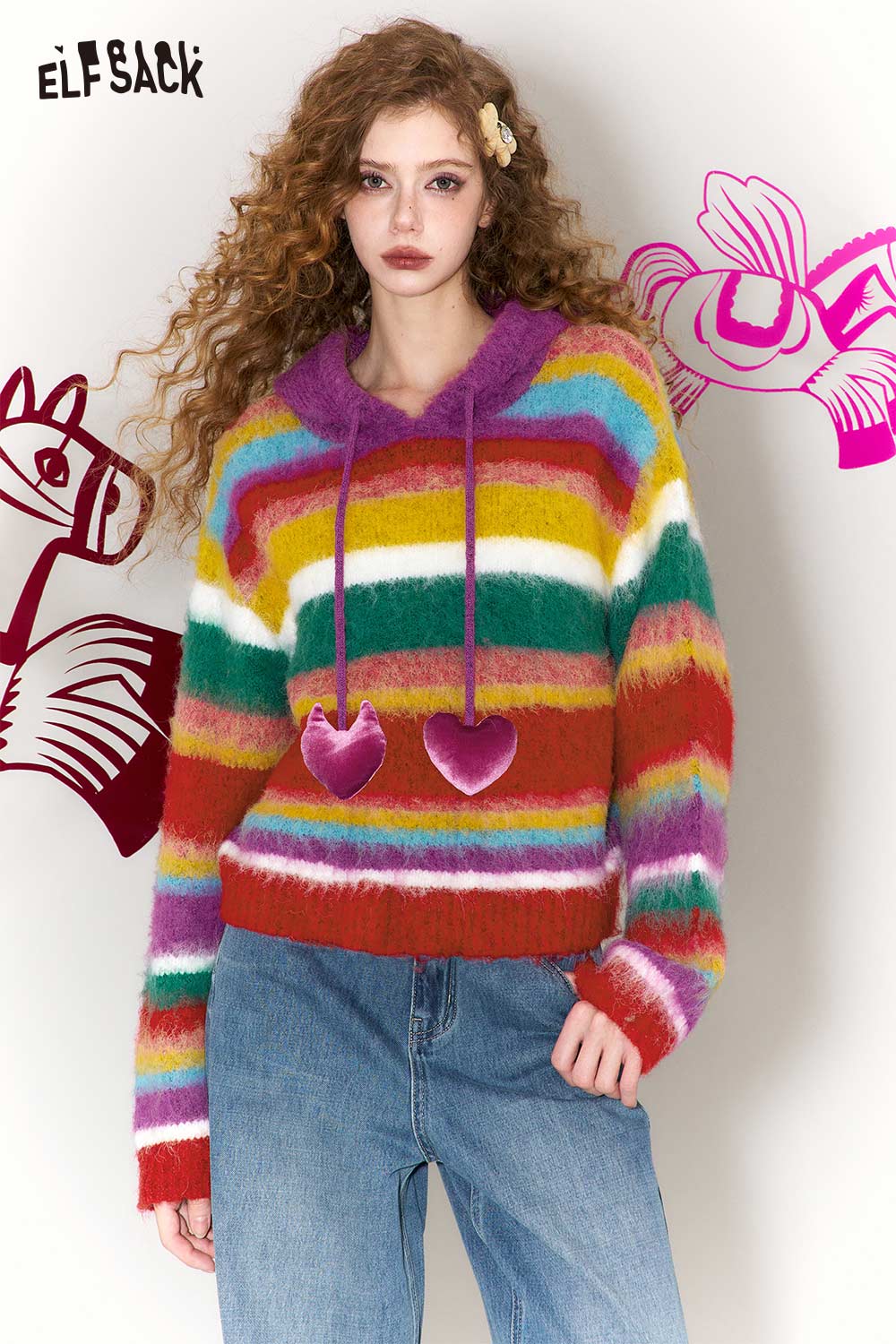 Rainbow Stripe Heart Detail Drawstring Hooded Knit Top