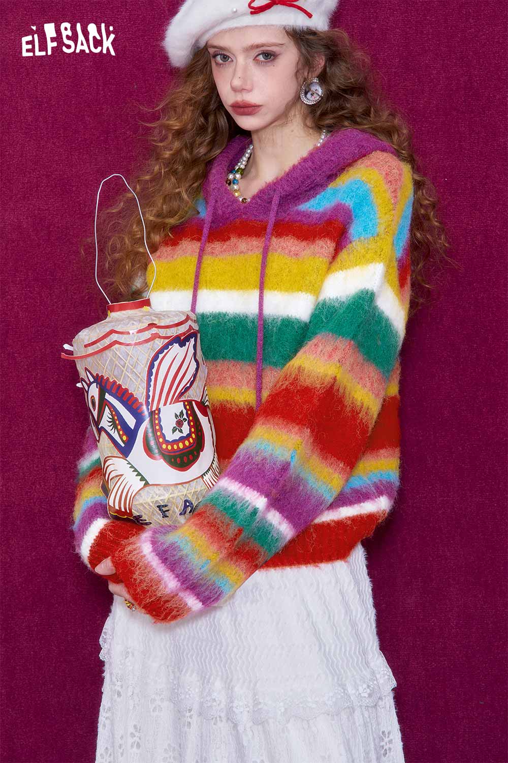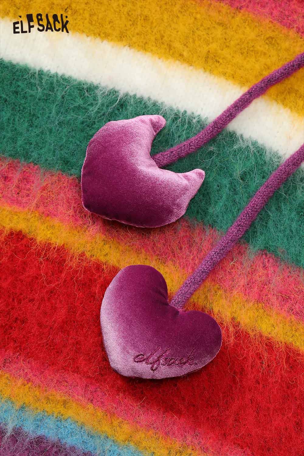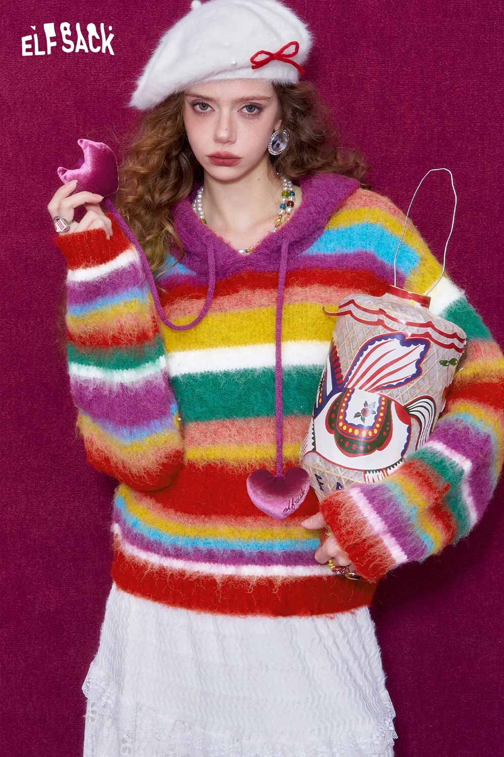 Rainbow Stripe Heart Detail Drawstring Hooded Knit Top
