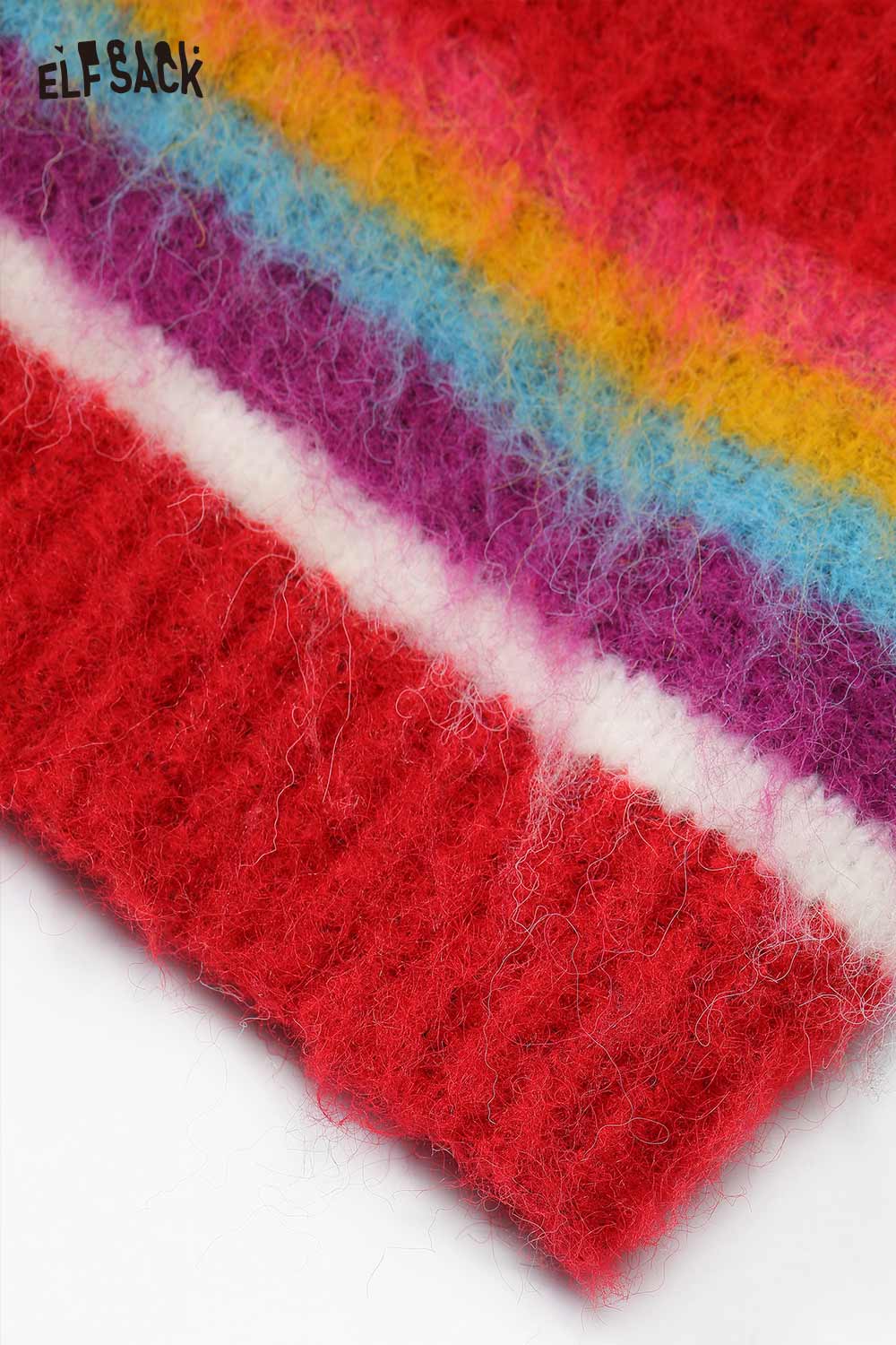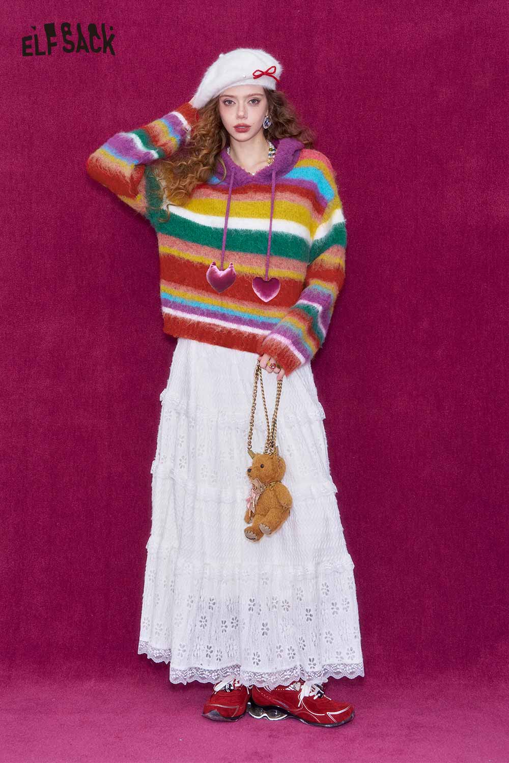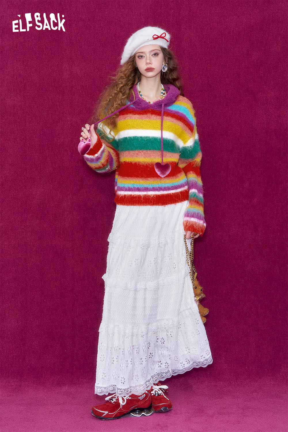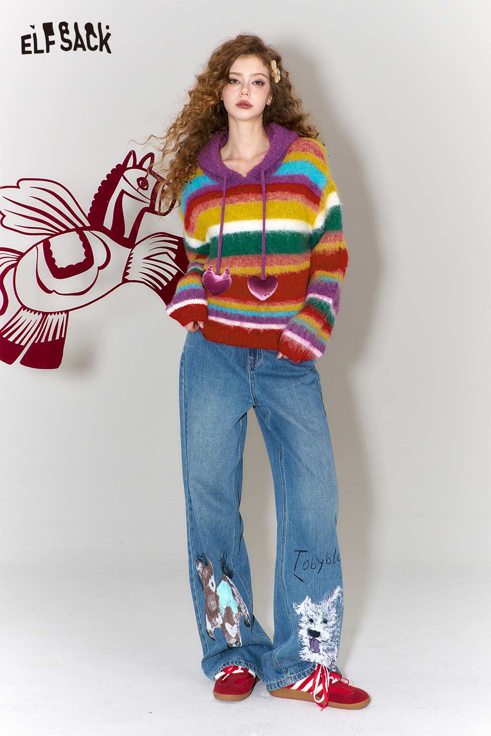 Rainbow Stripe Heart Detail Drawstring Hooded Knit Top