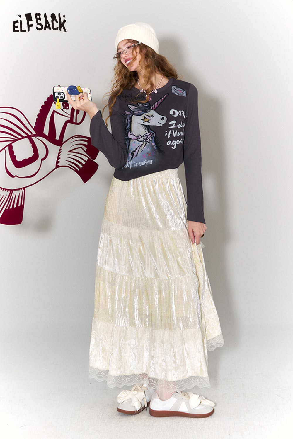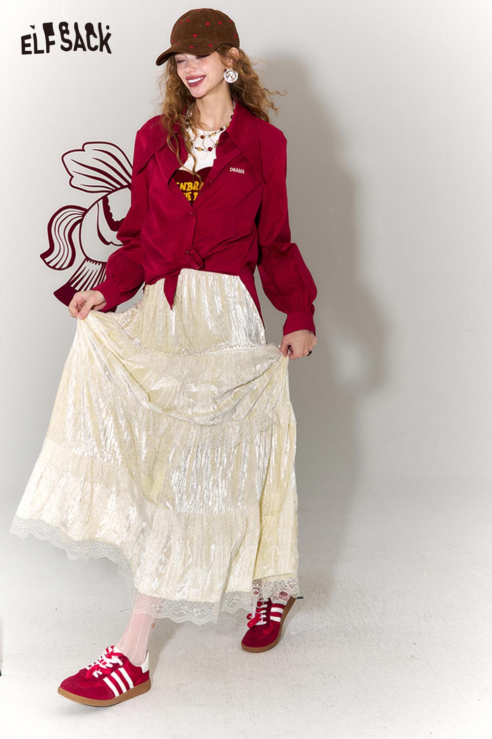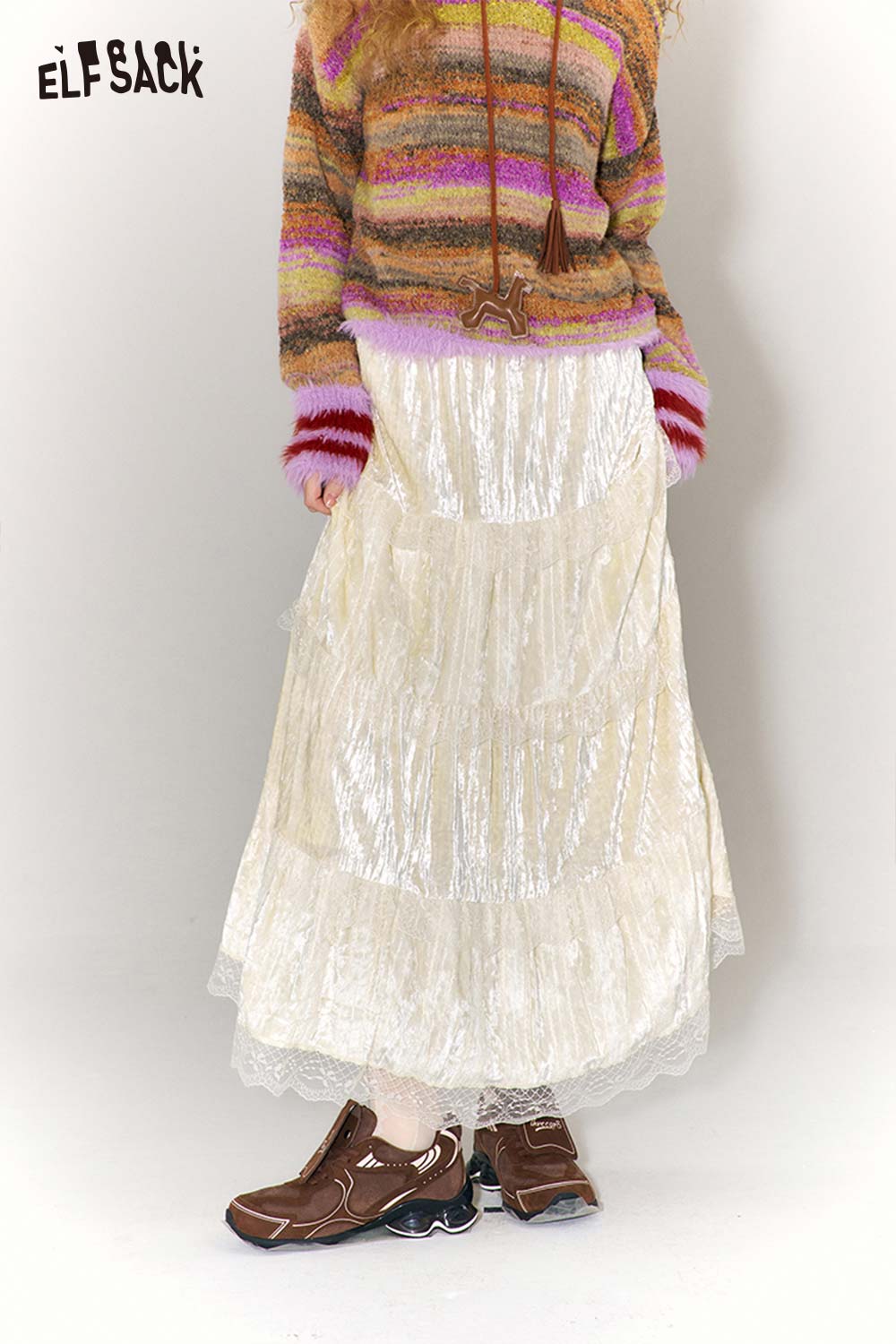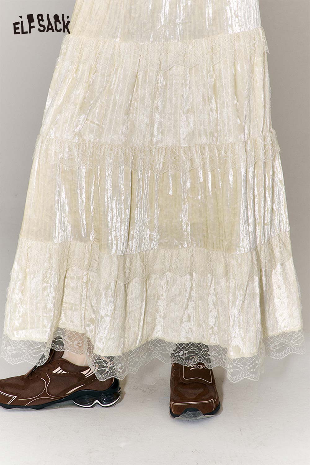 Sweet Multi Layer Lace Trim Velvet Maxi Skirt