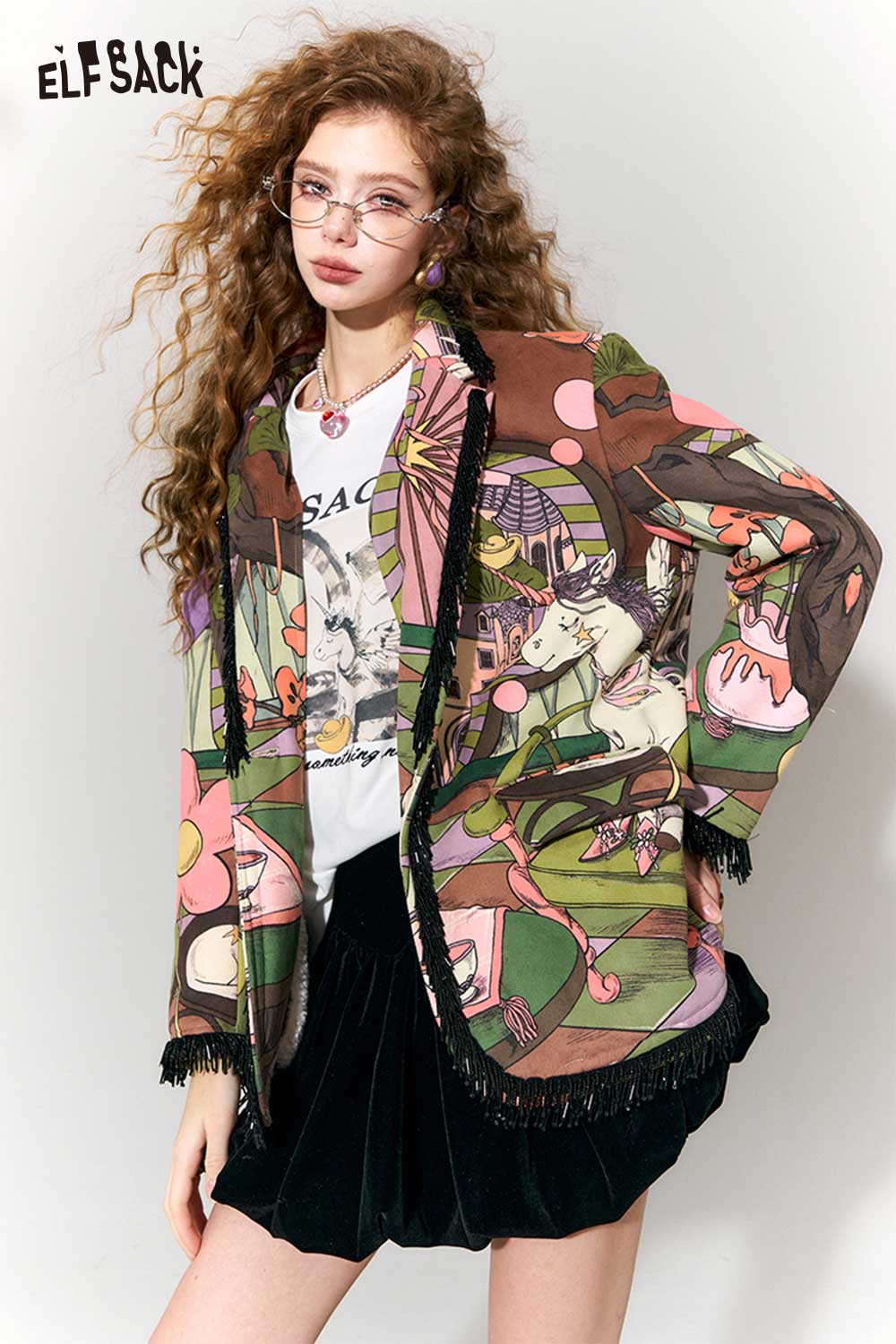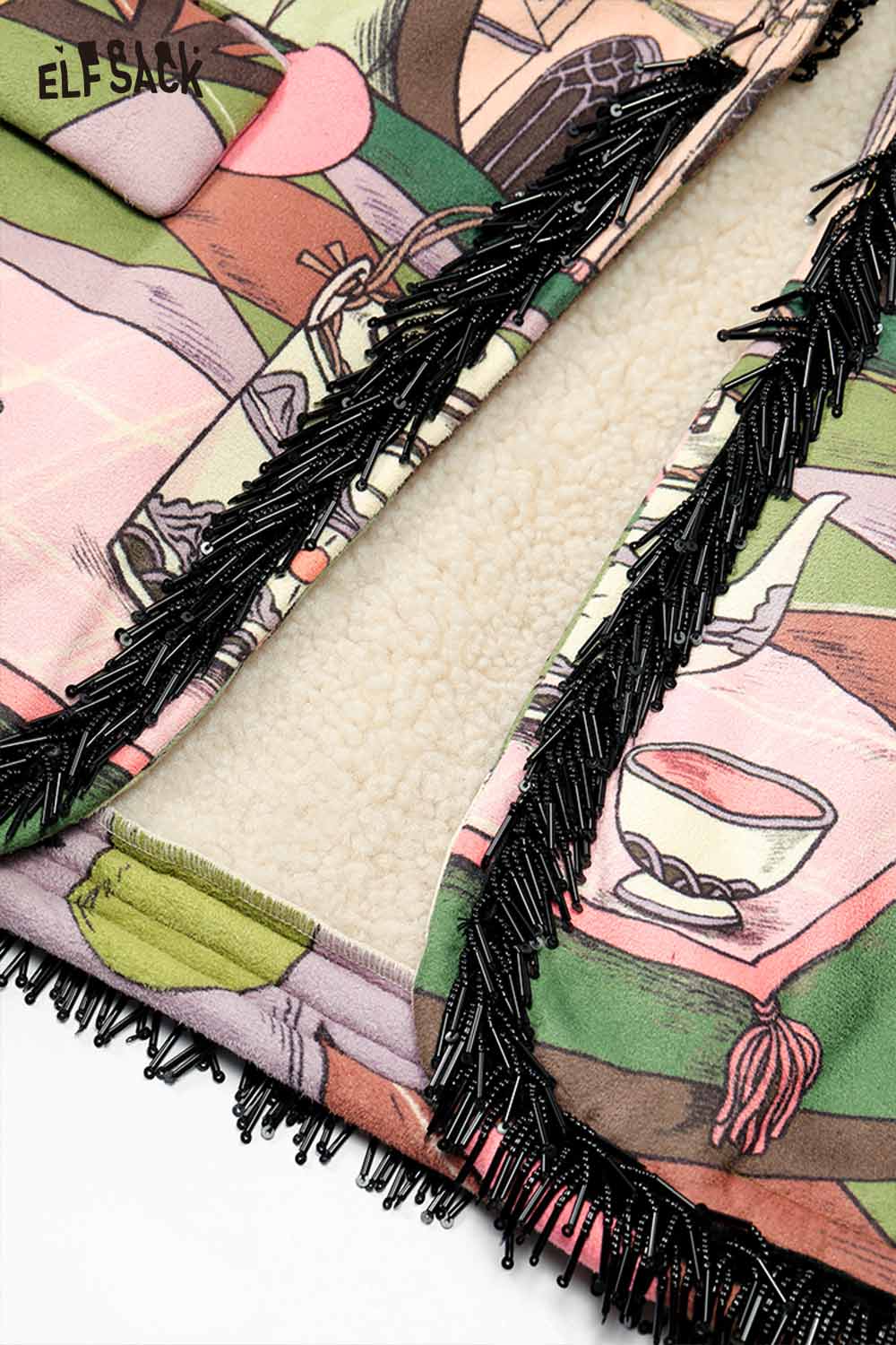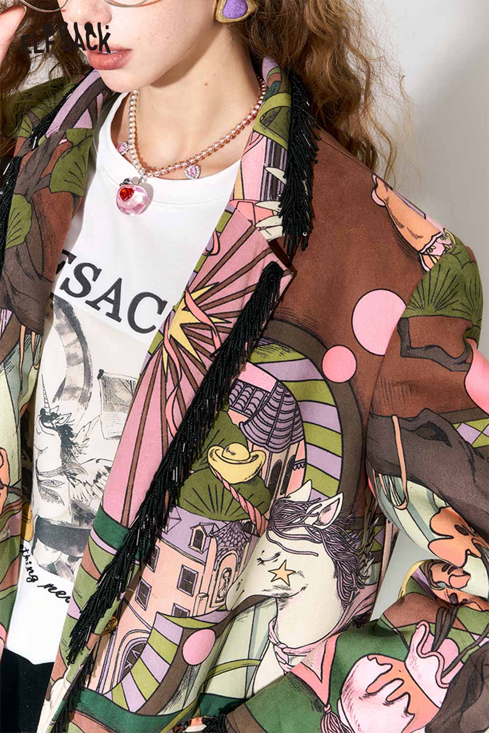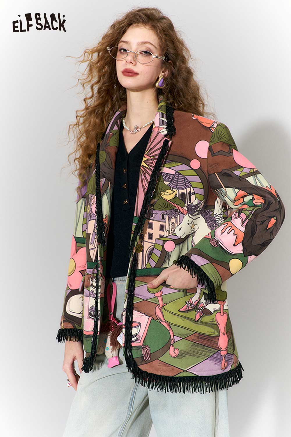 Vintage Fairy Tale Scene Print Fringe Trim Wool Blazer