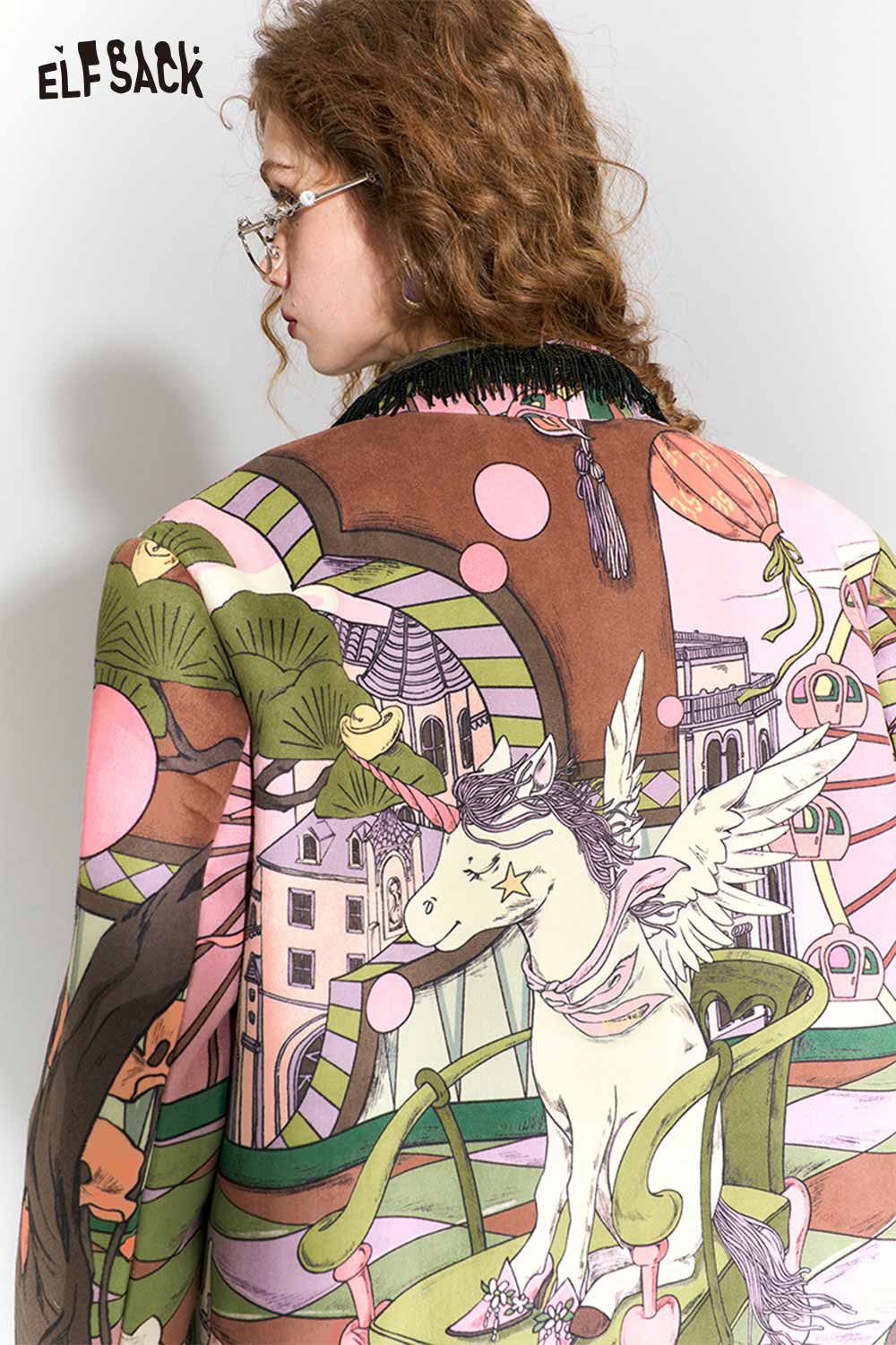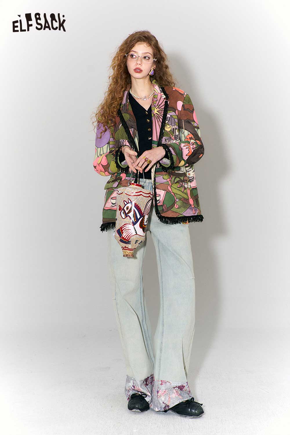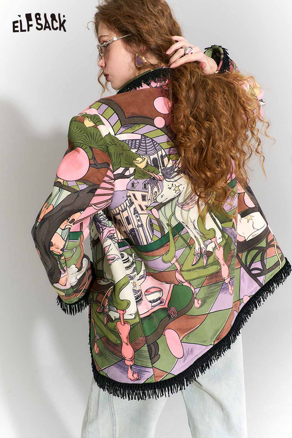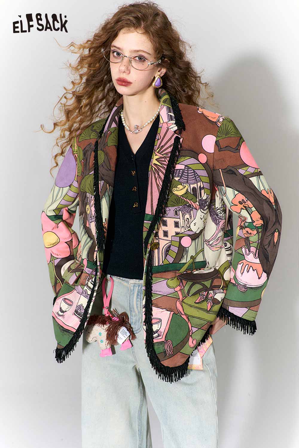 Vintage Fairy Tale Scene Print Fringe Trim Wool Blazer