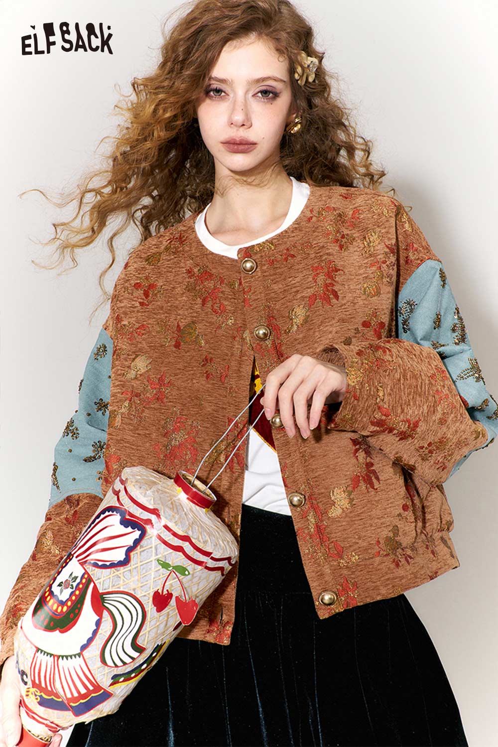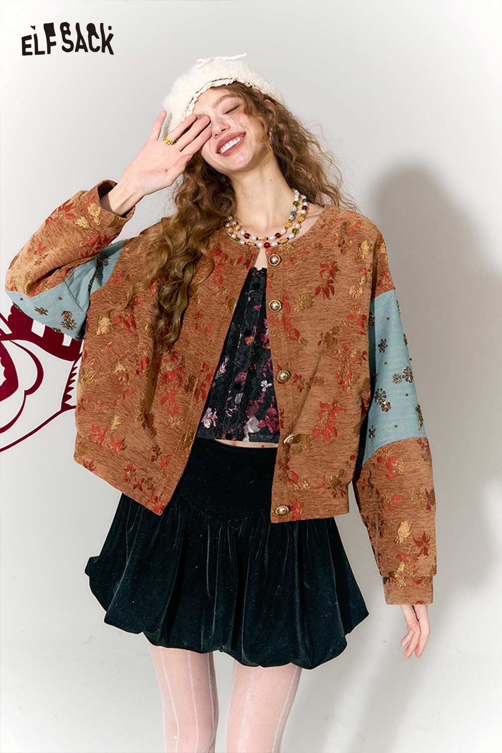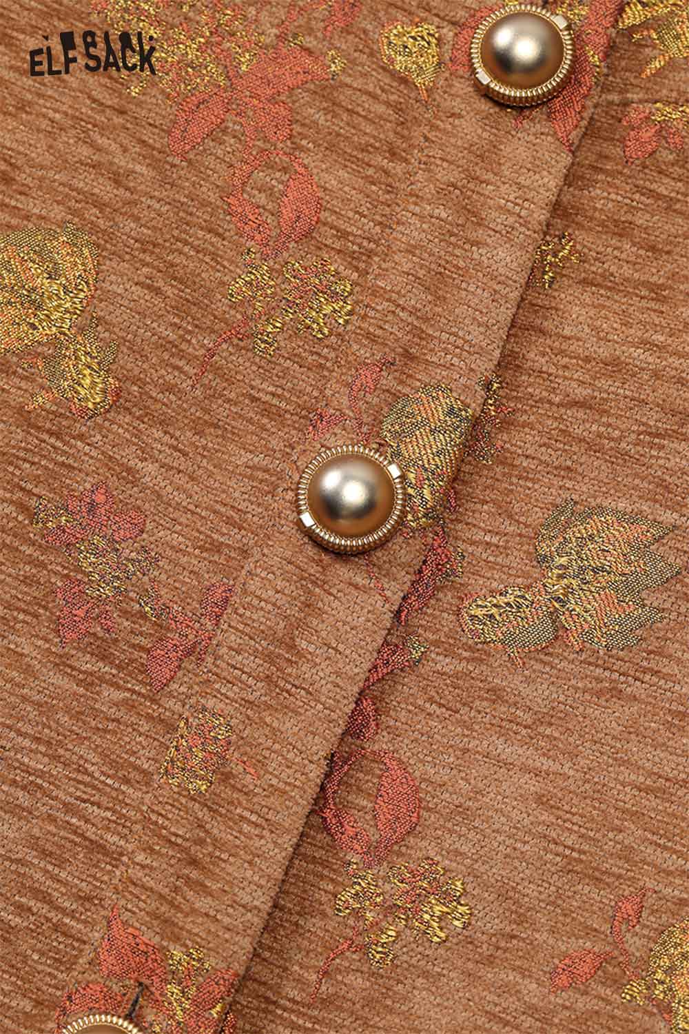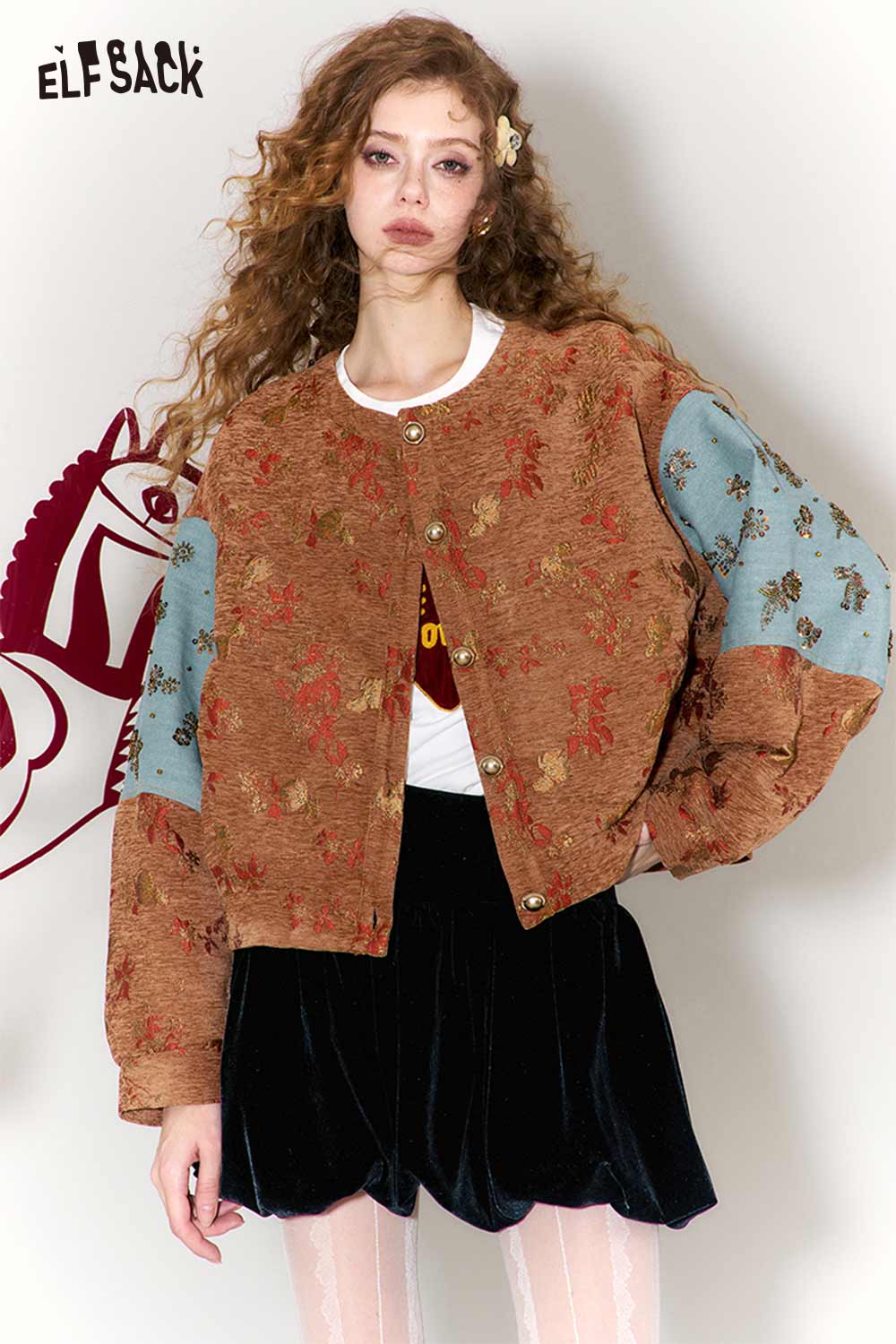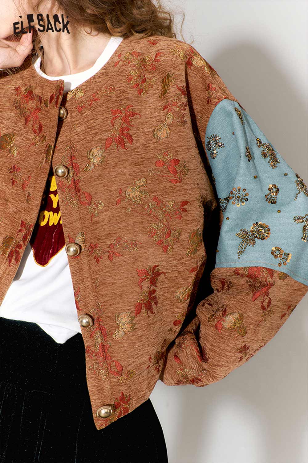 Vintage Floral Jacquard Contrast Sleeve Round Neck Short Jacket
