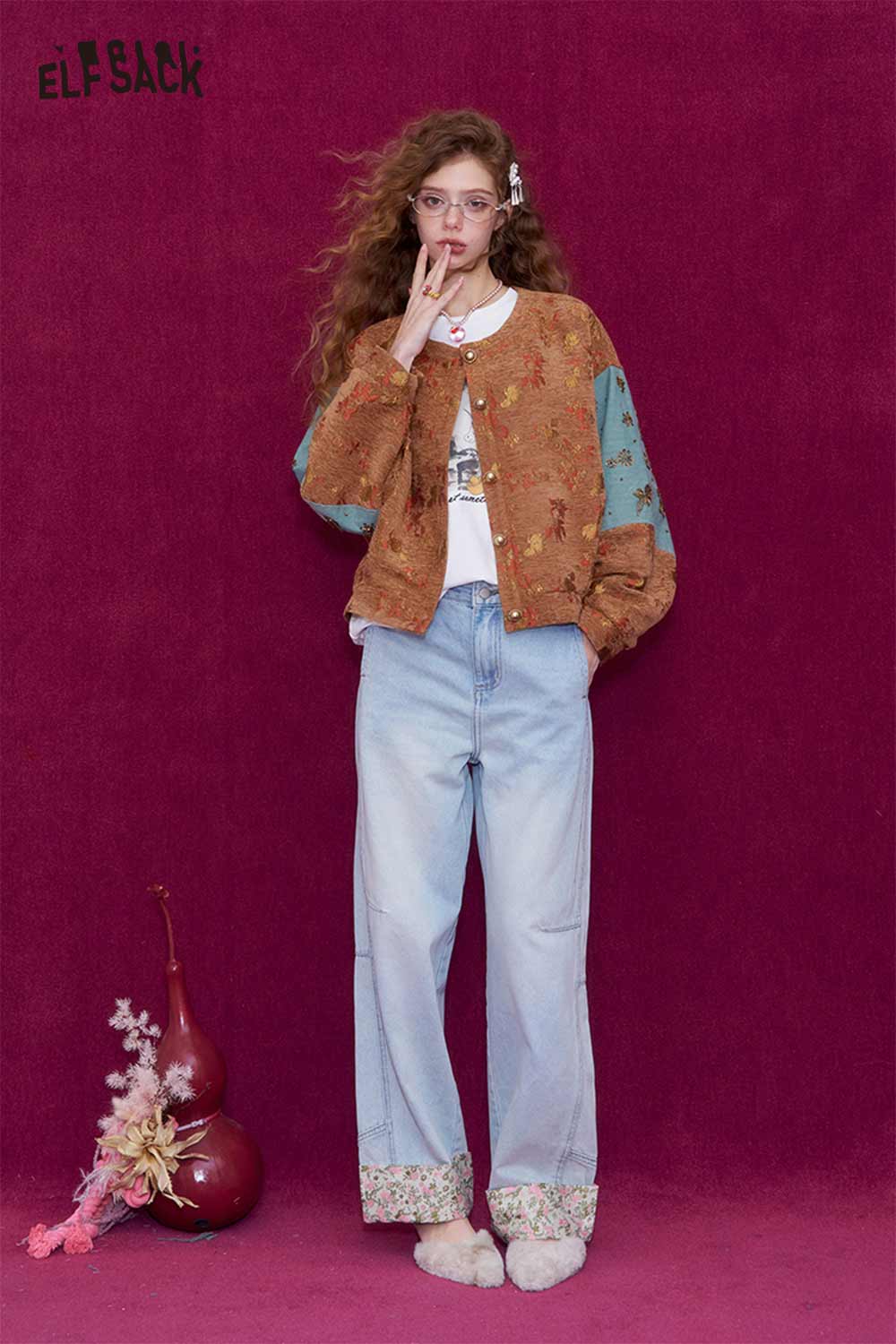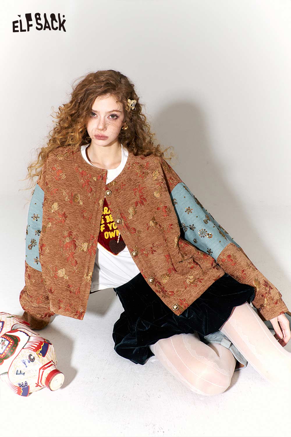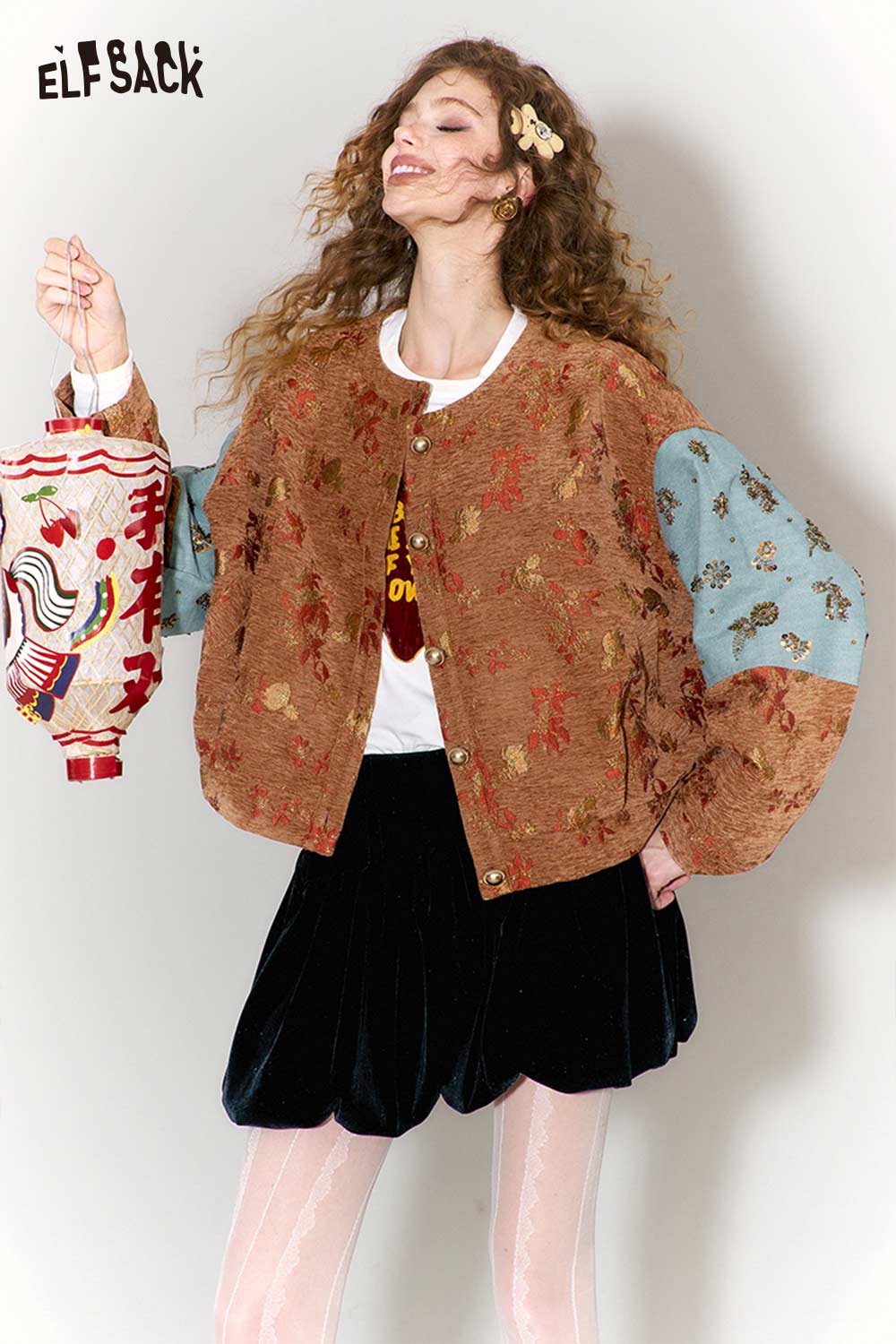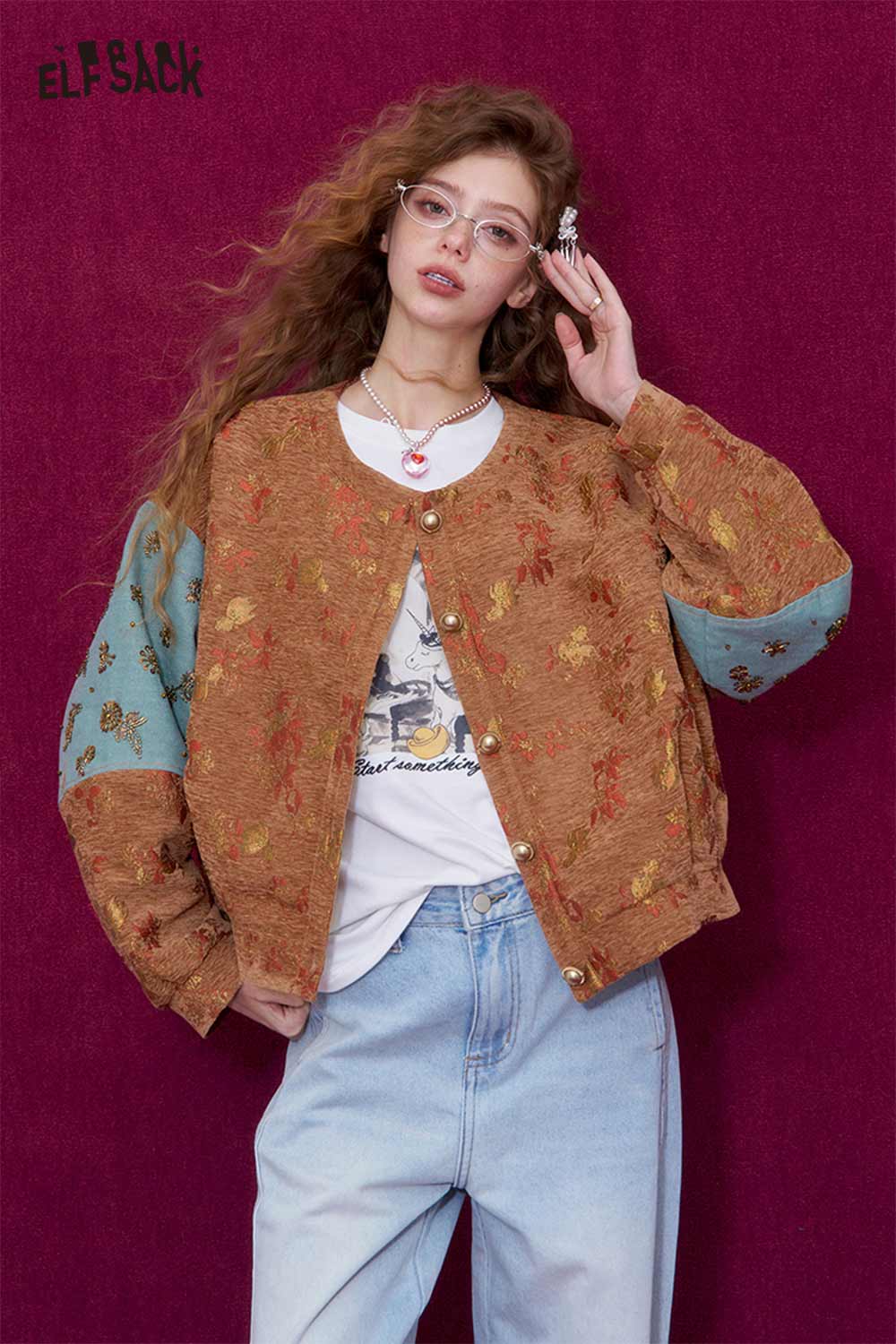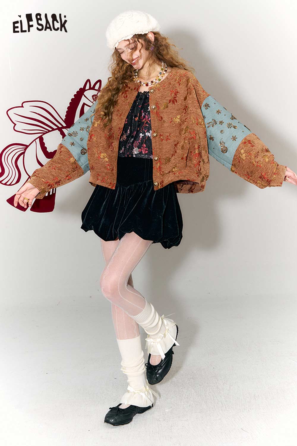 Vintage Floral Jacquard Contrast Sleeve Round Neck Short Jacket