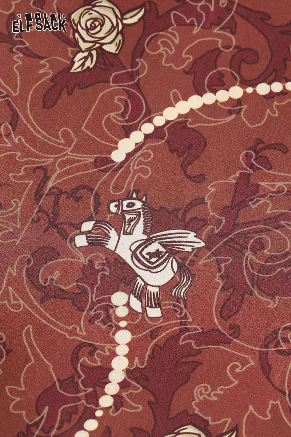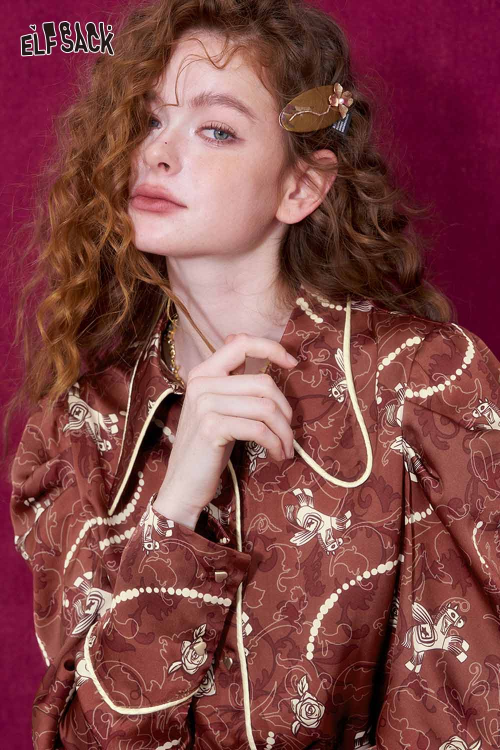 Vintage Pony Rose Print Pearl Trim Lapel Shirt