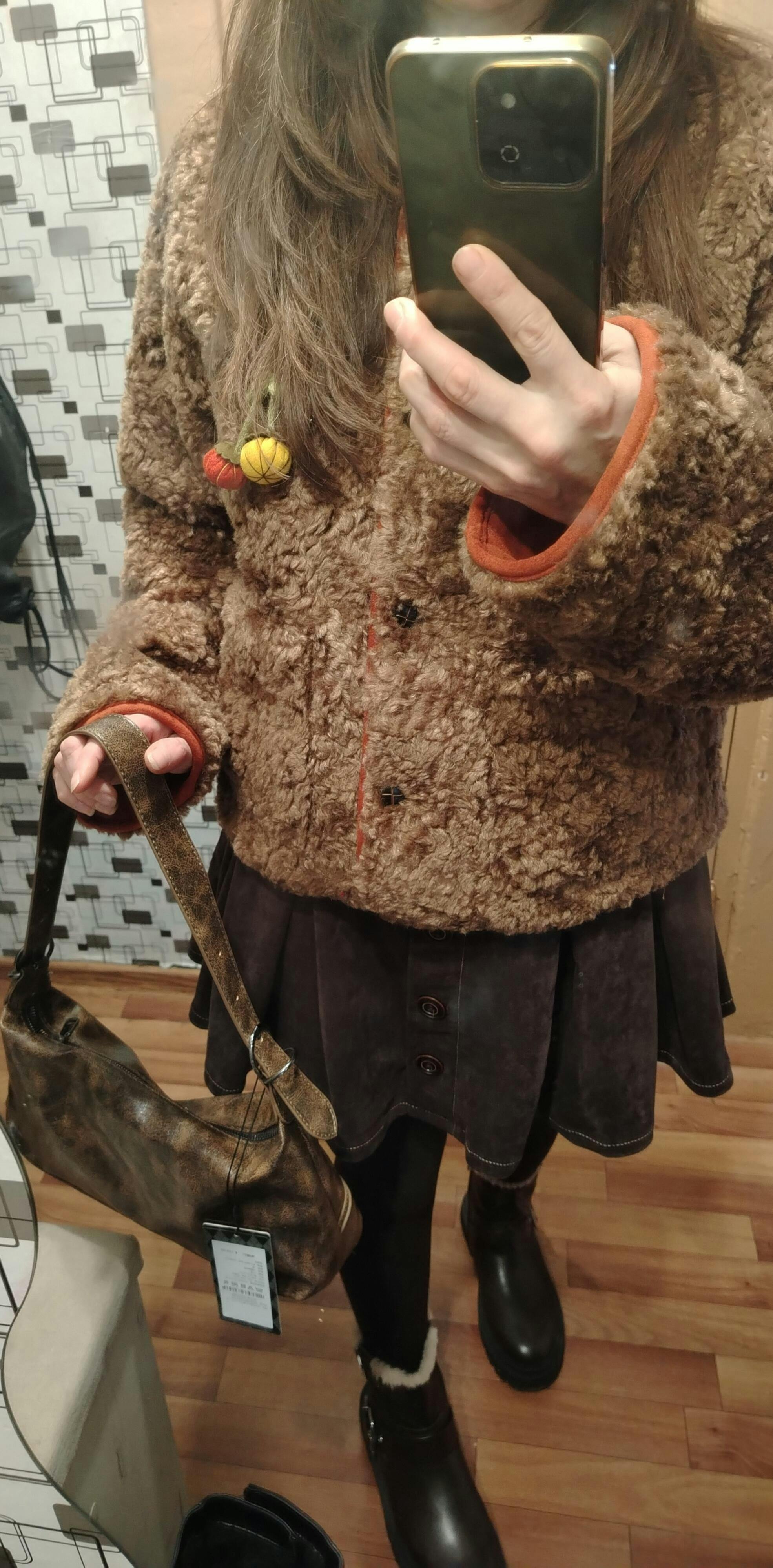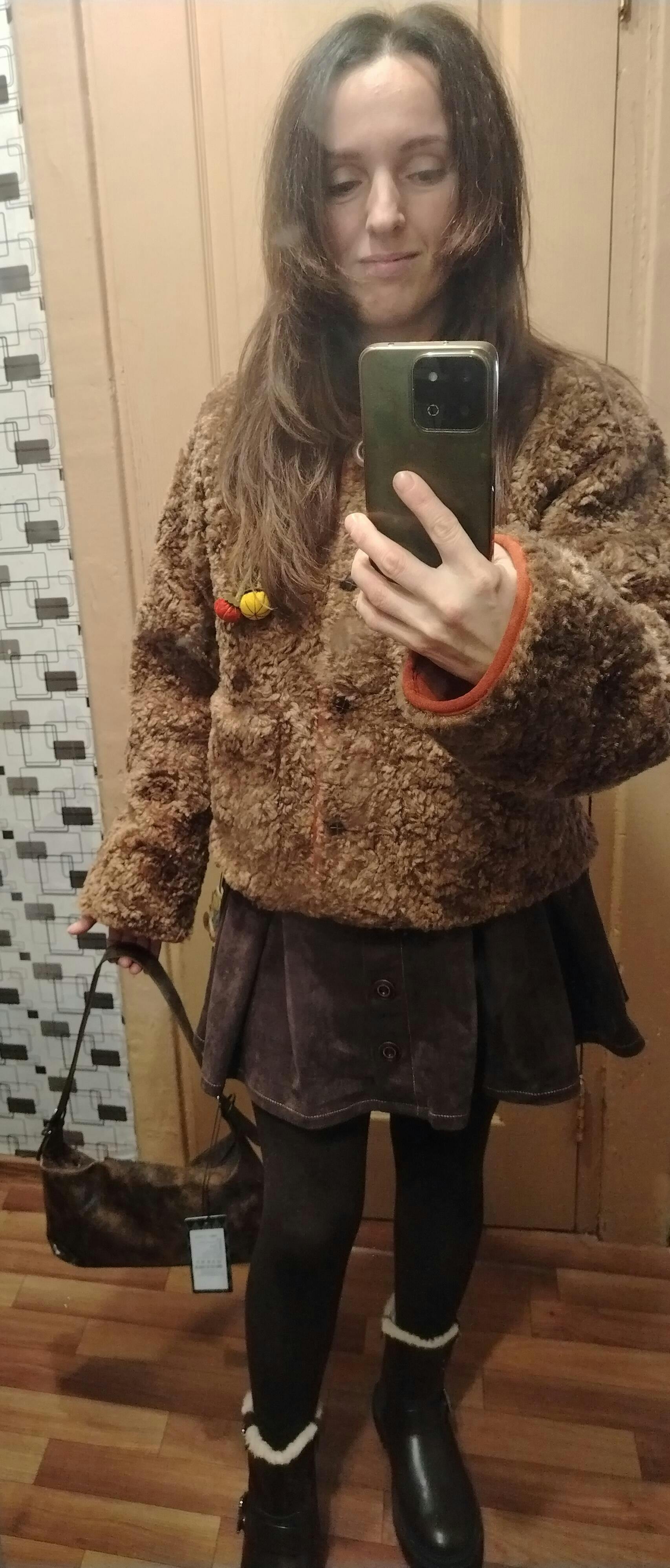 ELFSACK women's faux shearling pumpkin jacket paired with a stylish skirt and knee-high boots