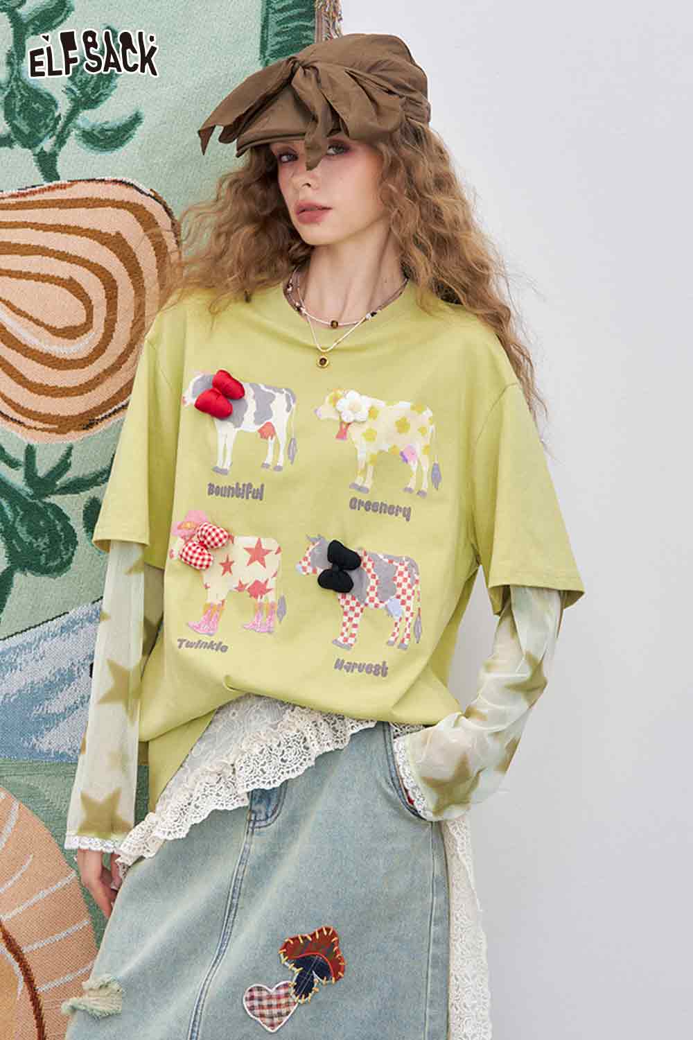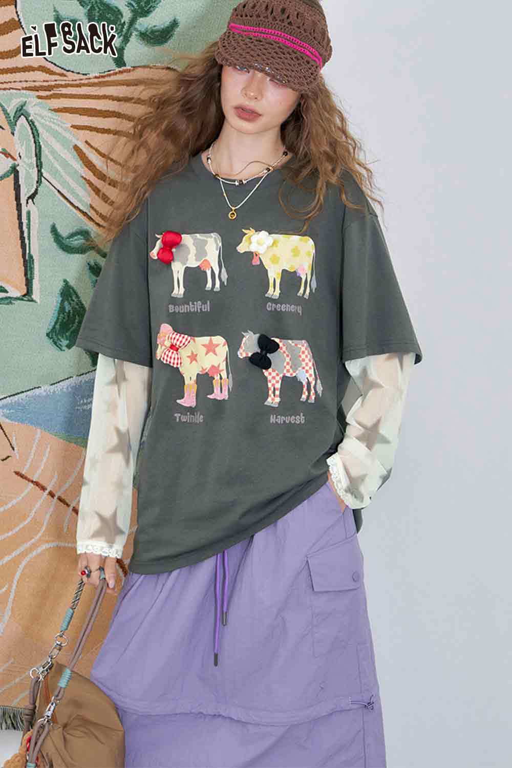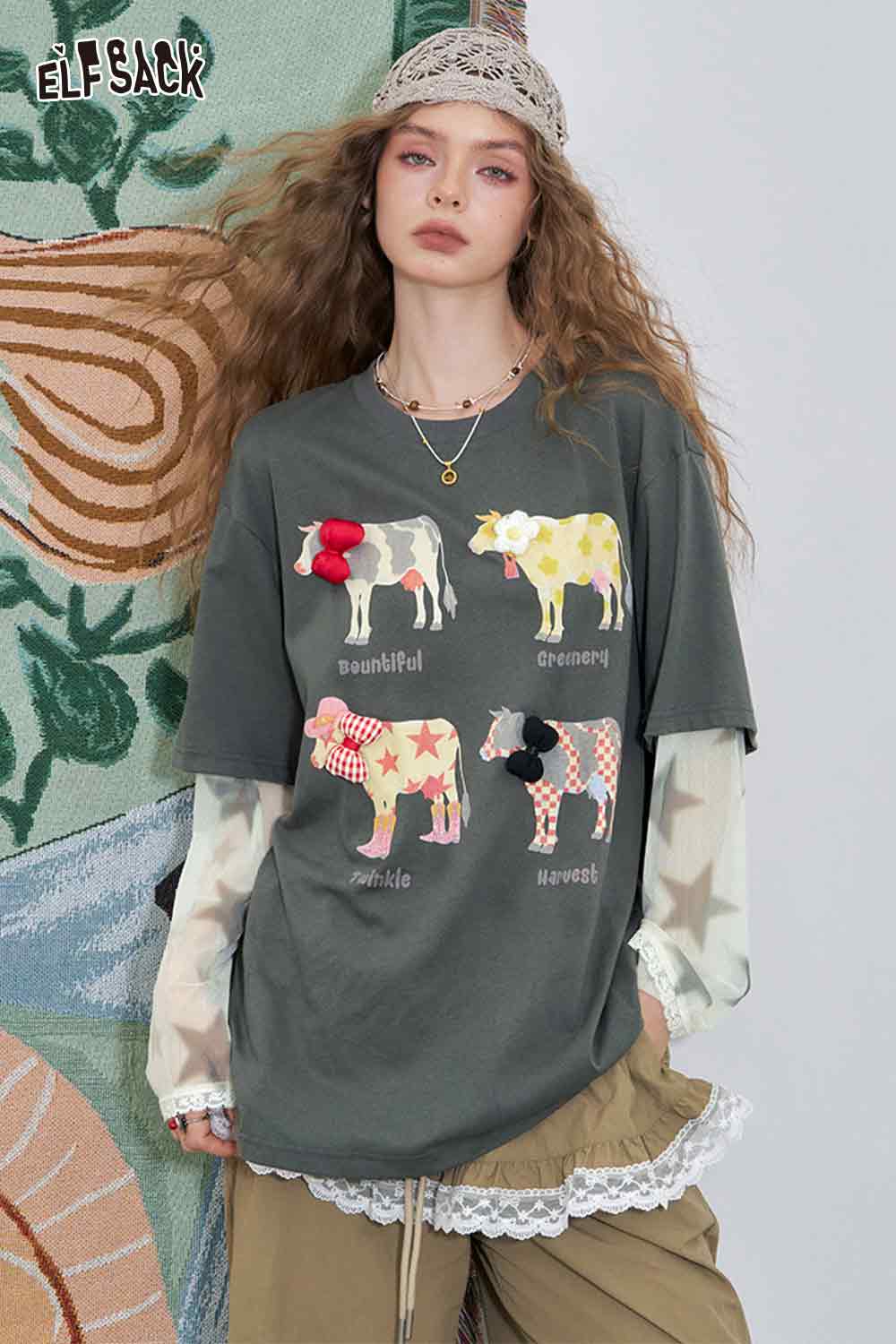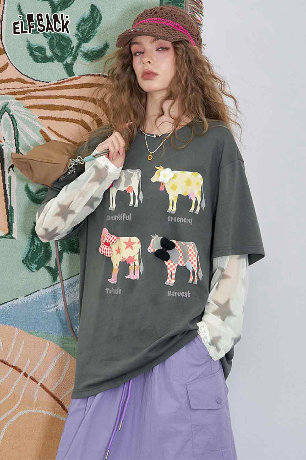 Mesh Splicing Loose Printed Long Sleeve T-Shirt