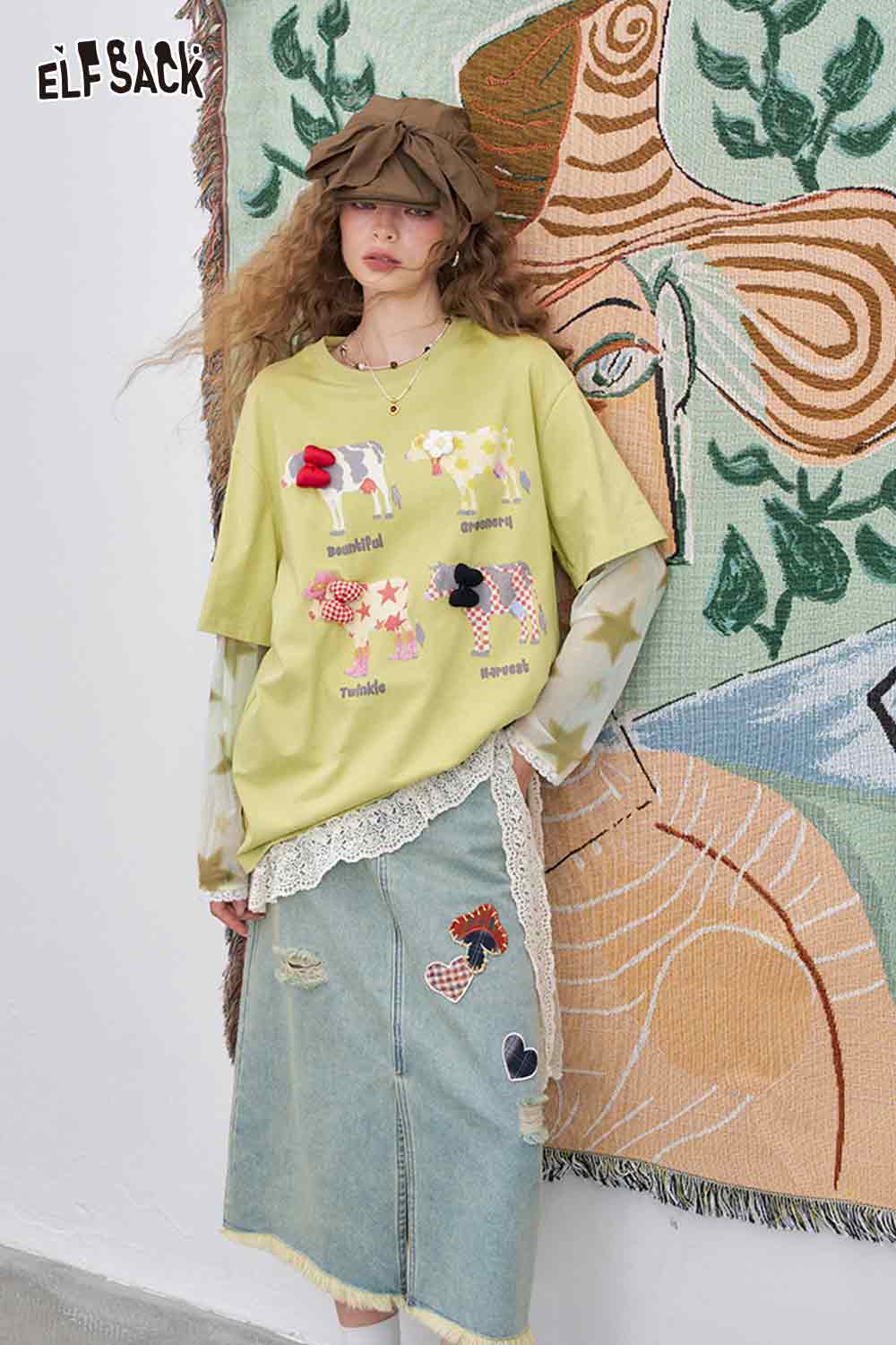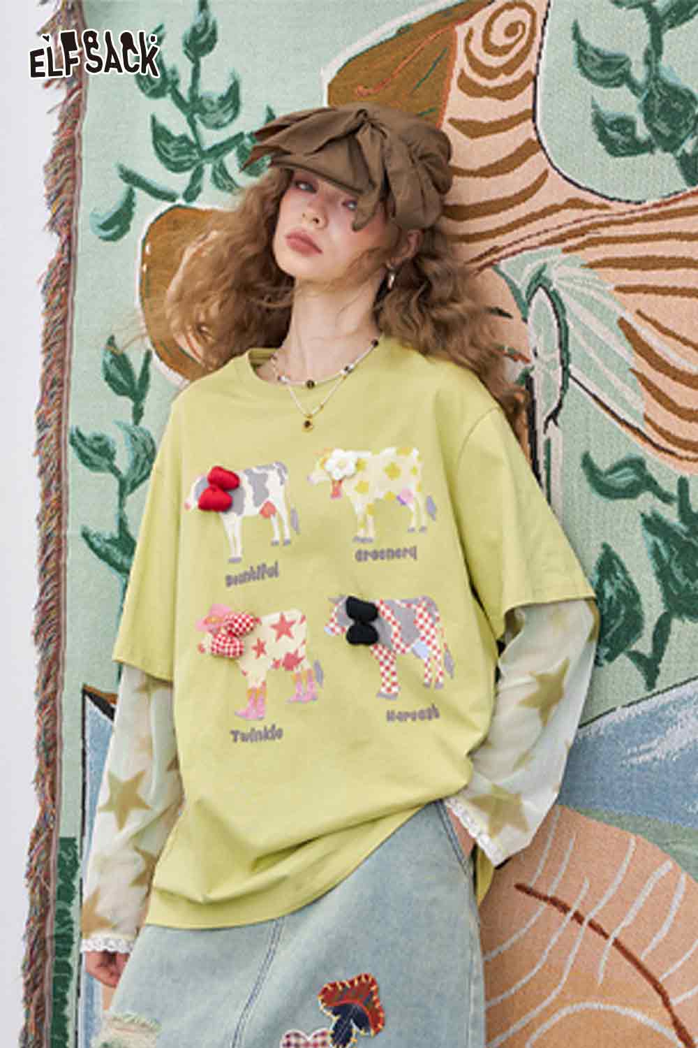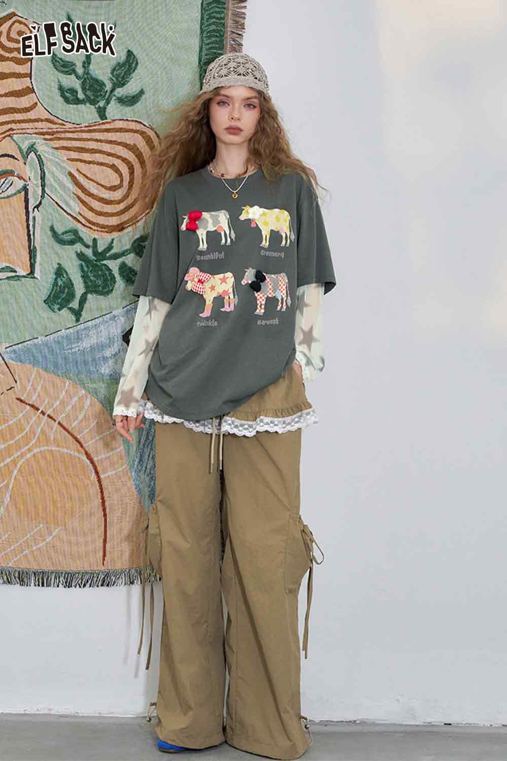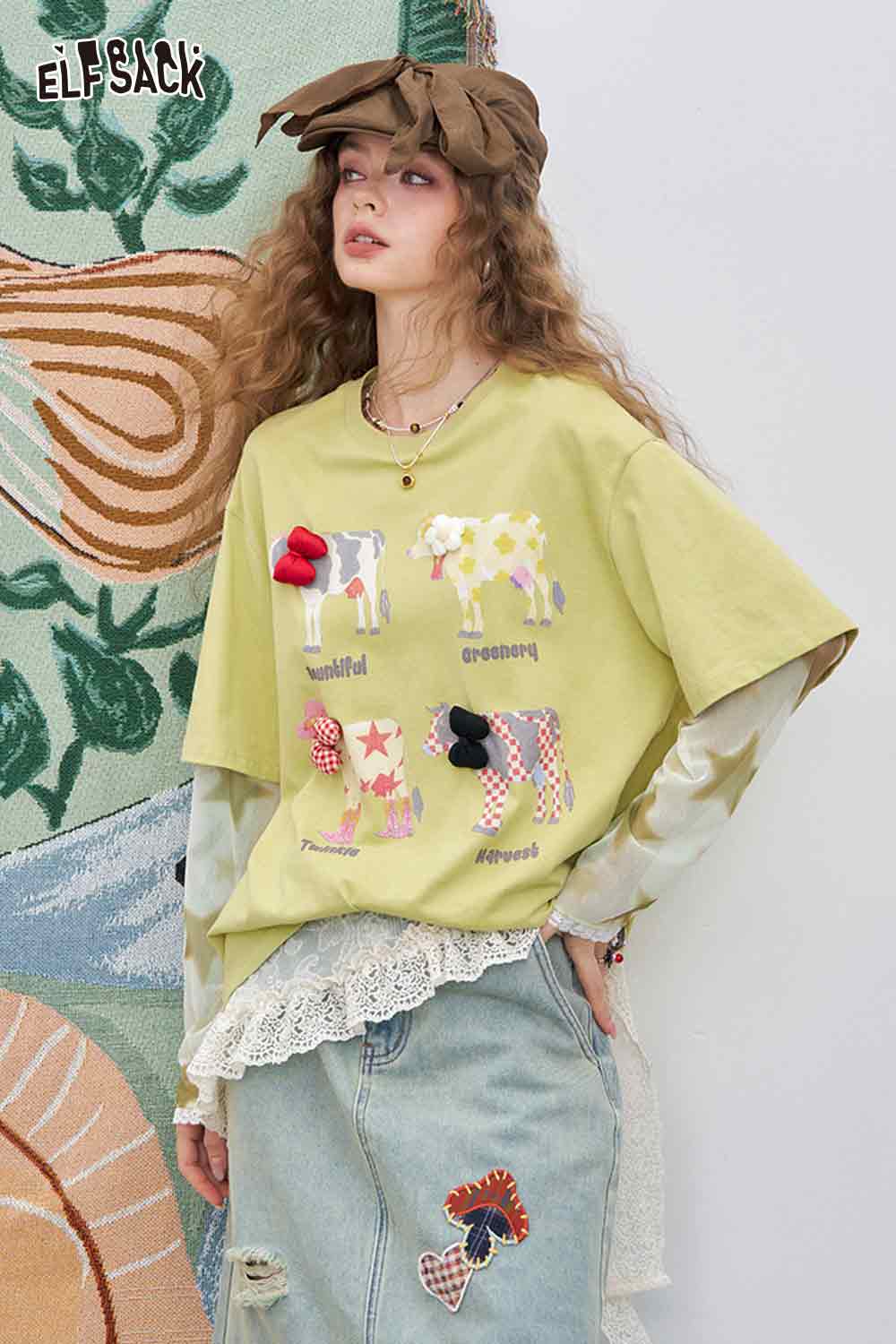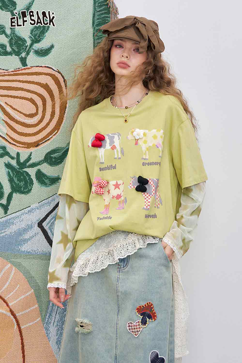 Mesh Splicing Loose Printed Long Sleeve T-Shirt