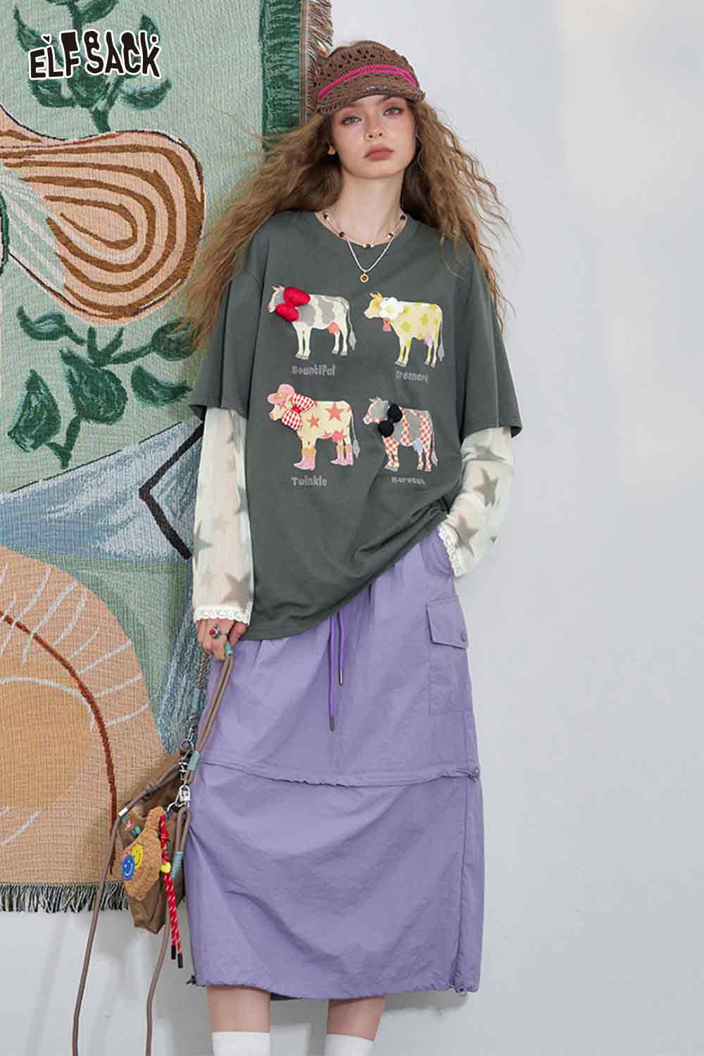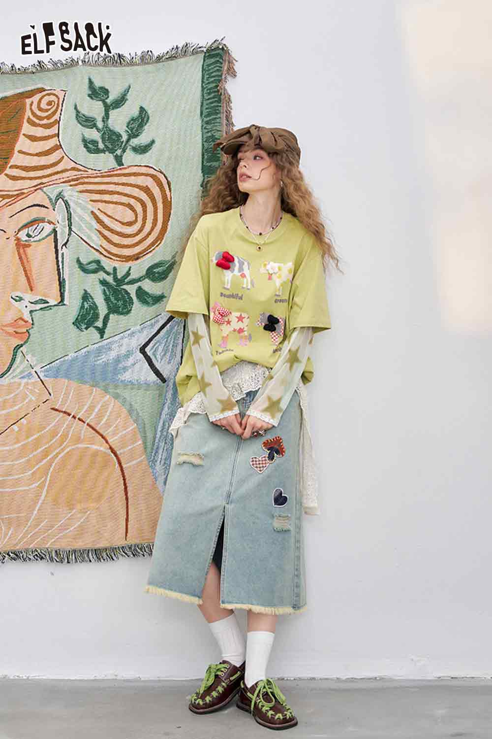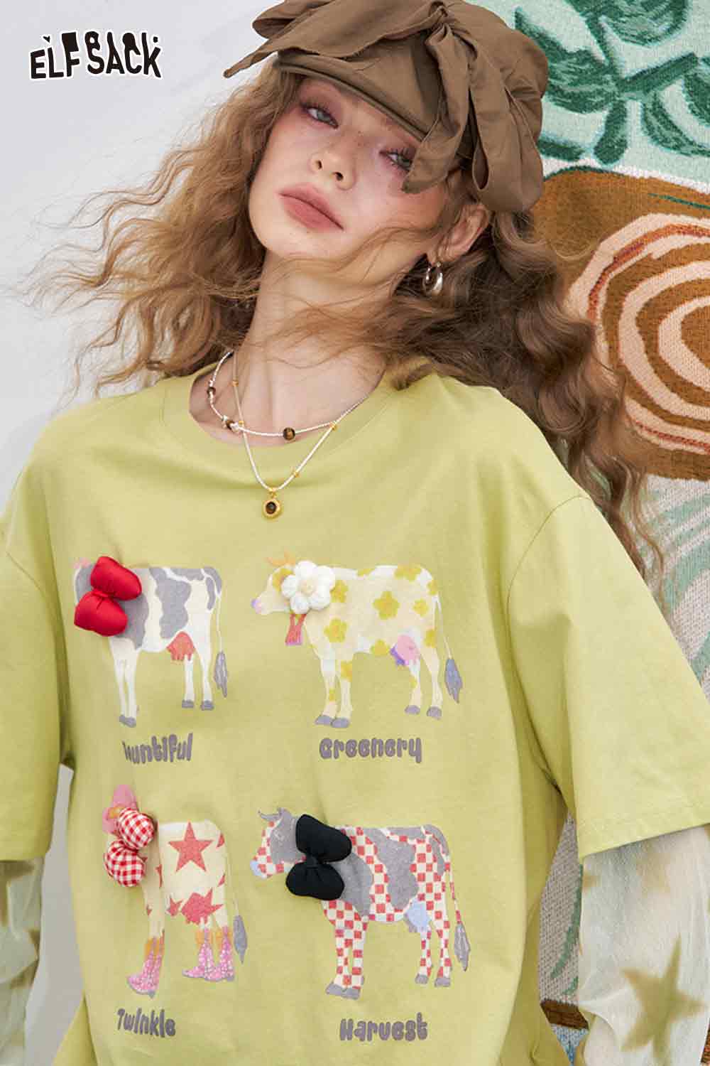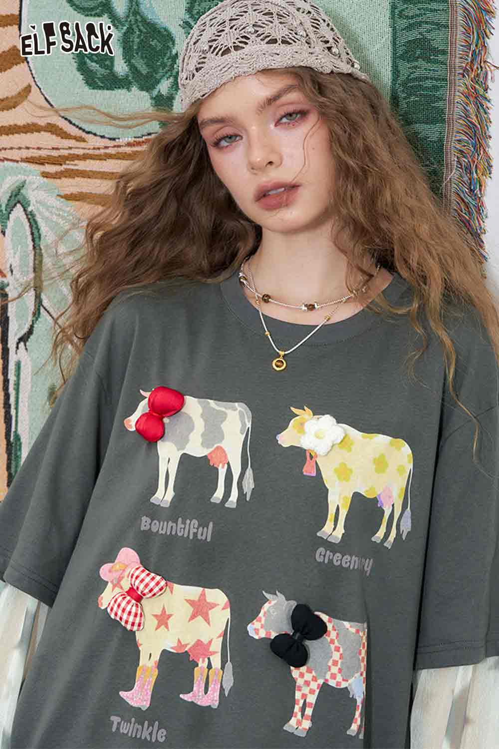 Mesh Splicing Loose Printed Long Sleeve T-Shirt