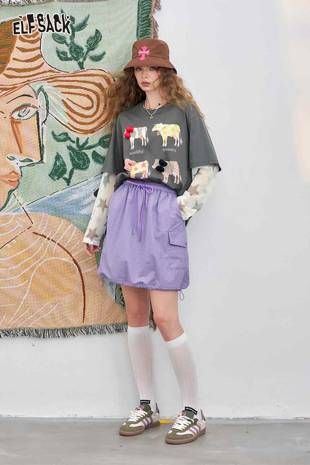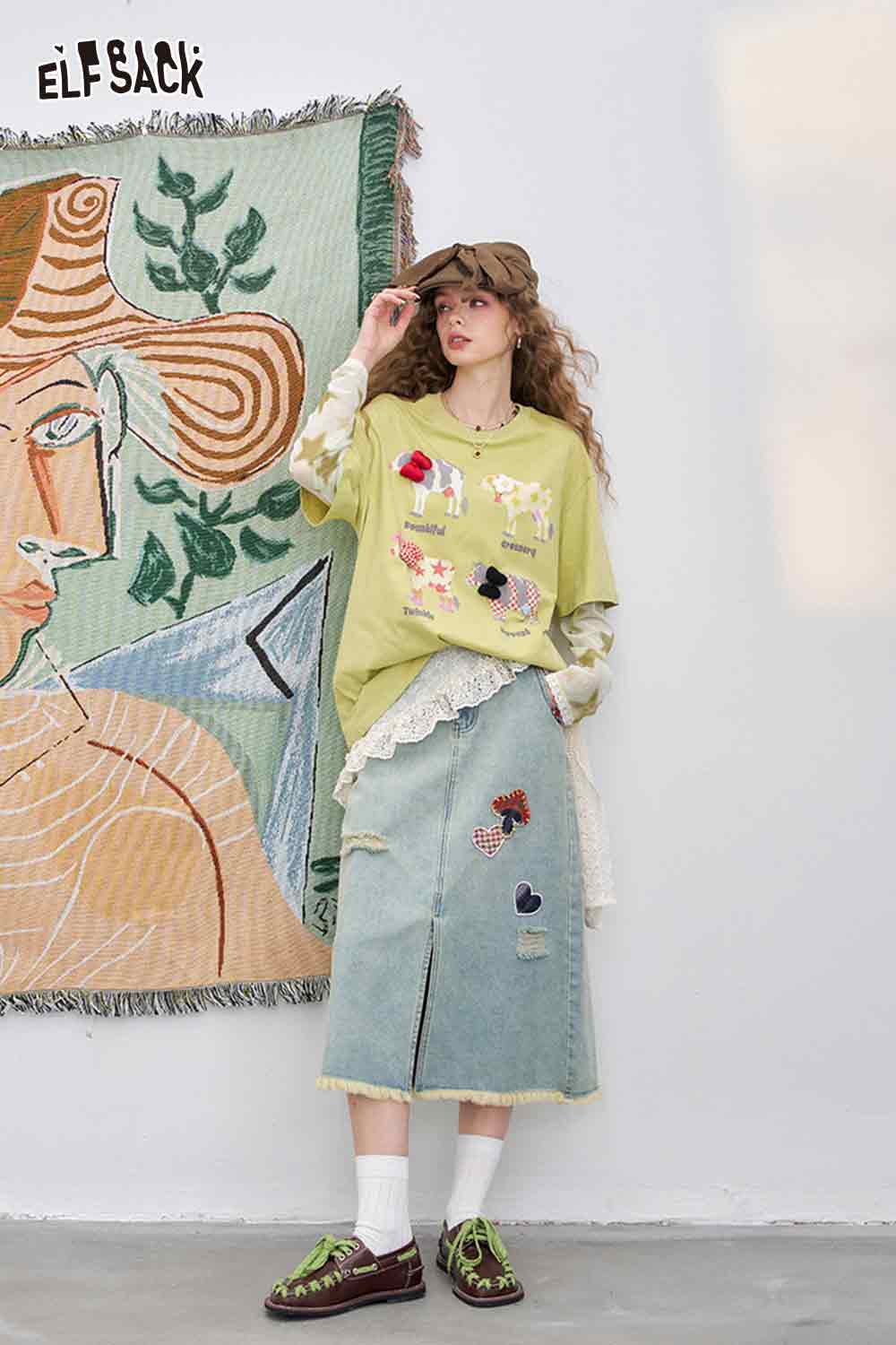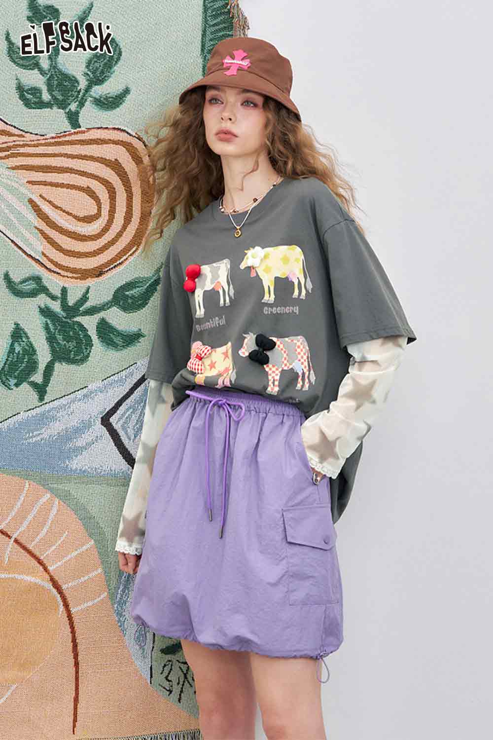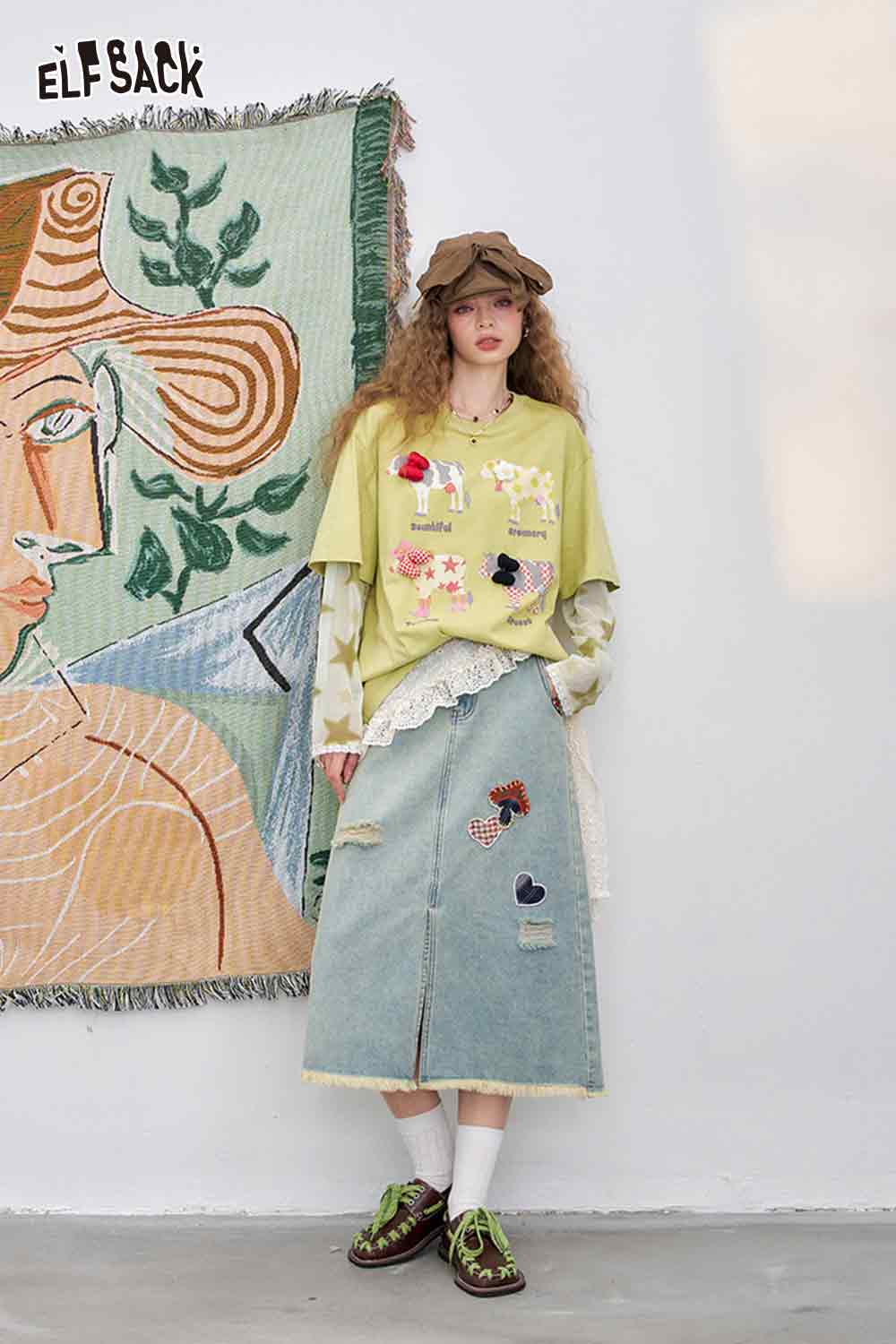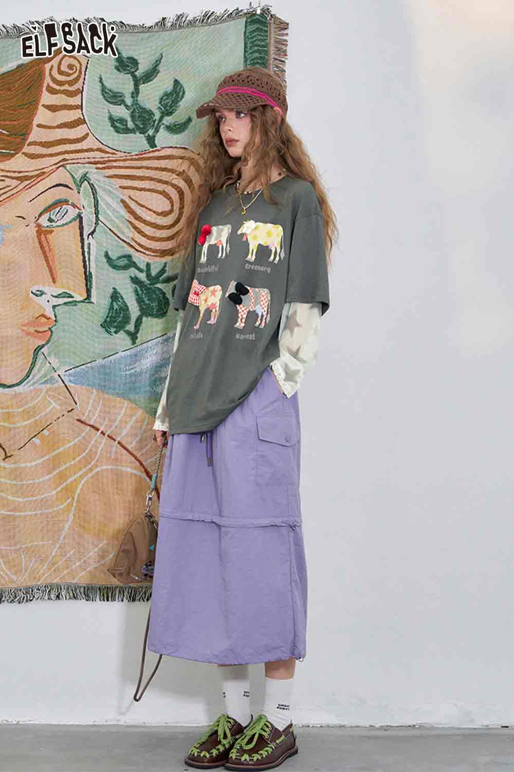 Mesh Splicing Loose Printed Long Sleeve T-Shirt