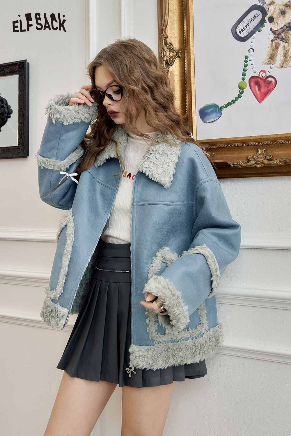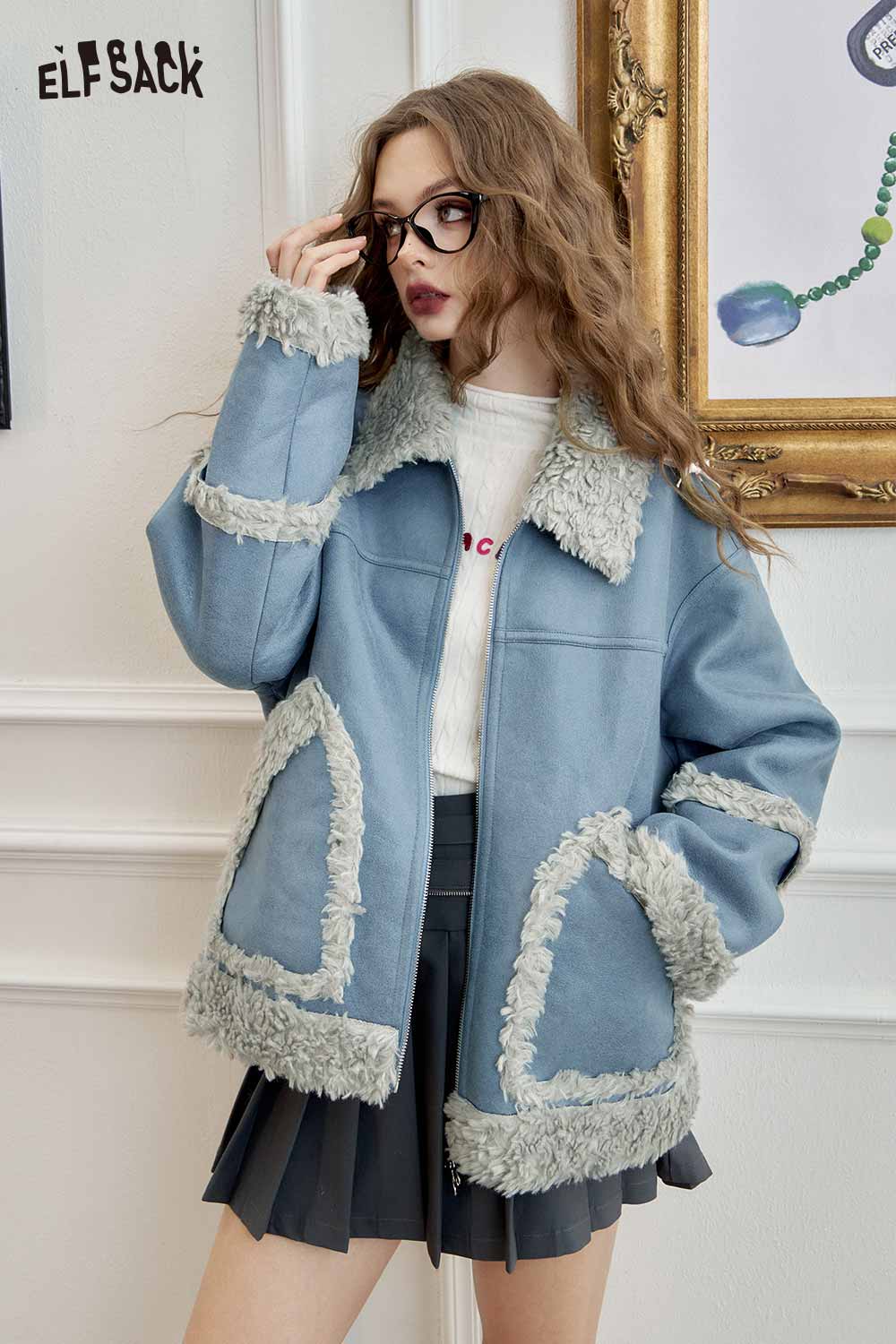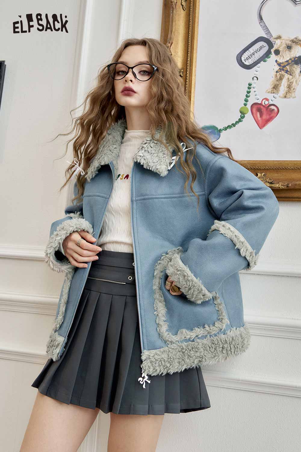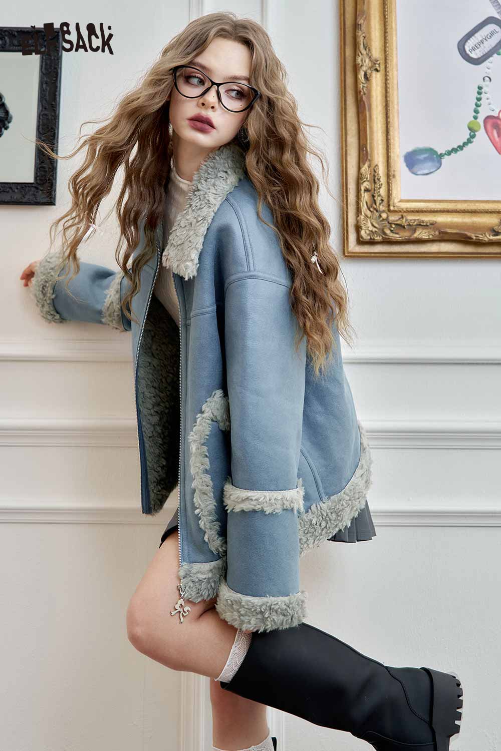 Soft Preppy Blue Faux Shearling Suede Short Coat