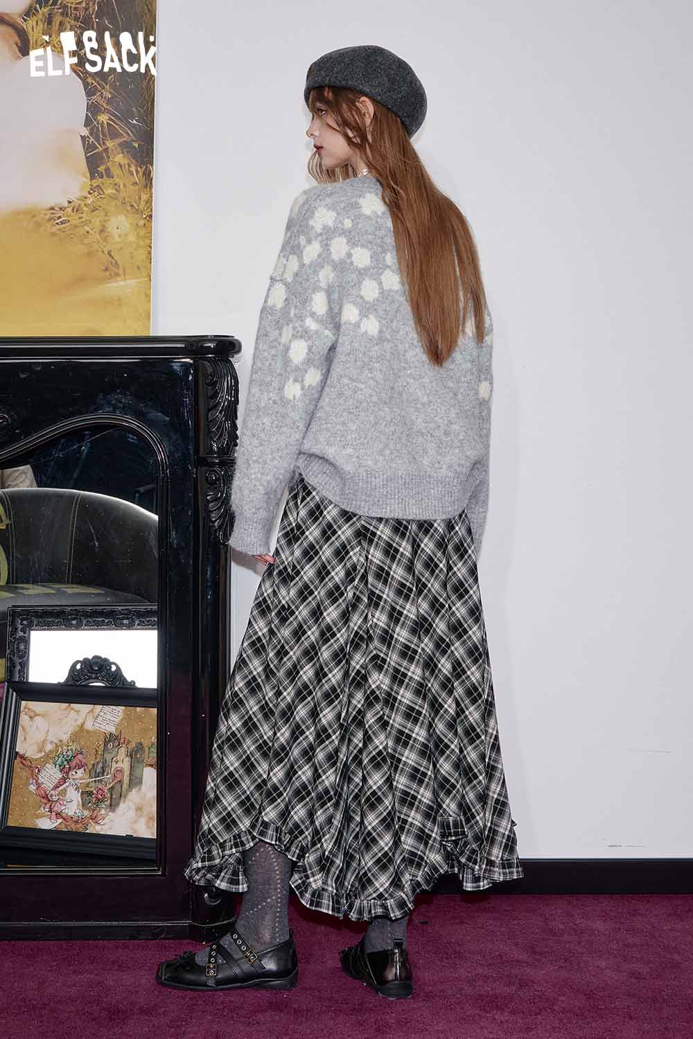 Wool Blend Checkered Pattern Draped Waist Asymmetric Hem Skirt