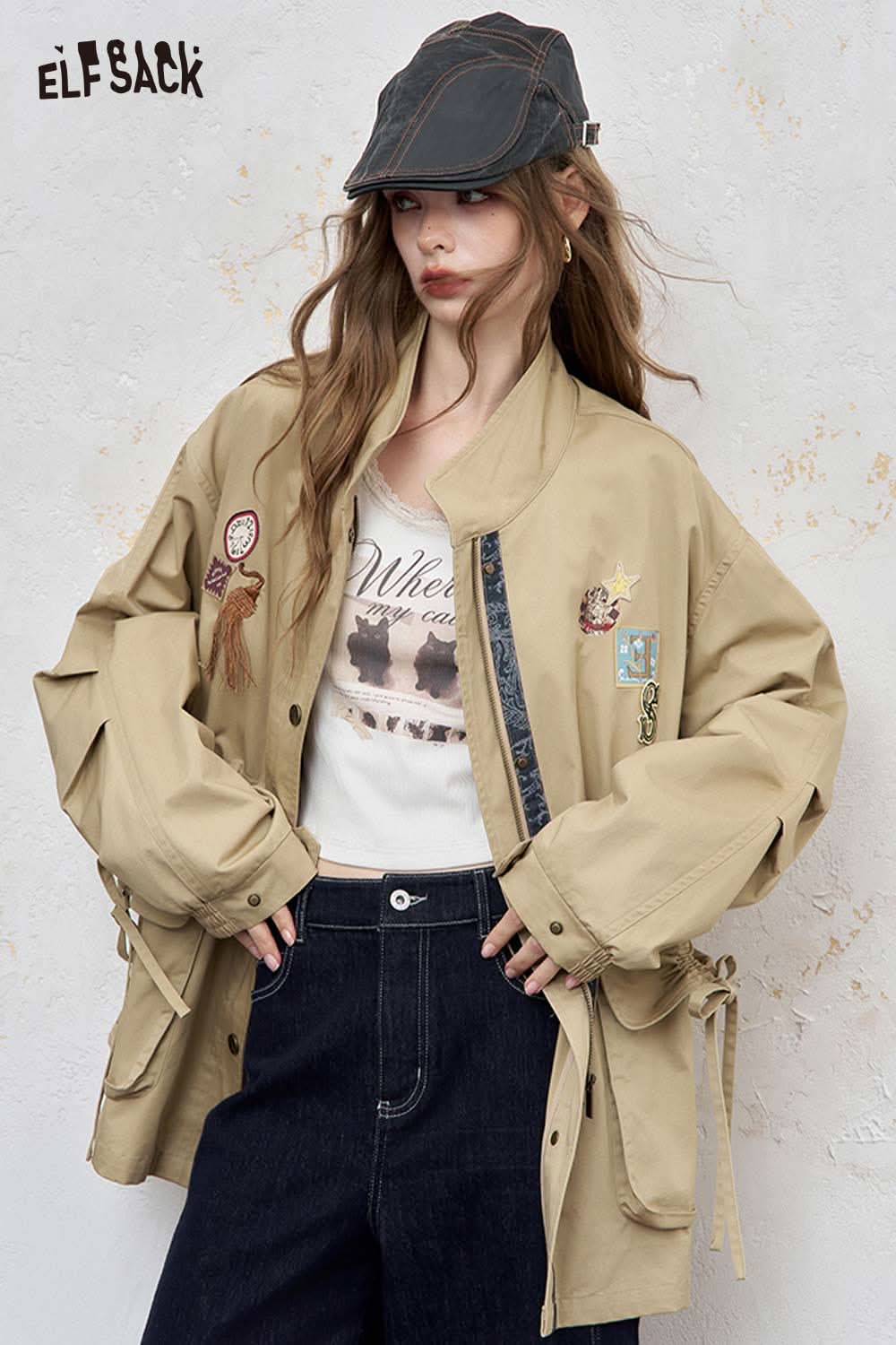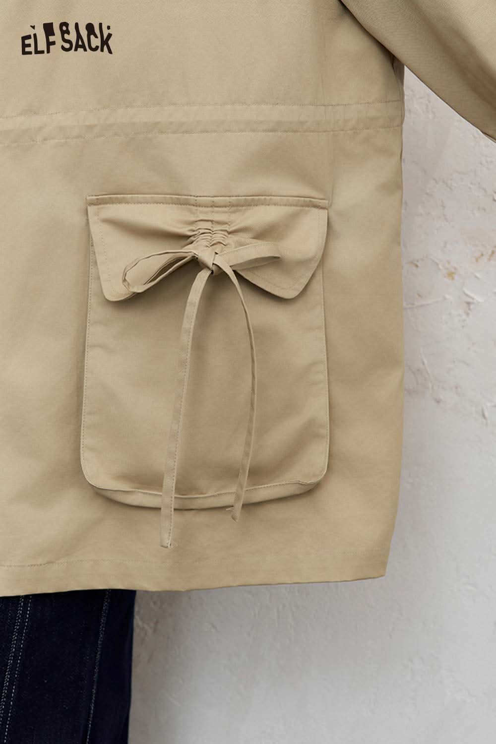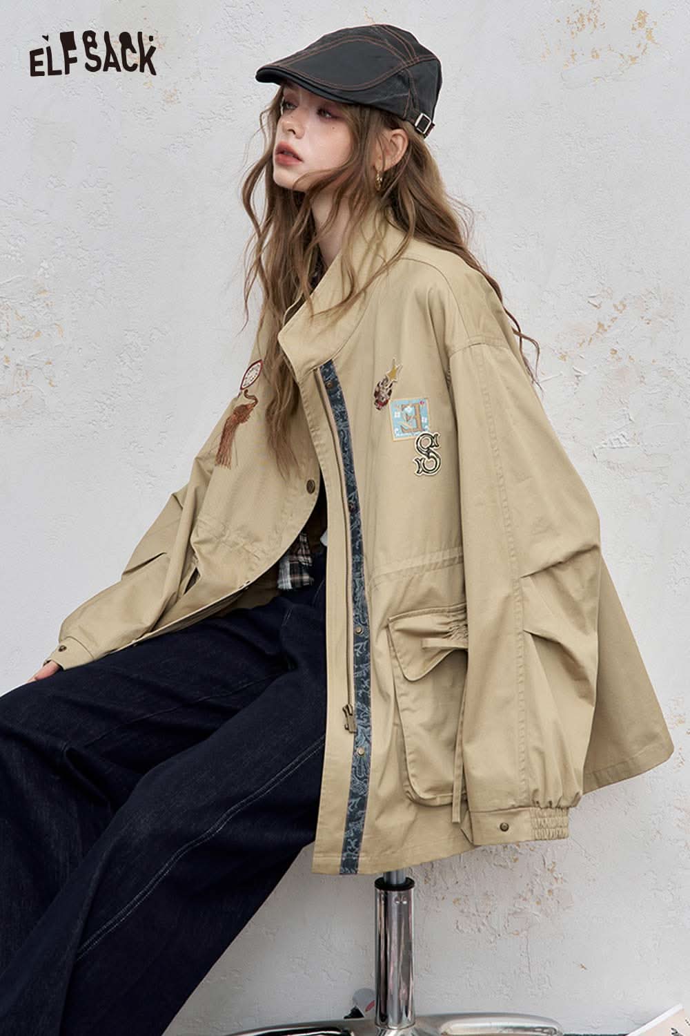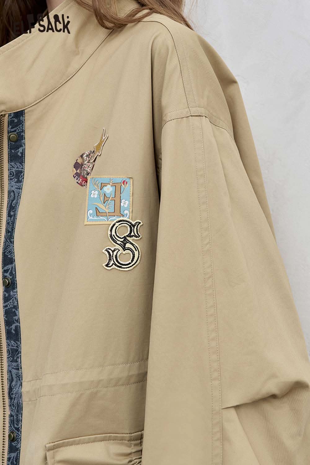 Cotton Patchwork Stand-Up Collar Streetwear Trench Coat