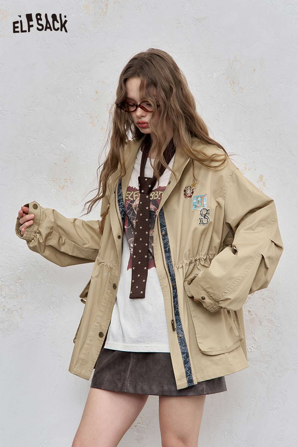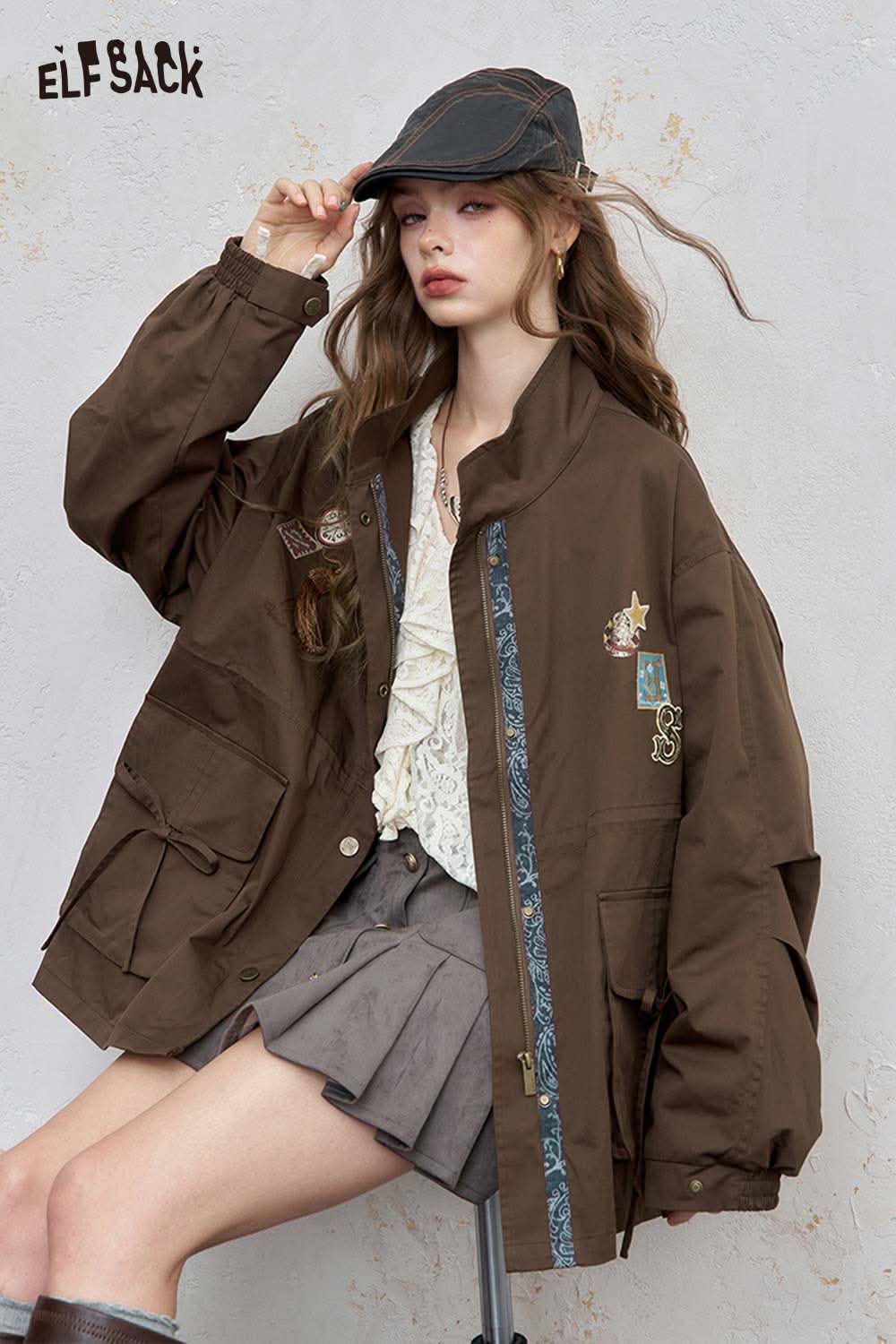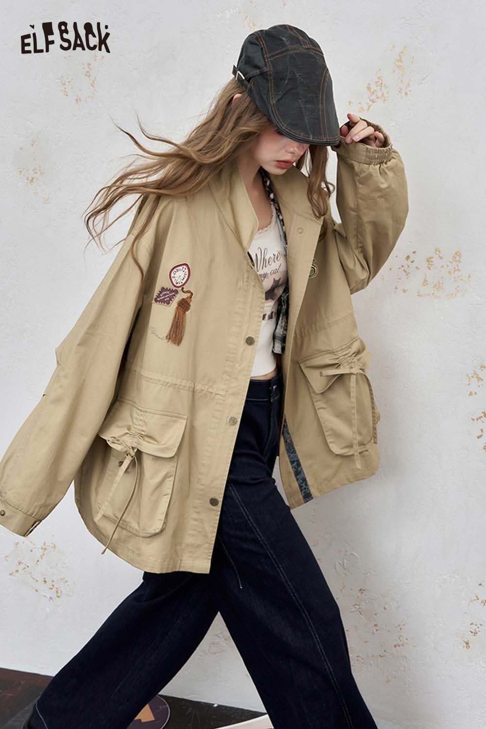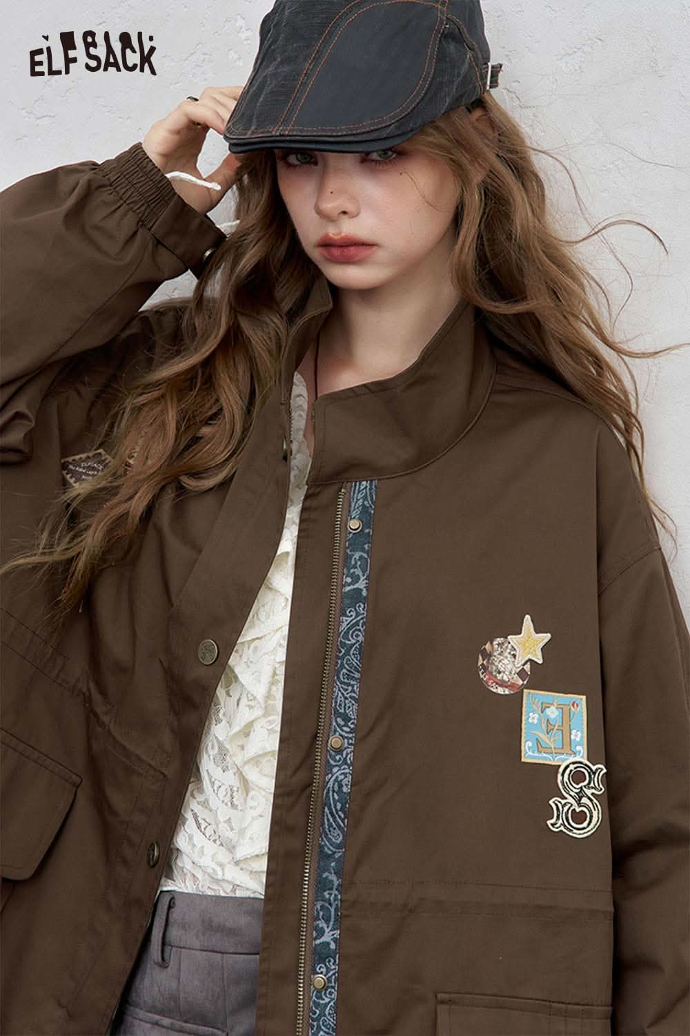 Cotton Patchwork Stand-Up Collar Streetwear Trench Coat