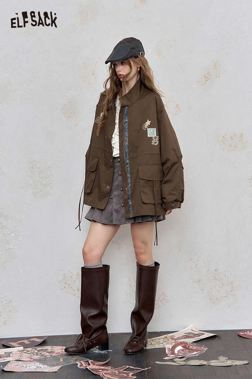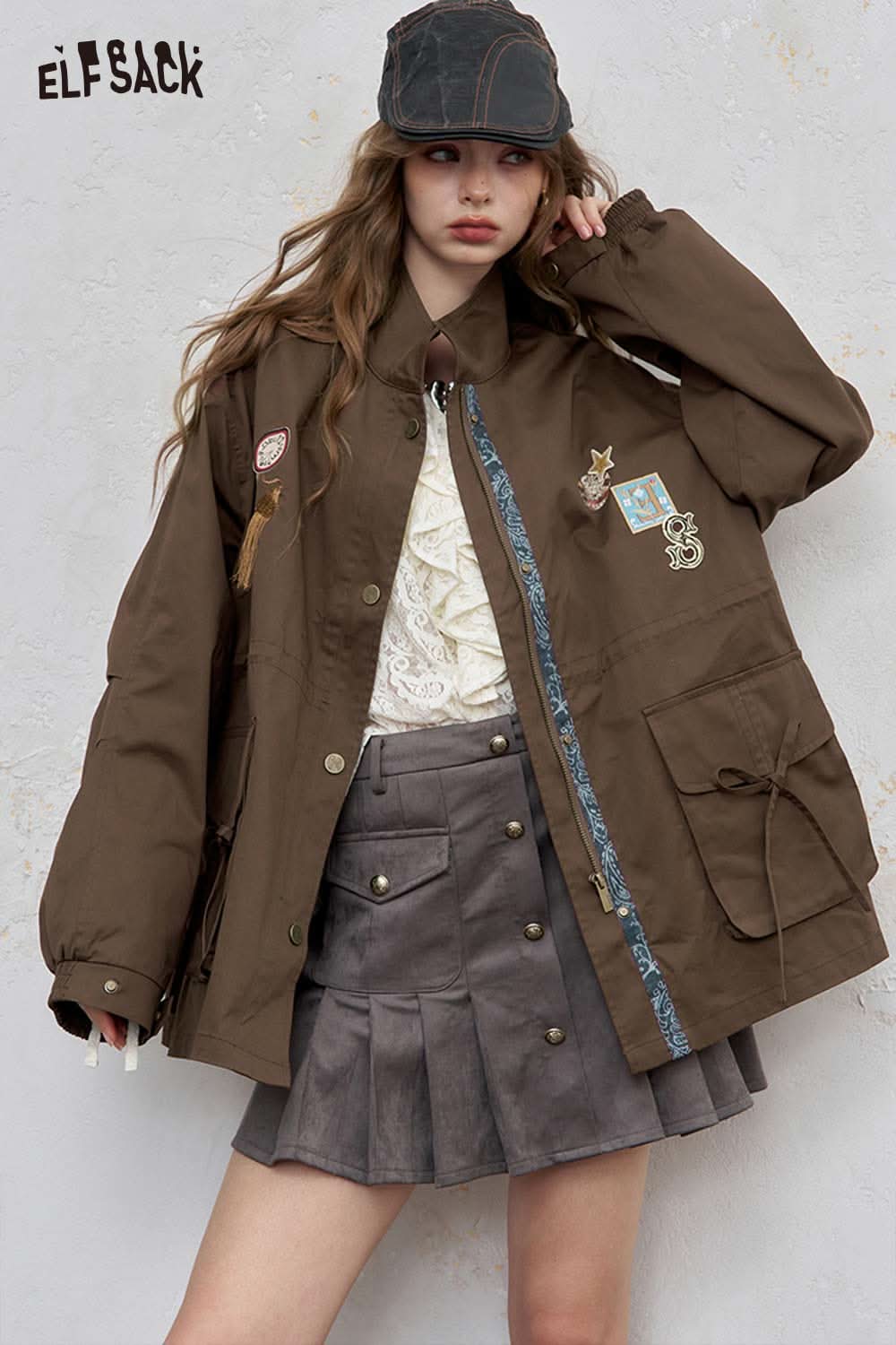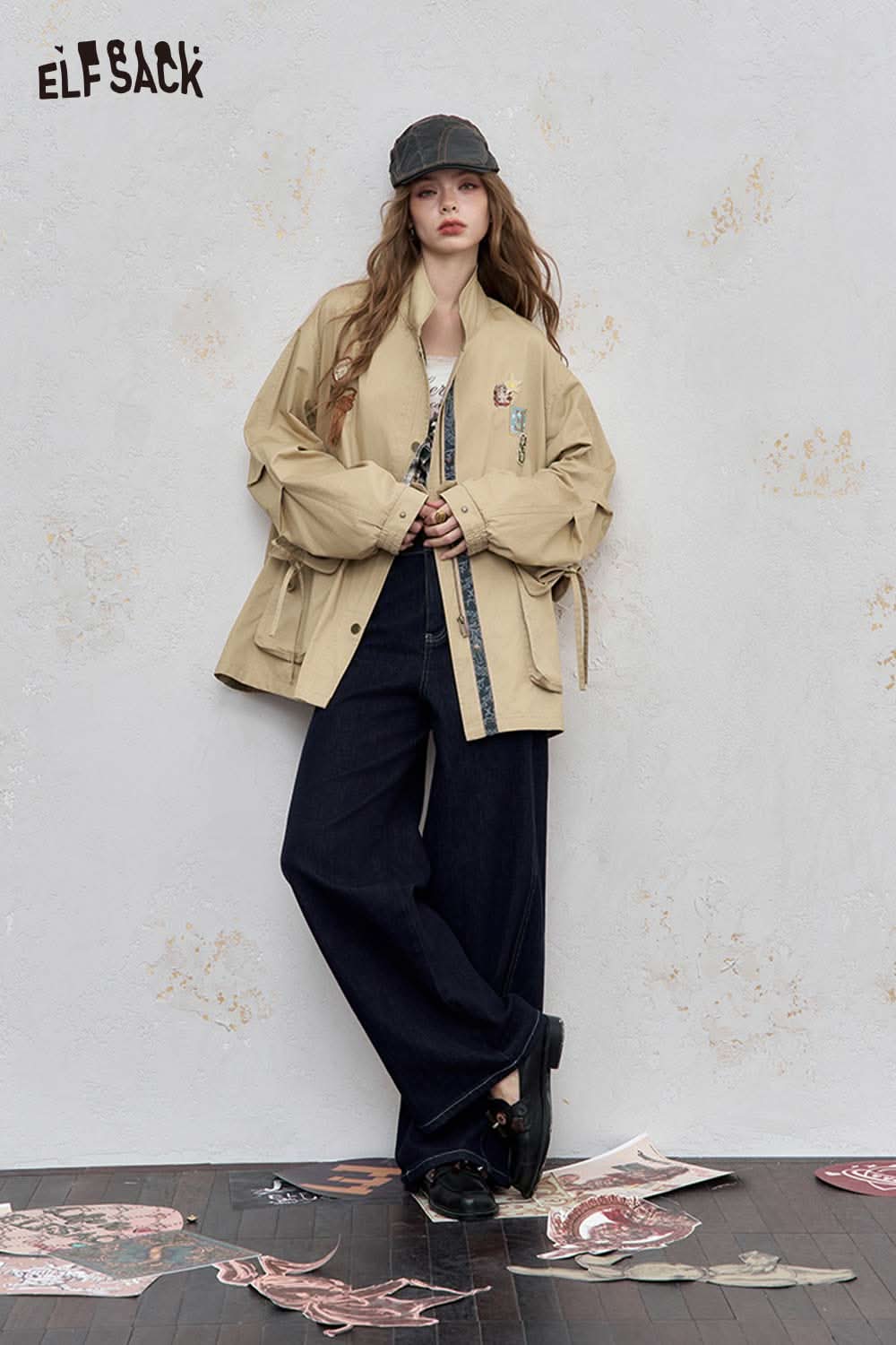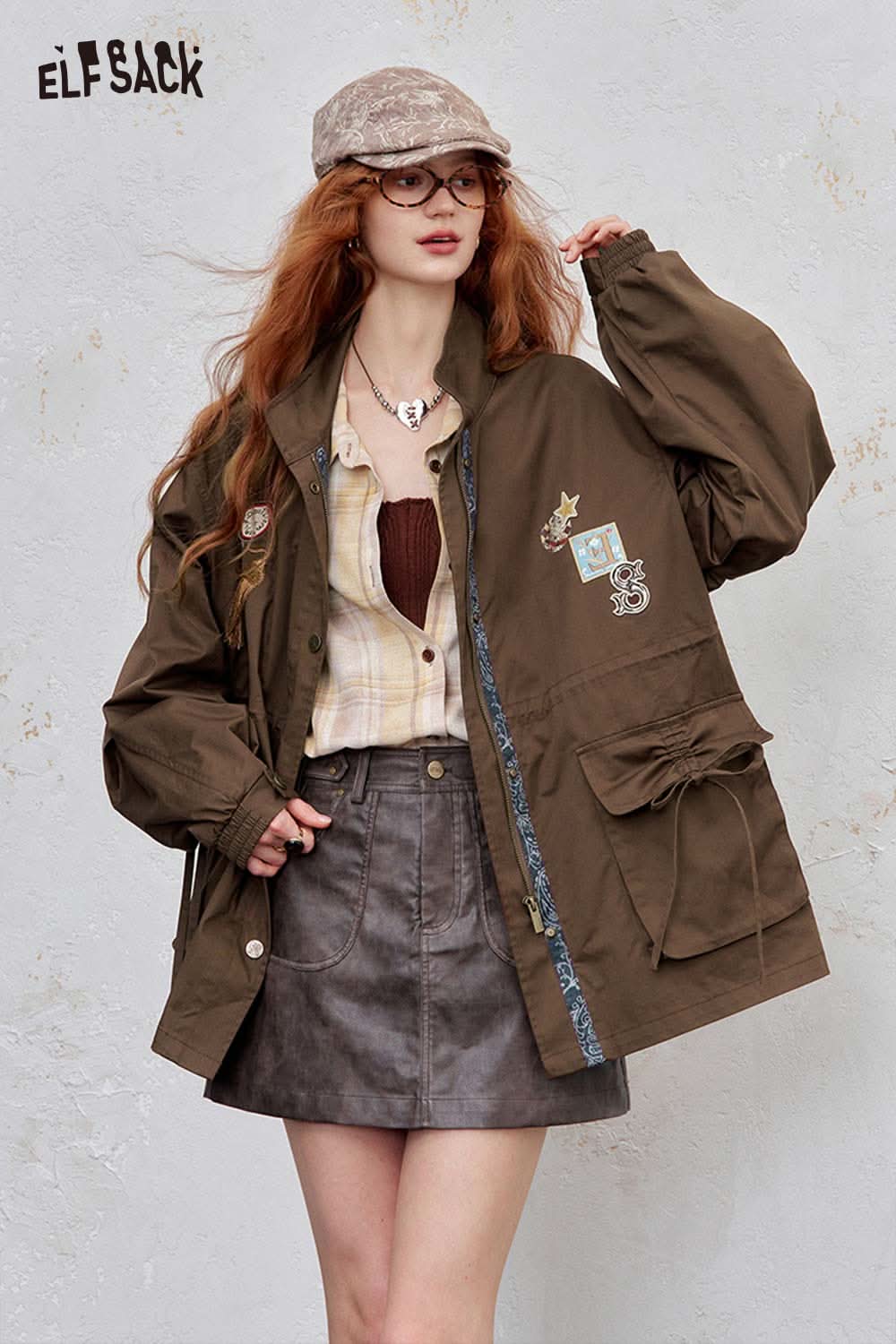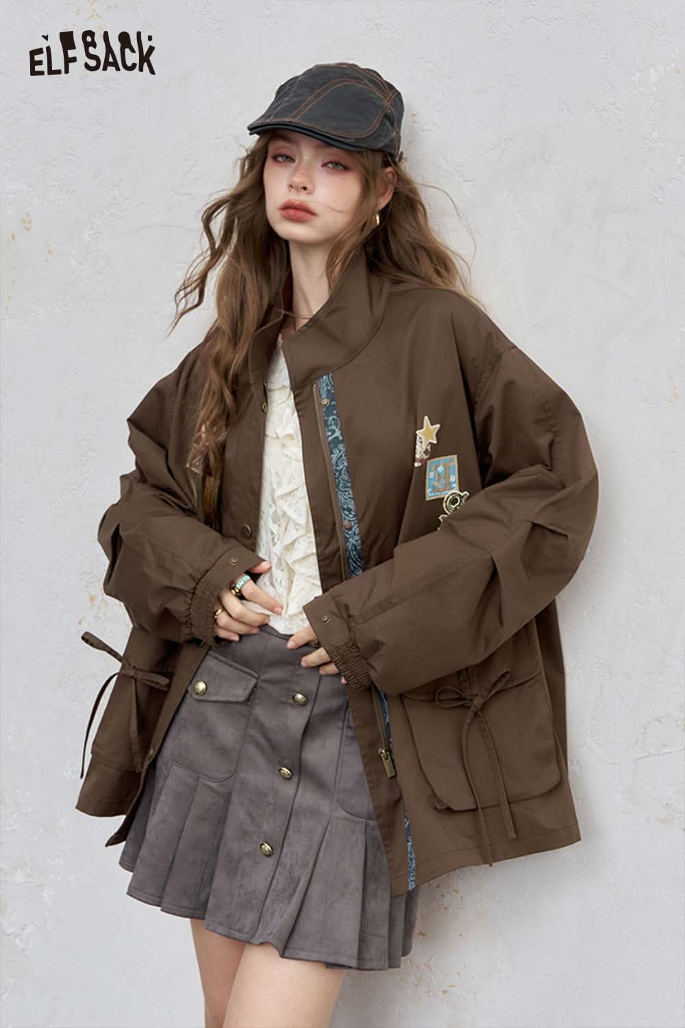 Cotton Patchwork Stand-Up Collar Streetwear Trench Coat