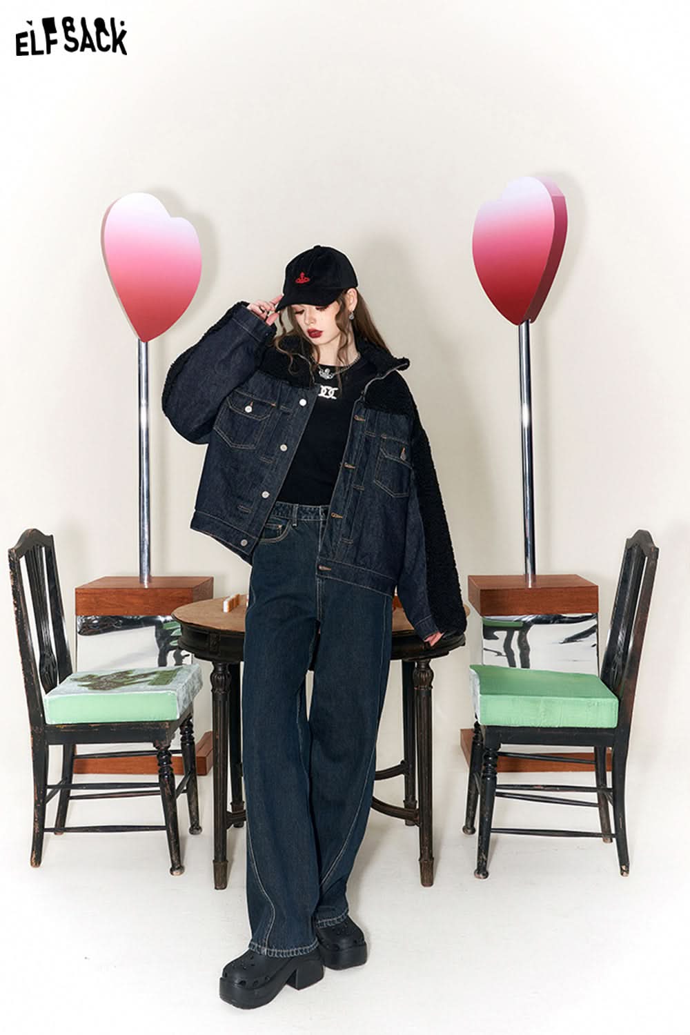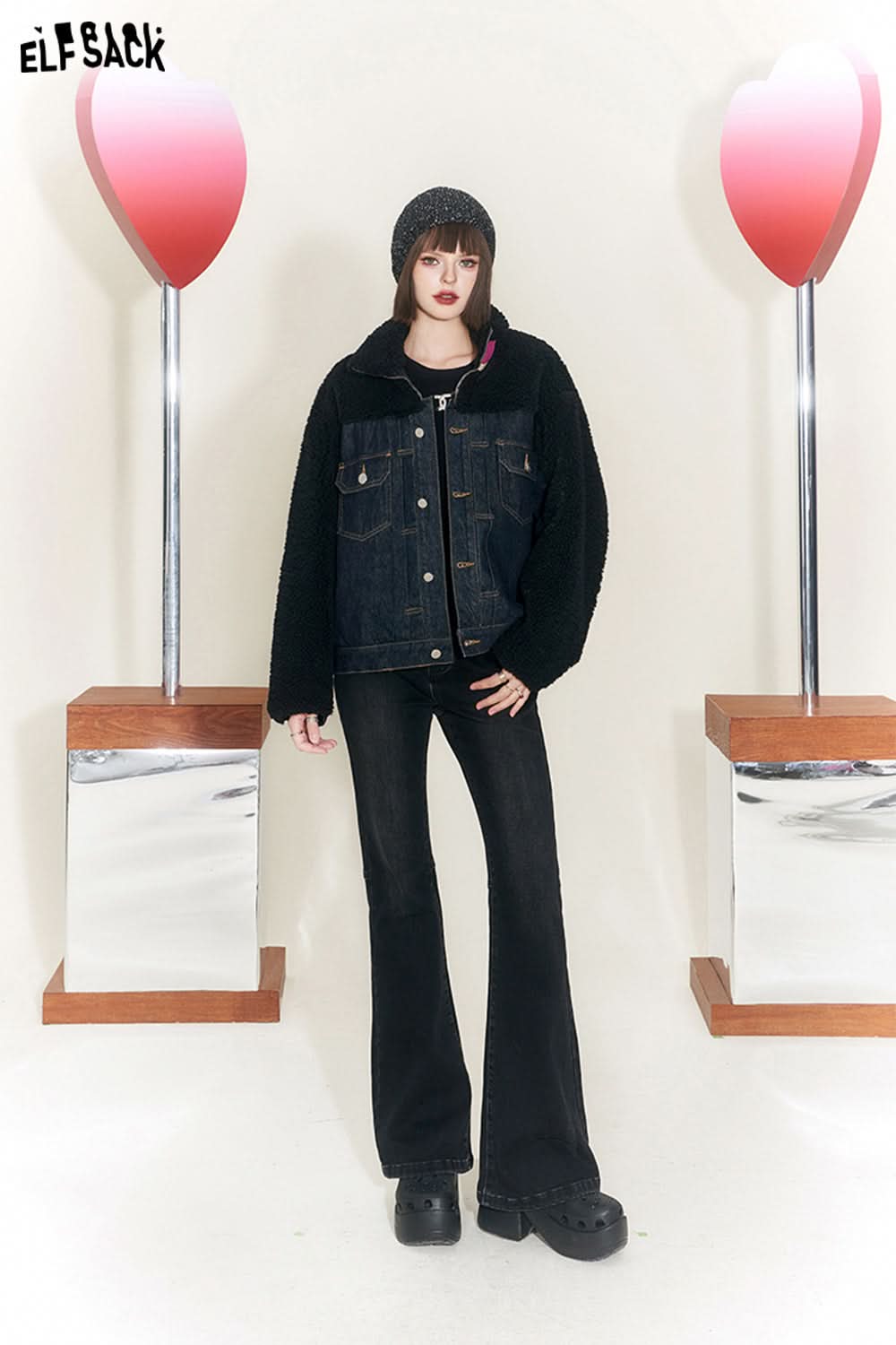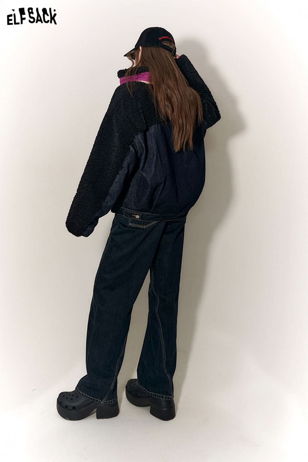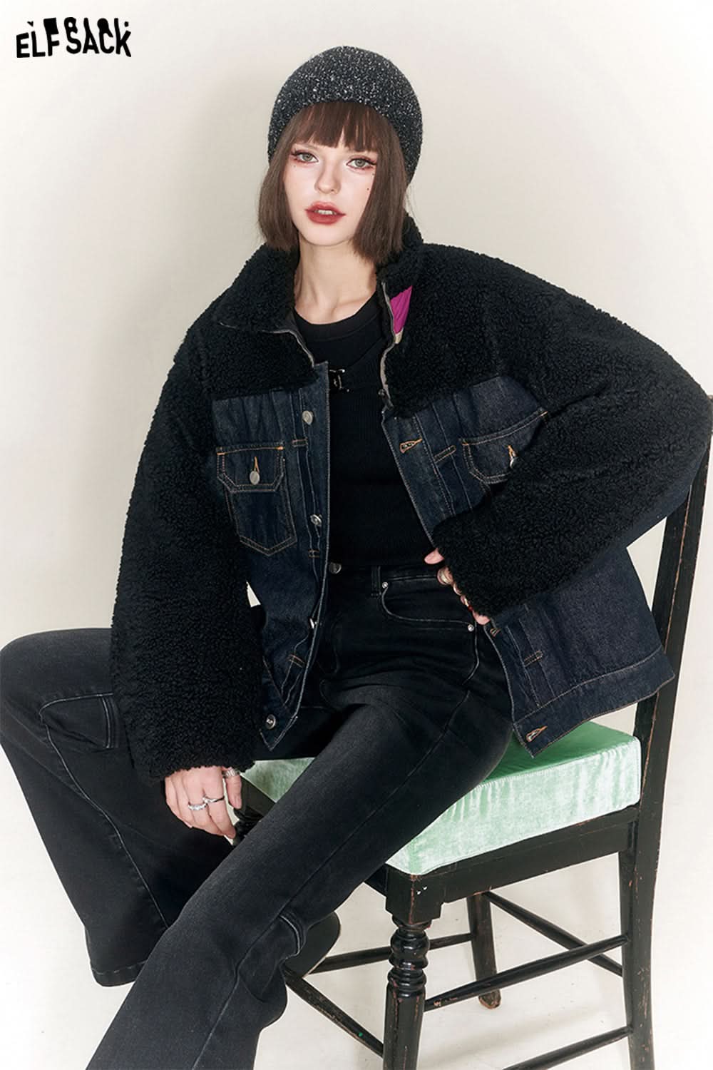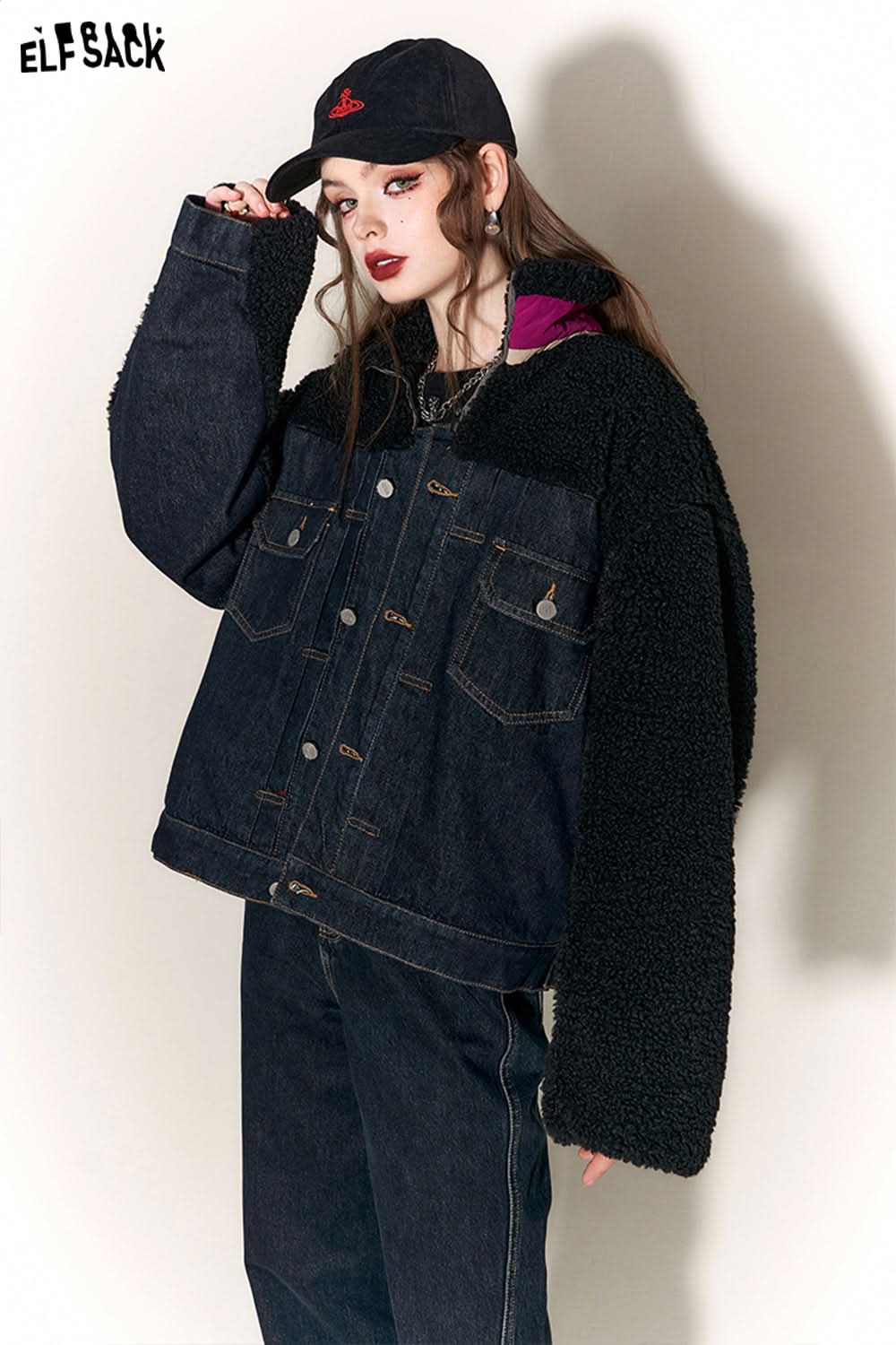 Denim Spliced Fleece Cotton Coats Women Luxuey Short Outwears