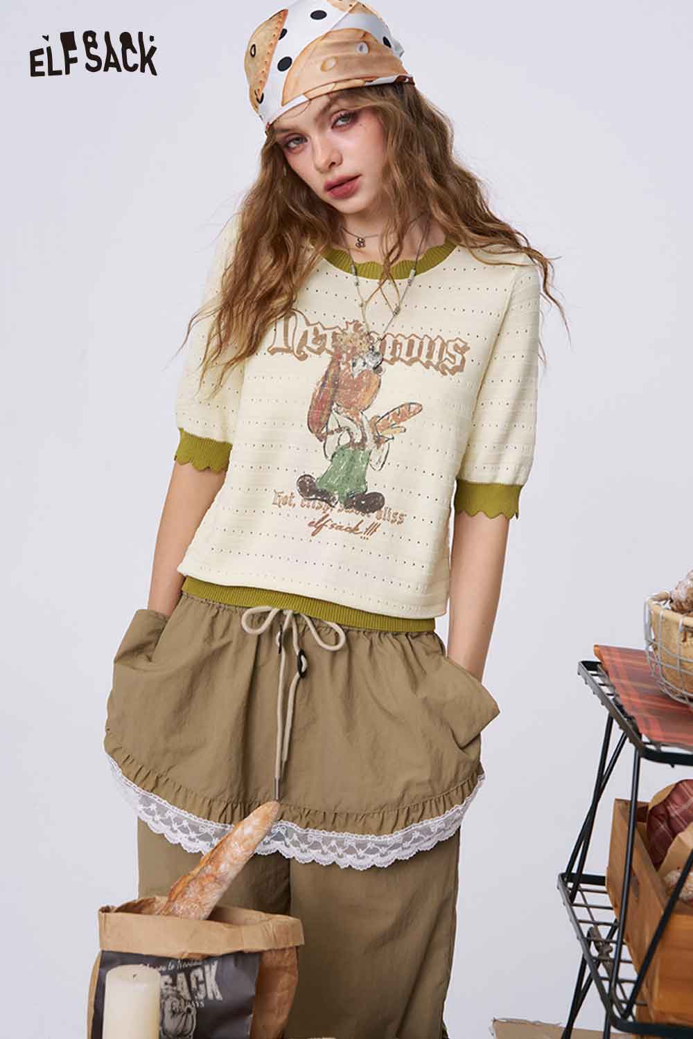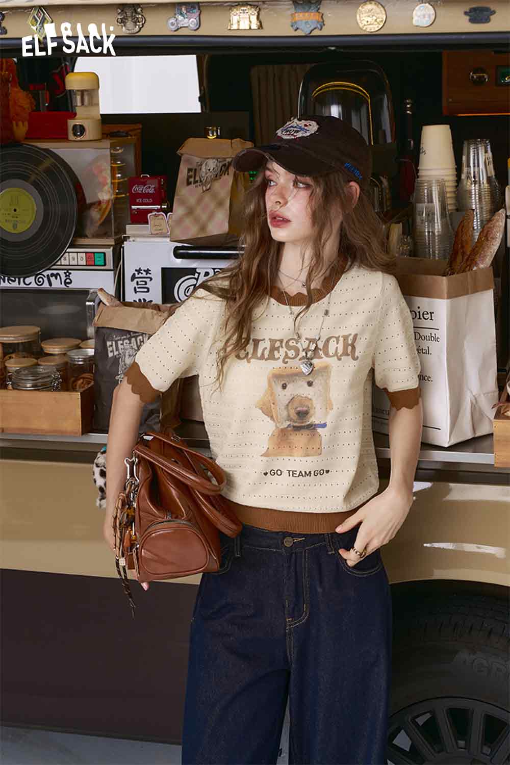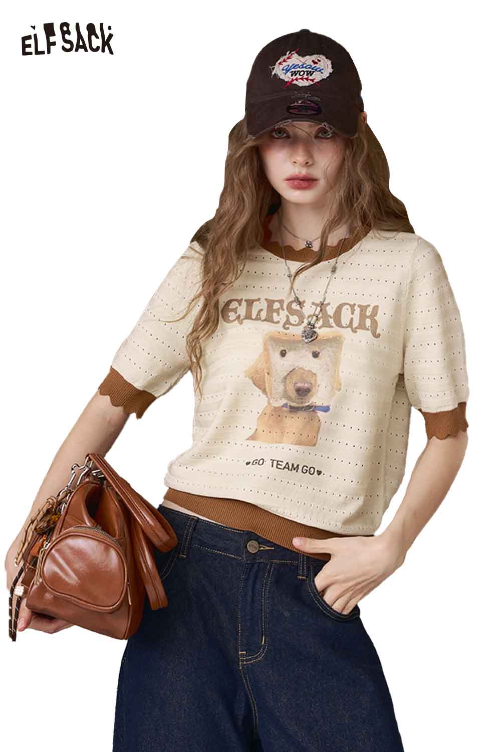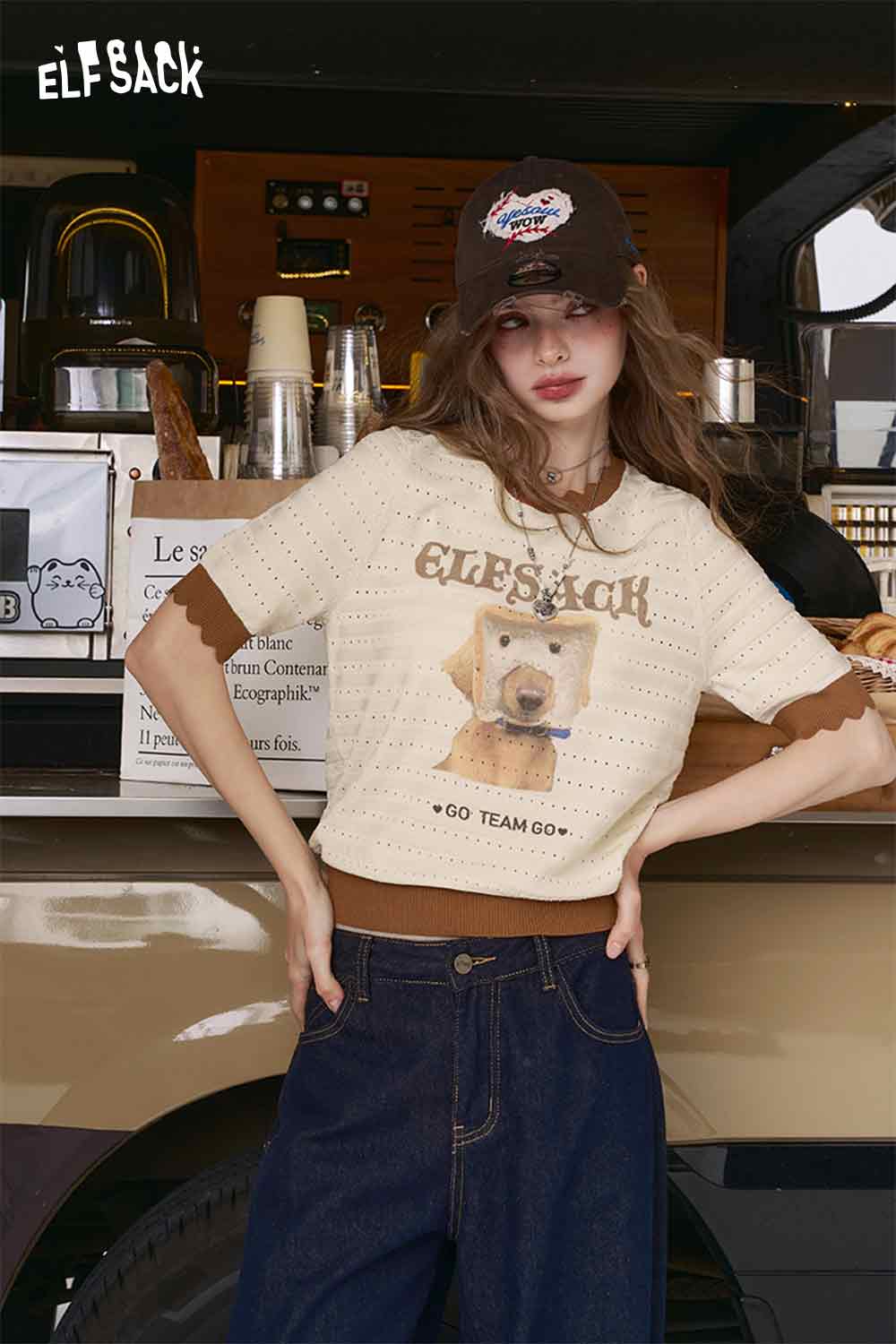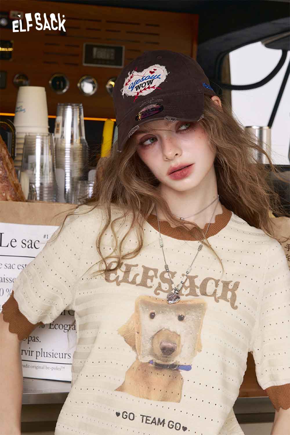 Color-blocked Bread Dog Print Short-Sleeve Knit Top for Women, Lightweight