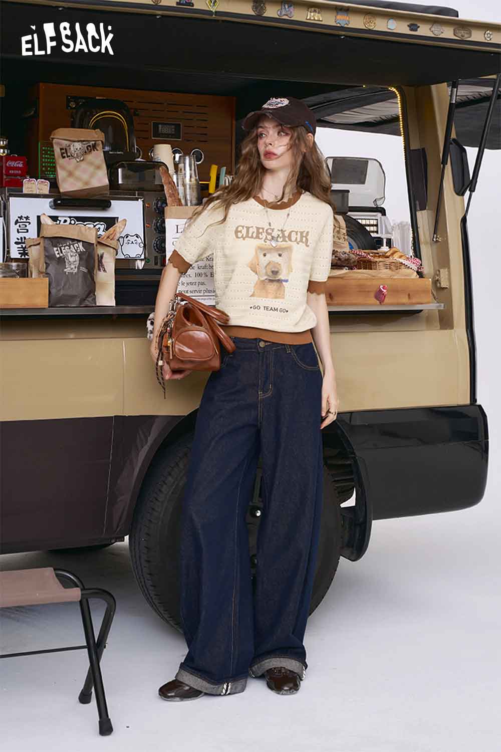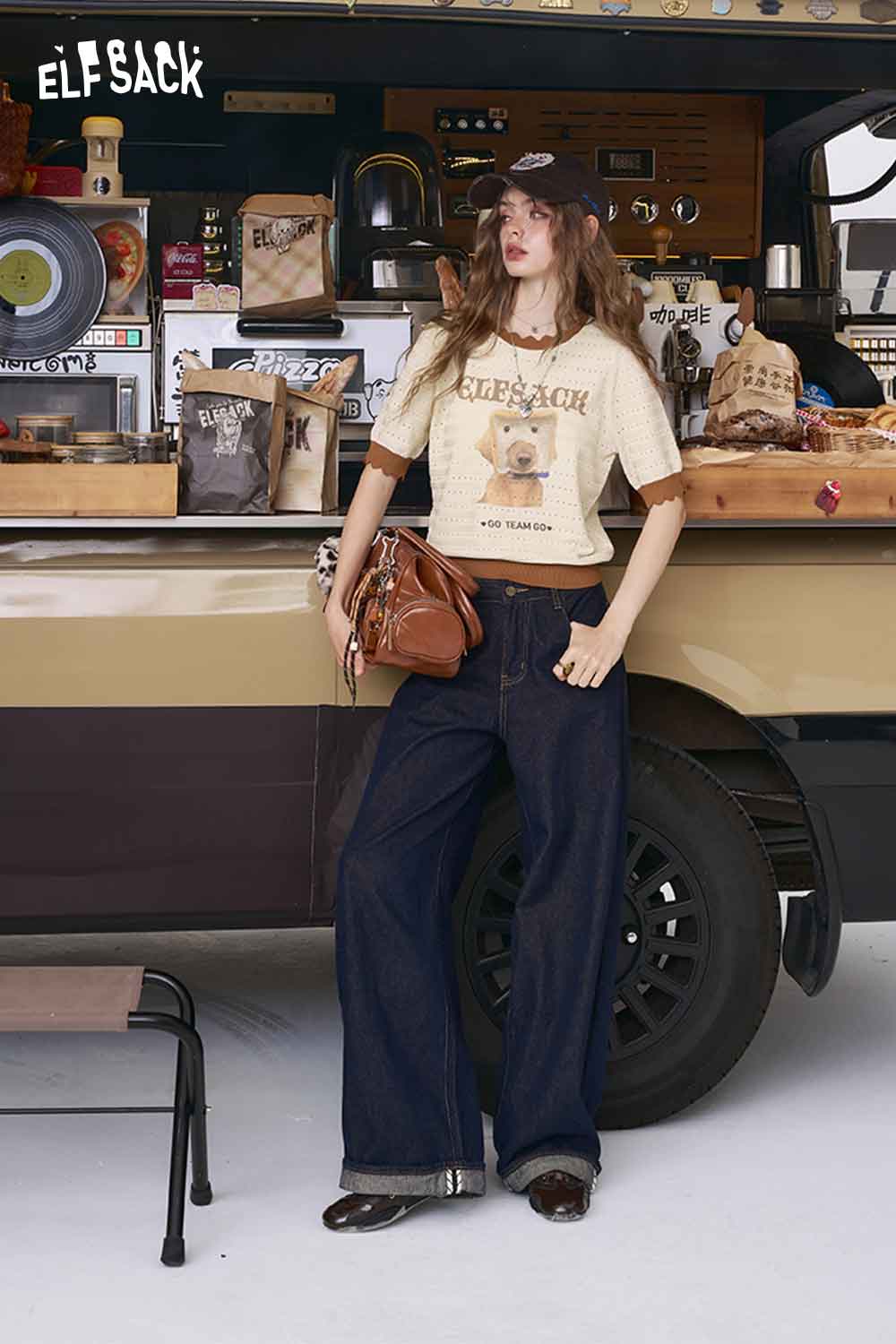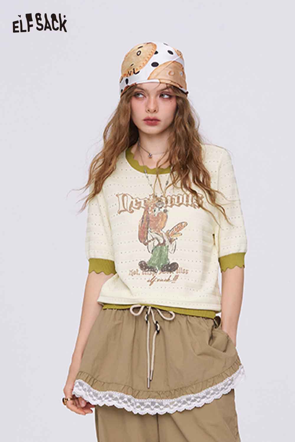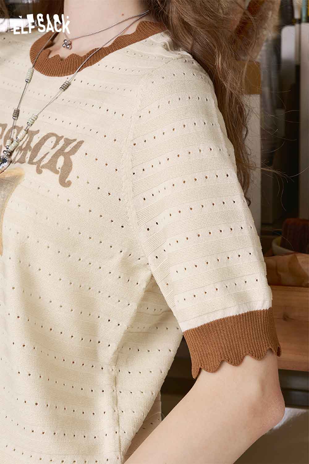 Color-blocked Bread Dog Print Short-Sleeve Knit Top for Women, Lightweight