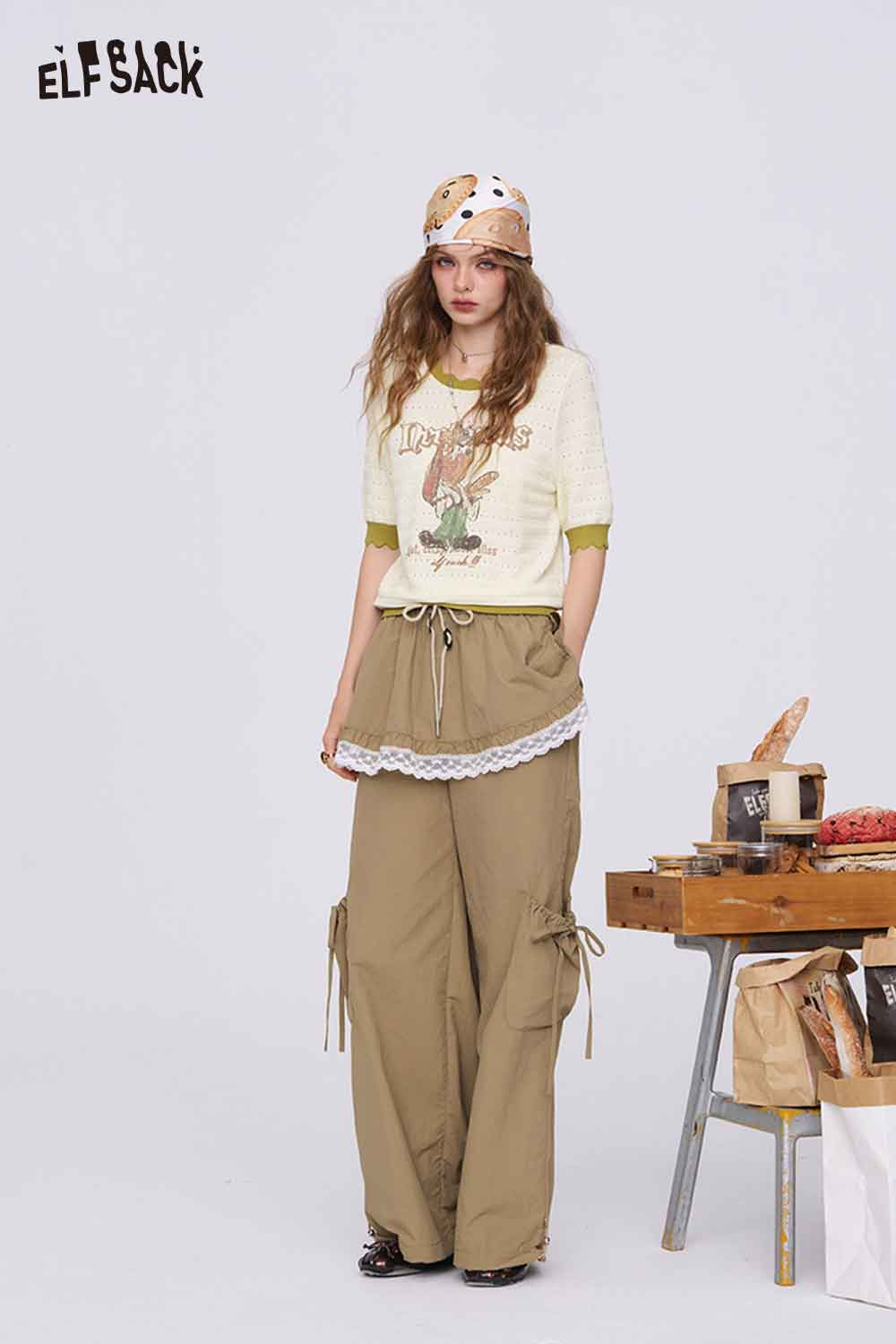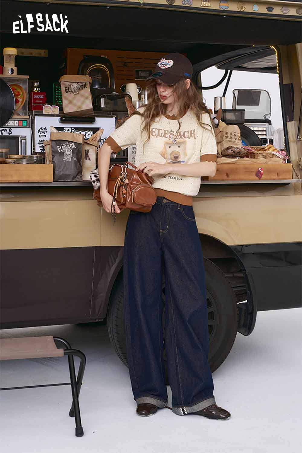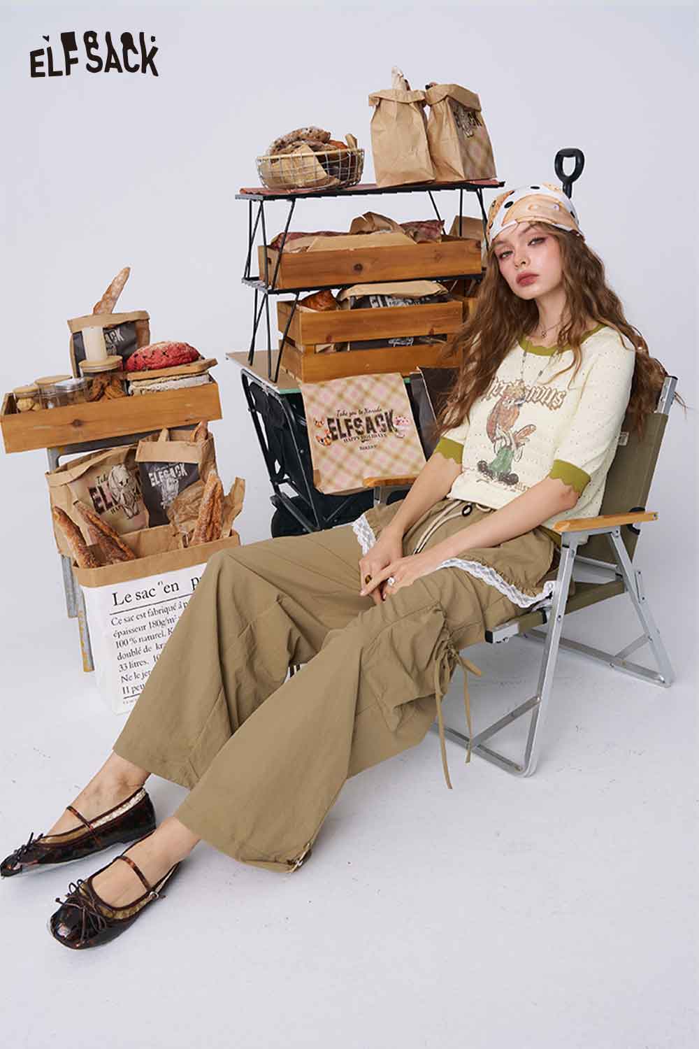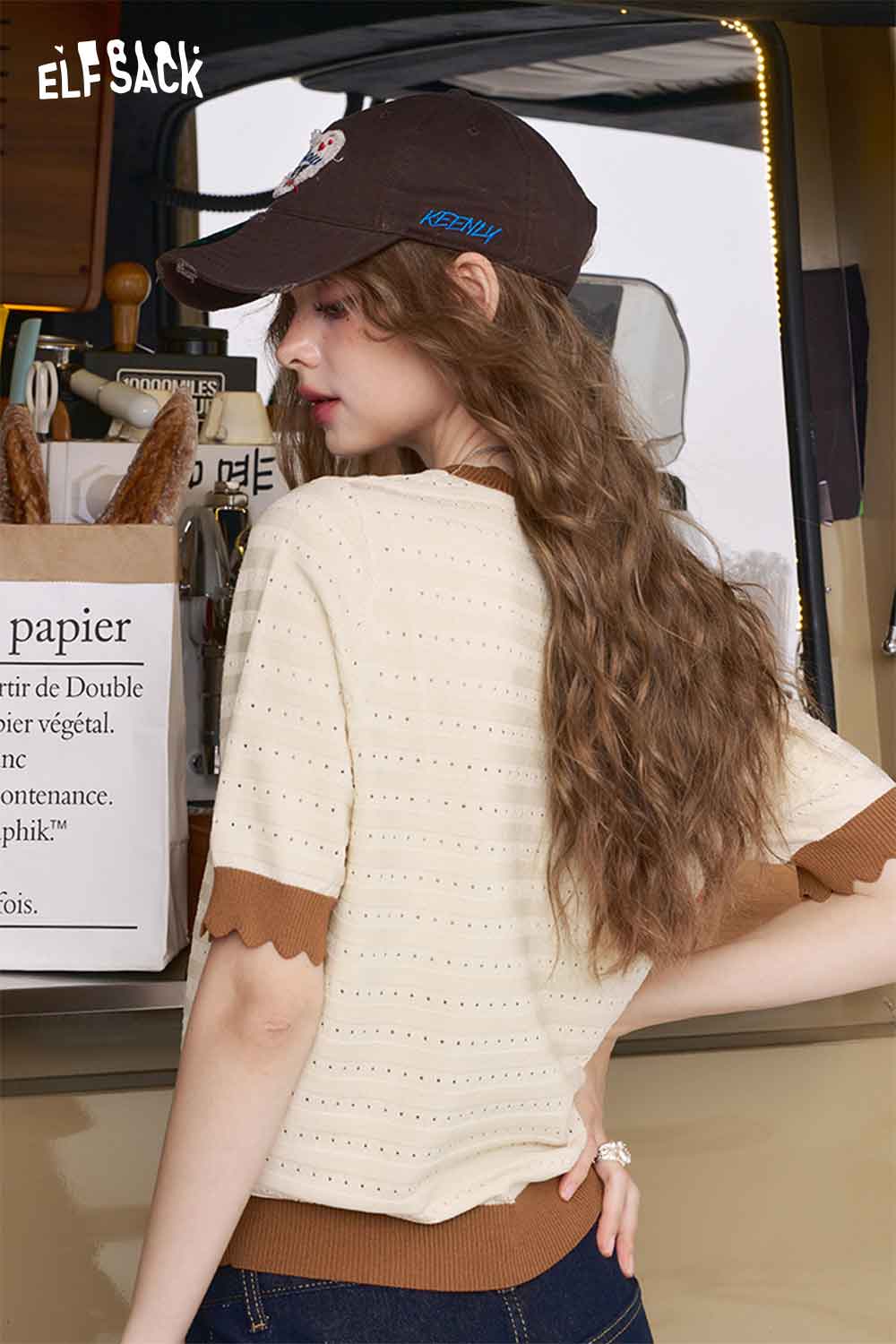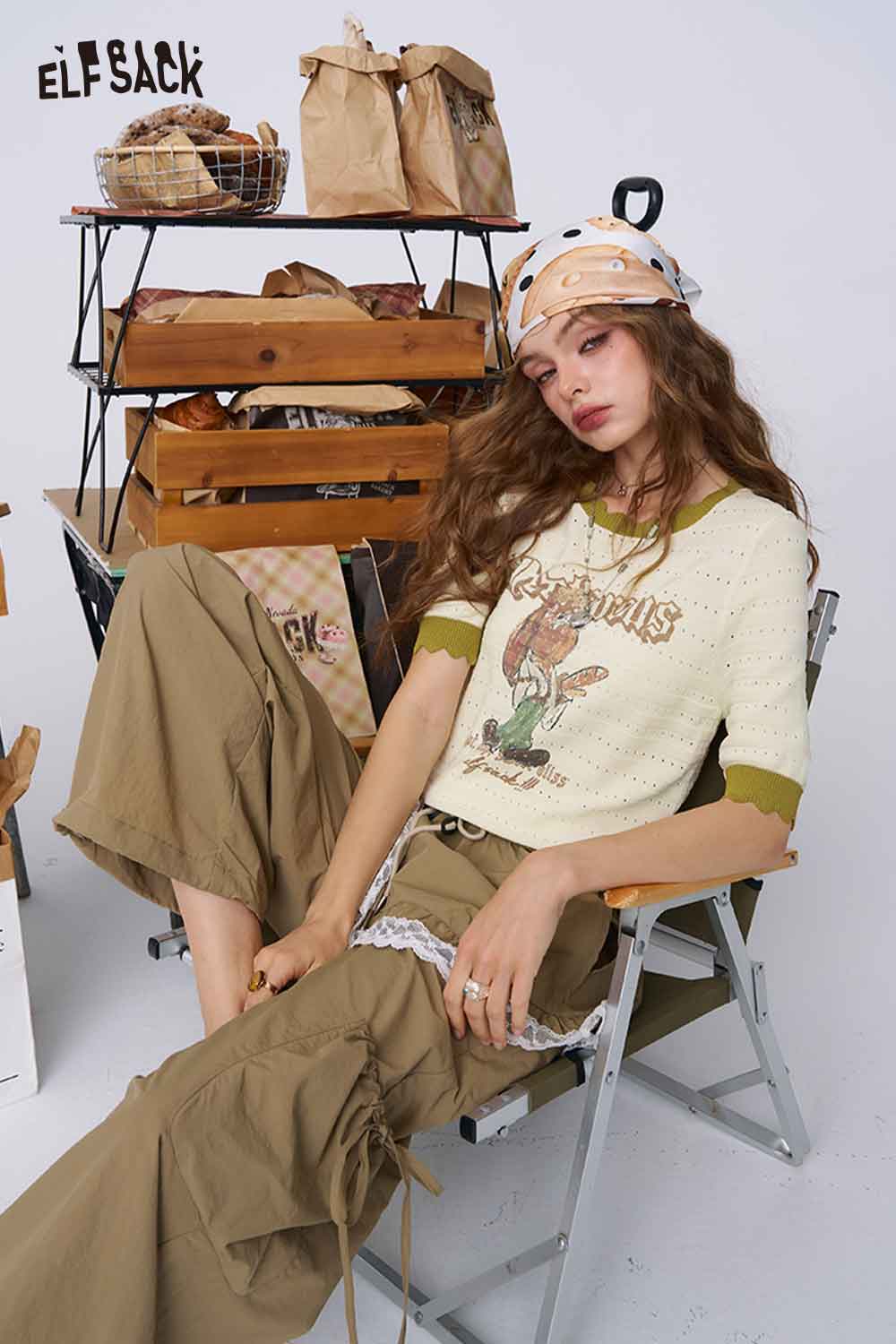 Color-blocked Bread Dog Print Short-Sleeve Knit Top for Women, Lightweight