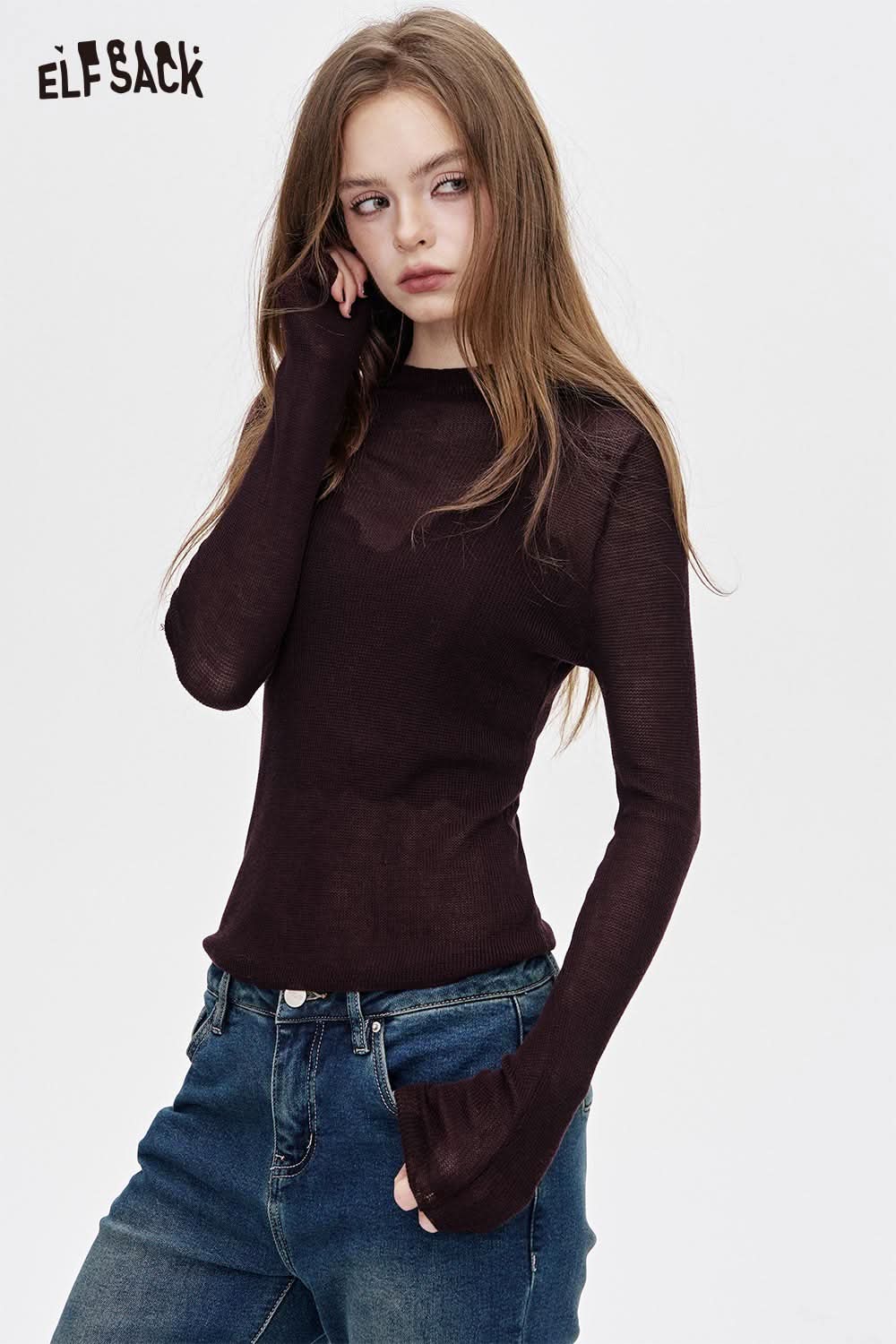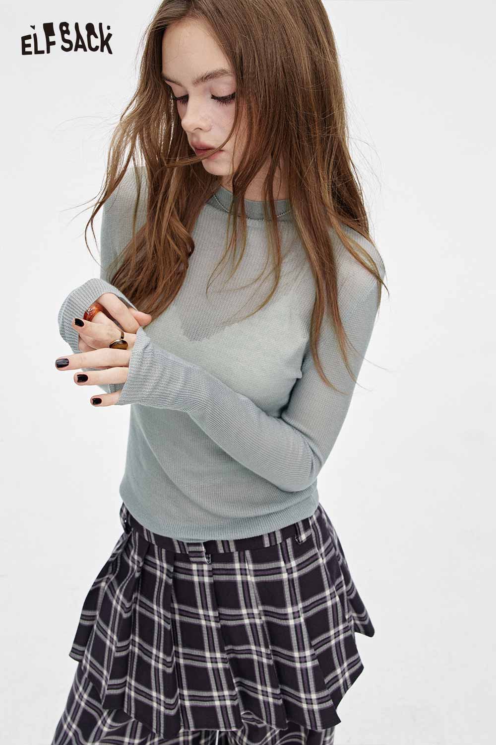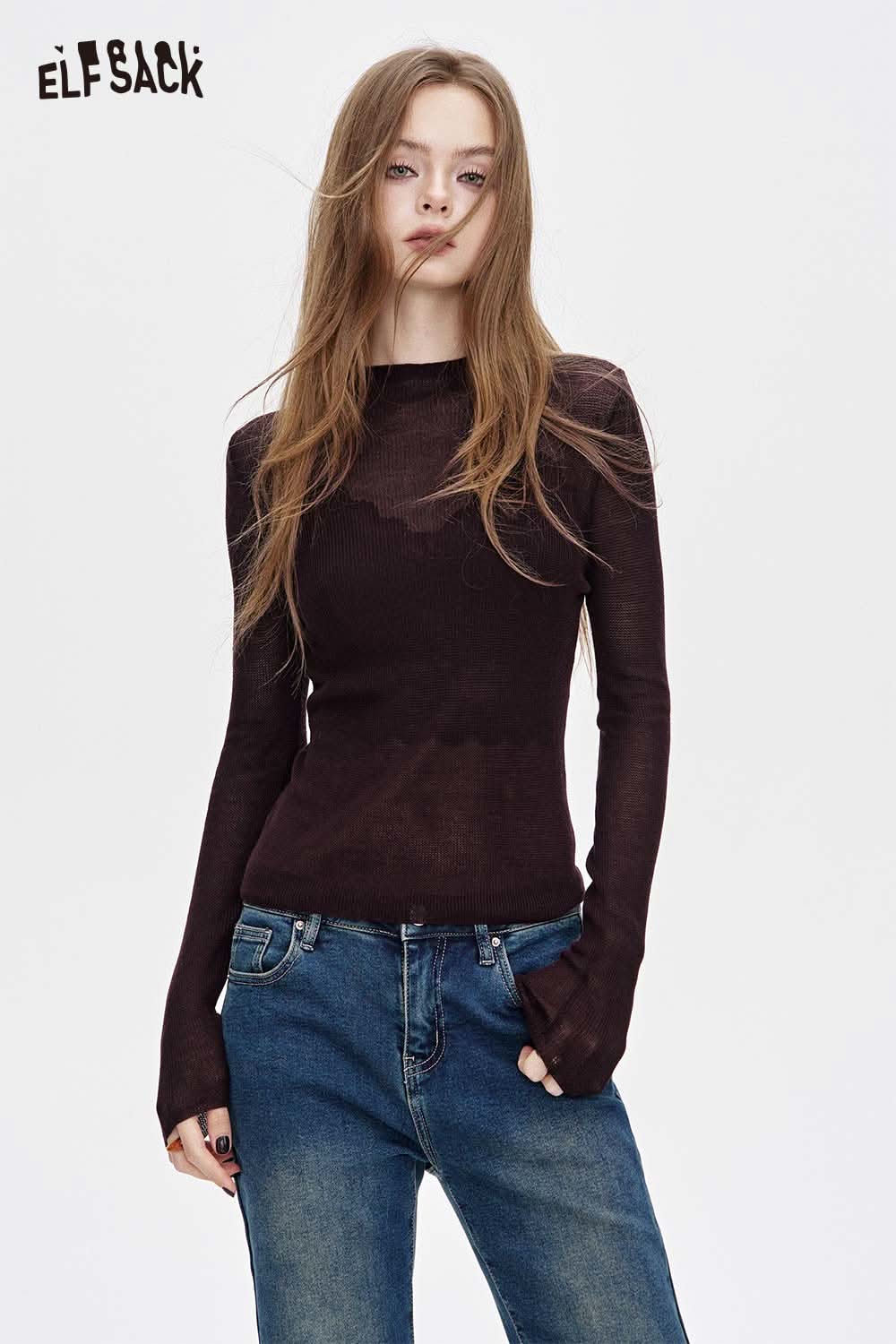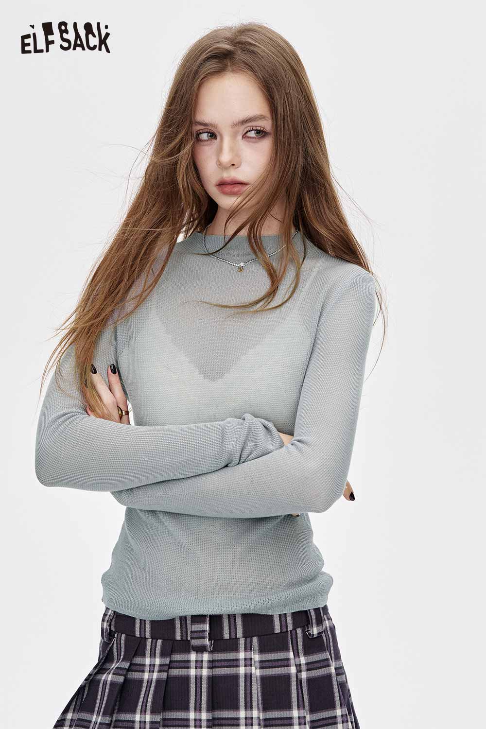 Viscose Blend Semi-Sheer Fabric Relaxed Fit Base Layer Knit Top