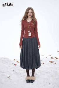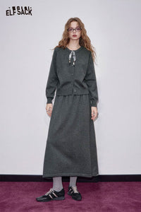 Comfortable Dark Grey Long-sleeved Top and Midi Skirt Matching Set
