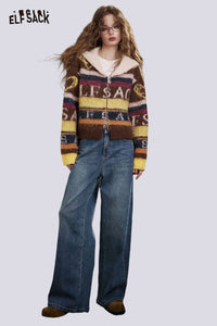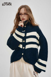 Soft Knit Stand Collar Striped Design Loose Fit Cardigan