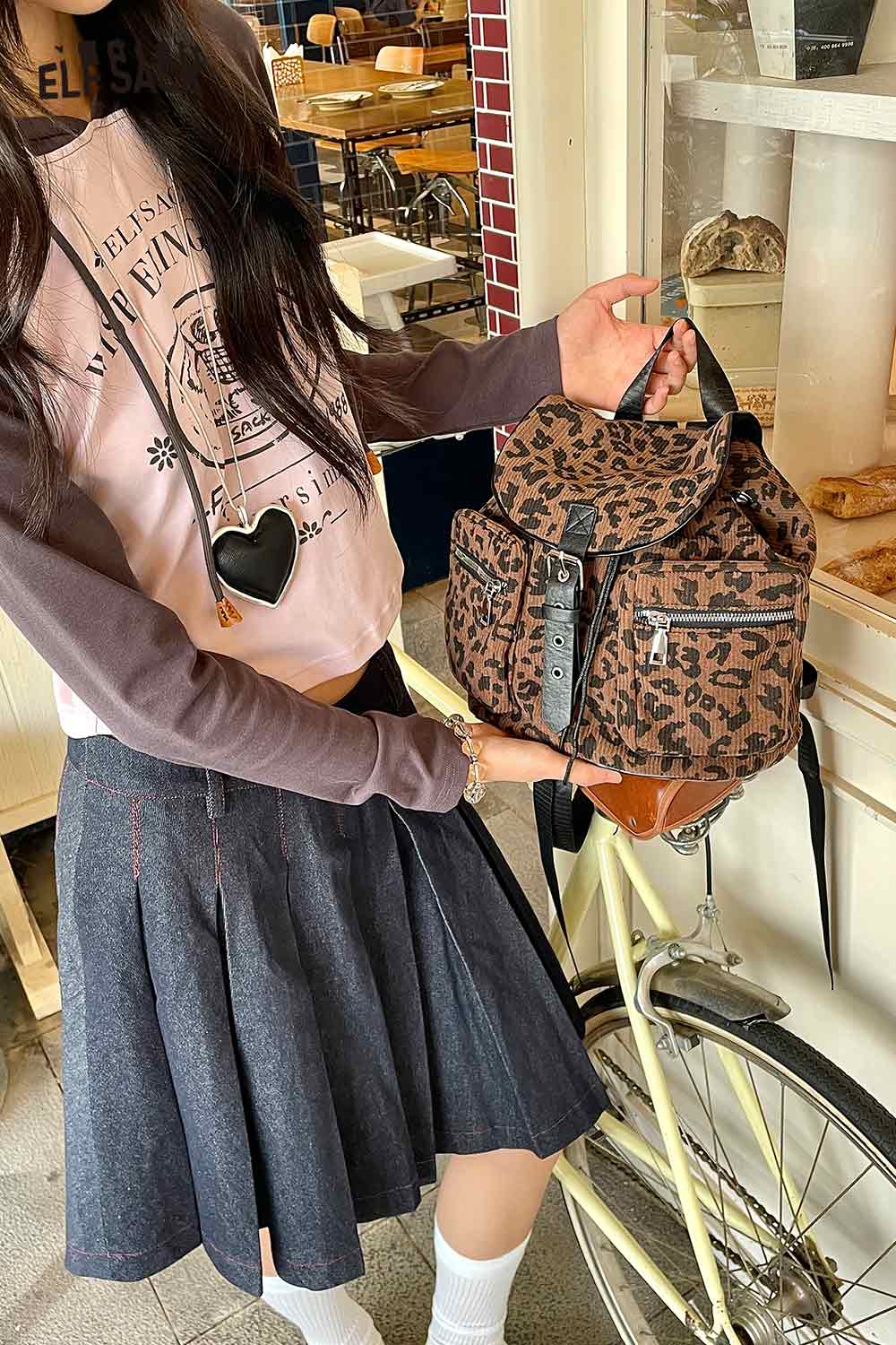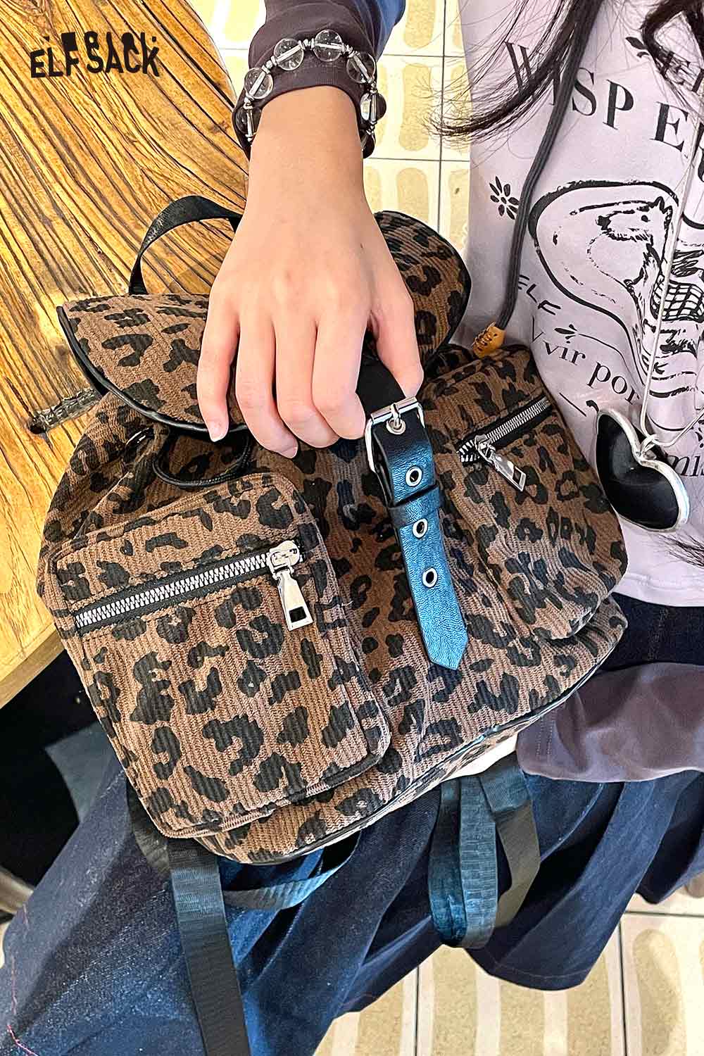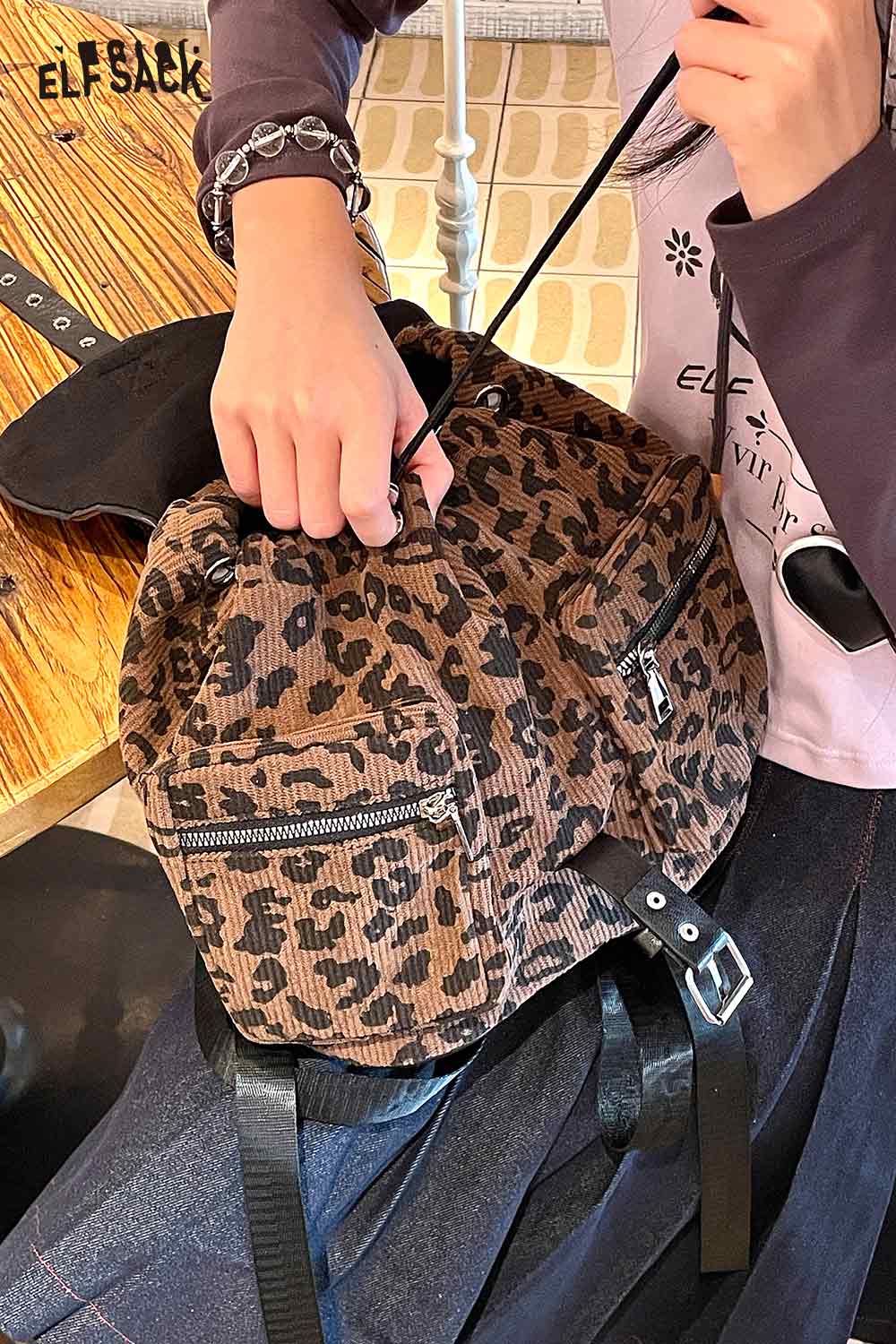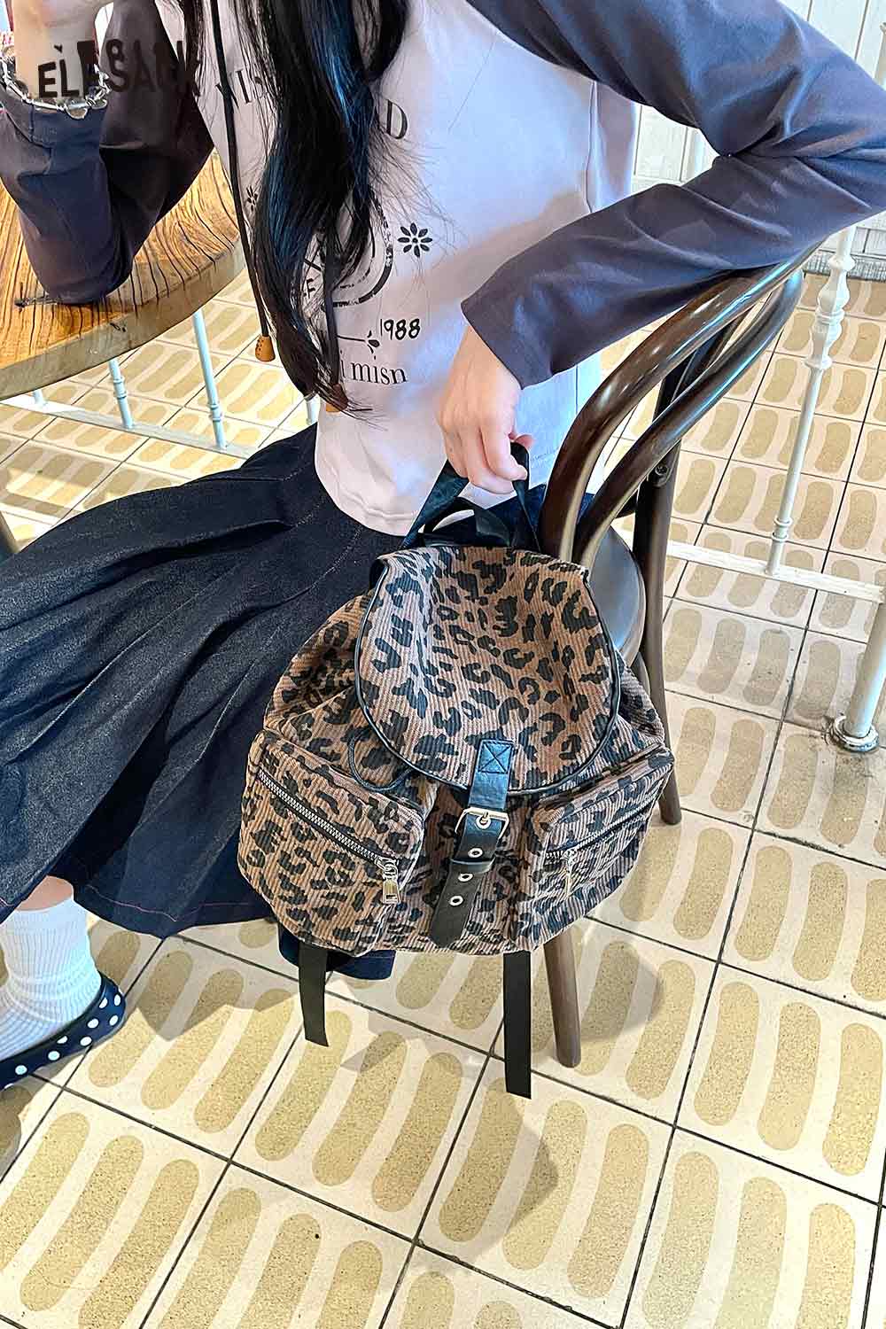 Wool Blend Leopard Pattern Tweed Fabric Flap Closure Rucksack