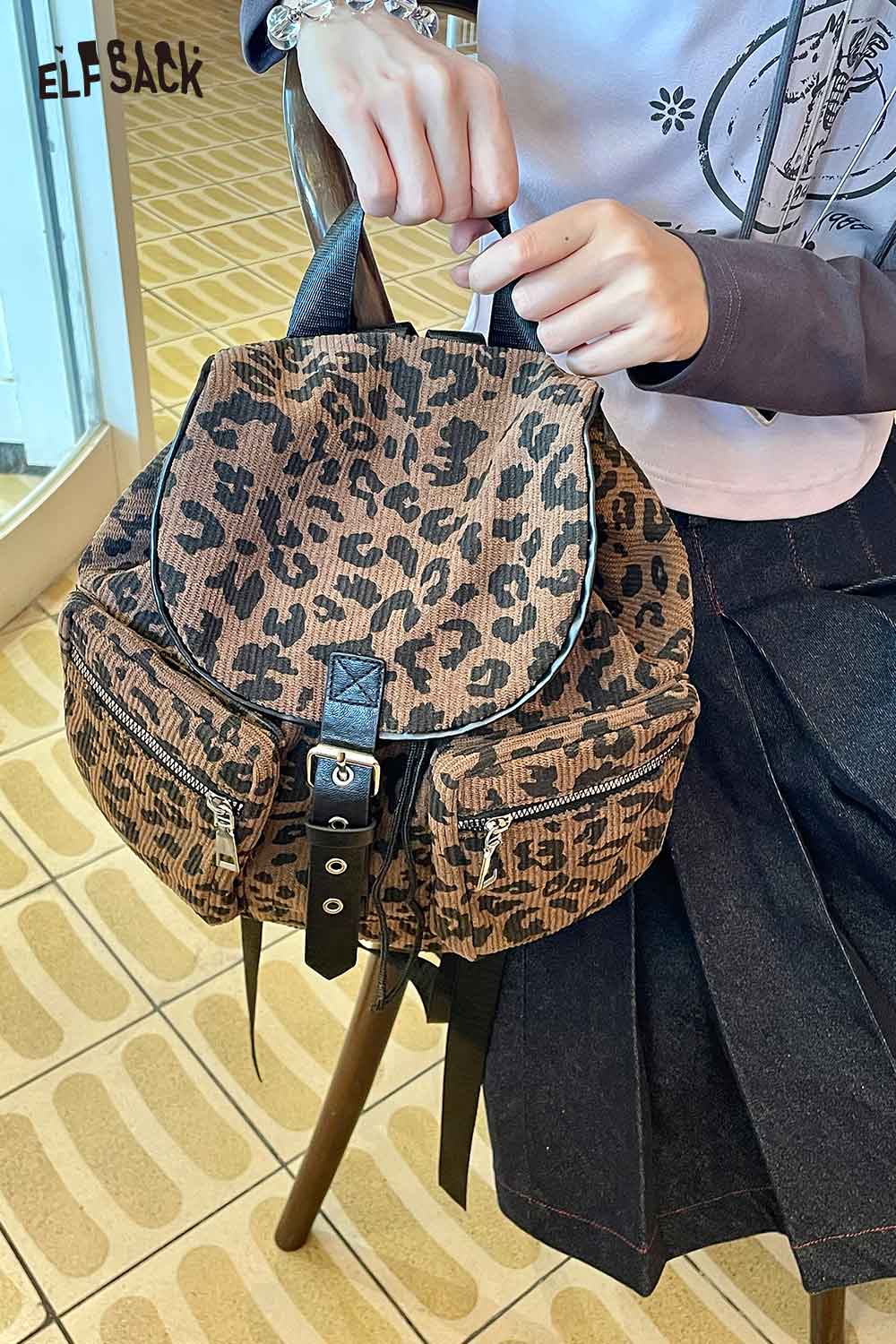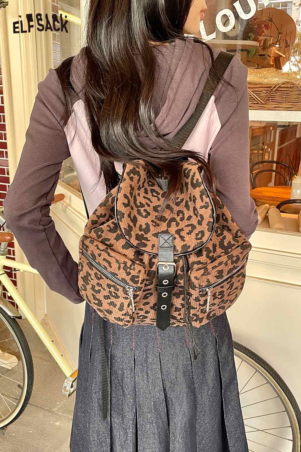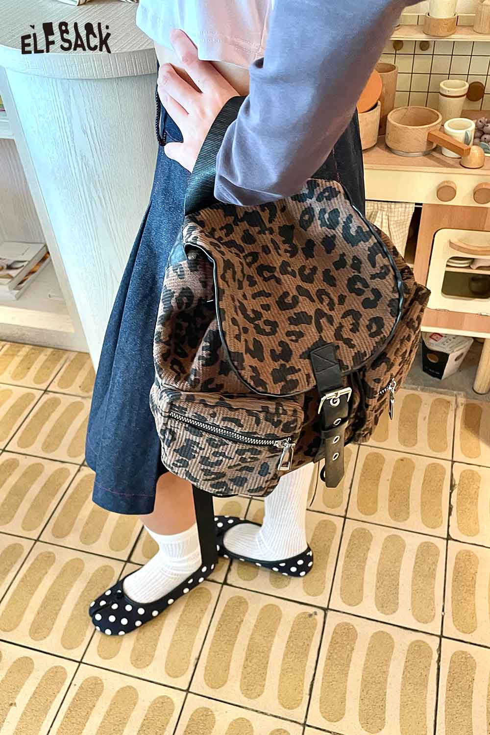 Wool Blend Leopard Pattern Tweed Fabric Flap Closure Rucksack