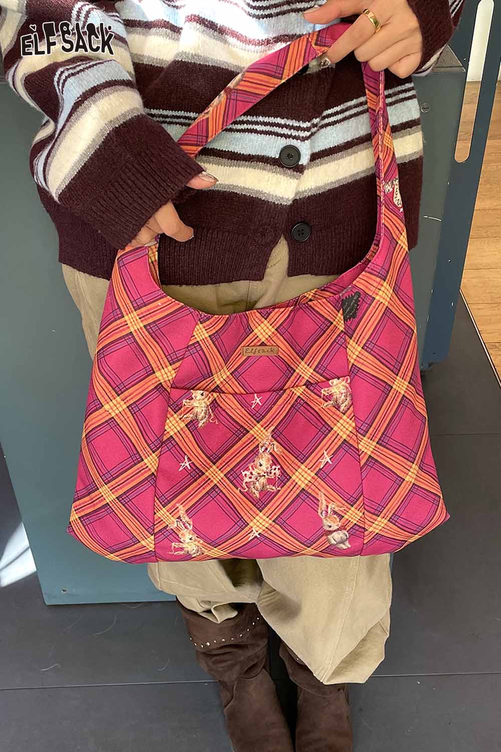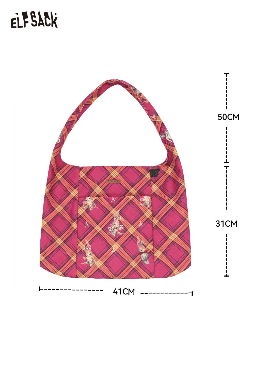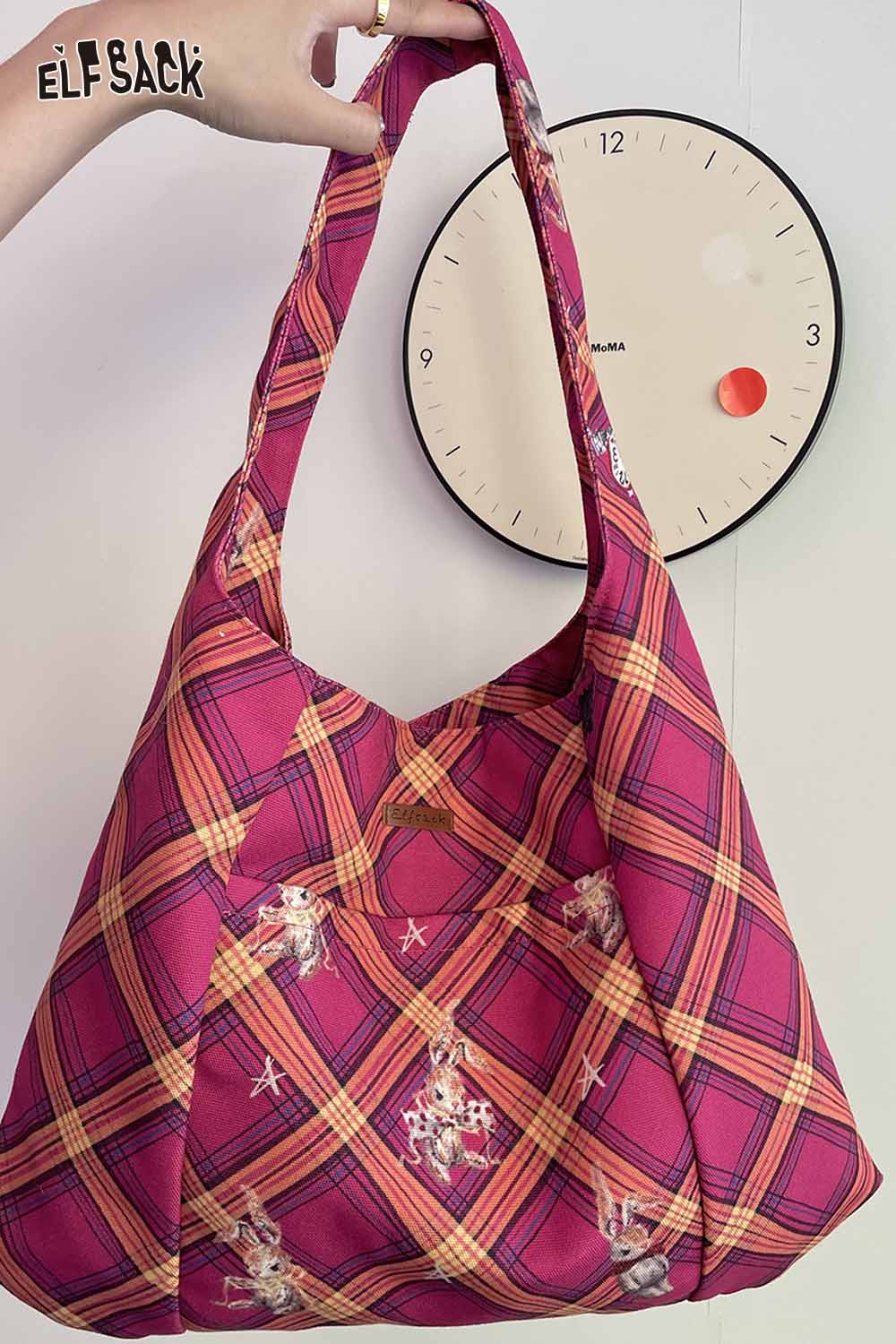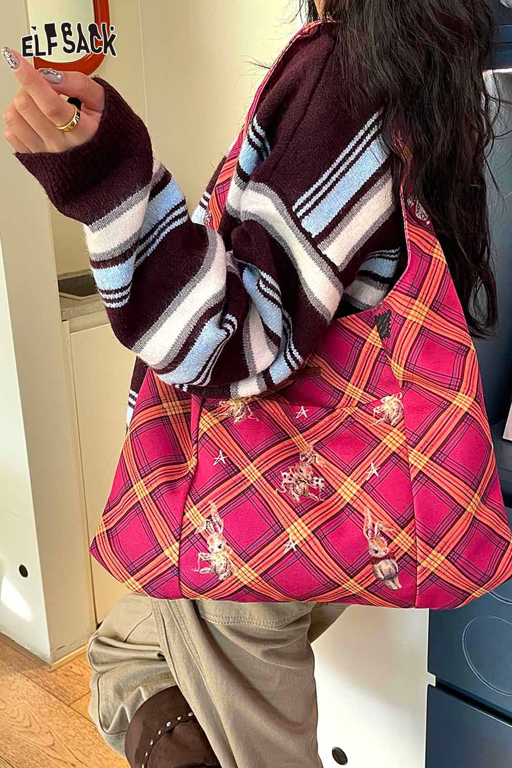 Canvas Color Block Plaid Cartoon Rabbit Print Tote Bag