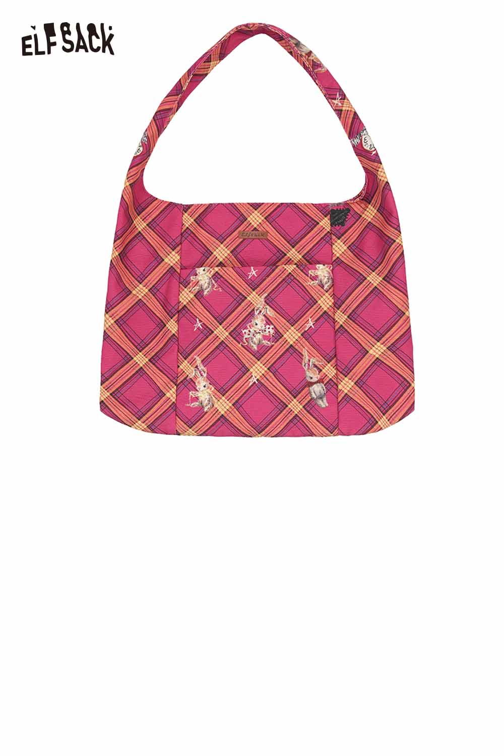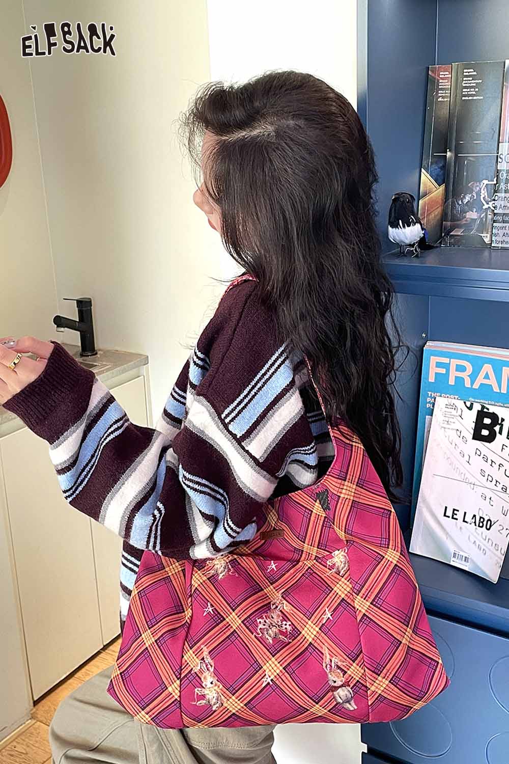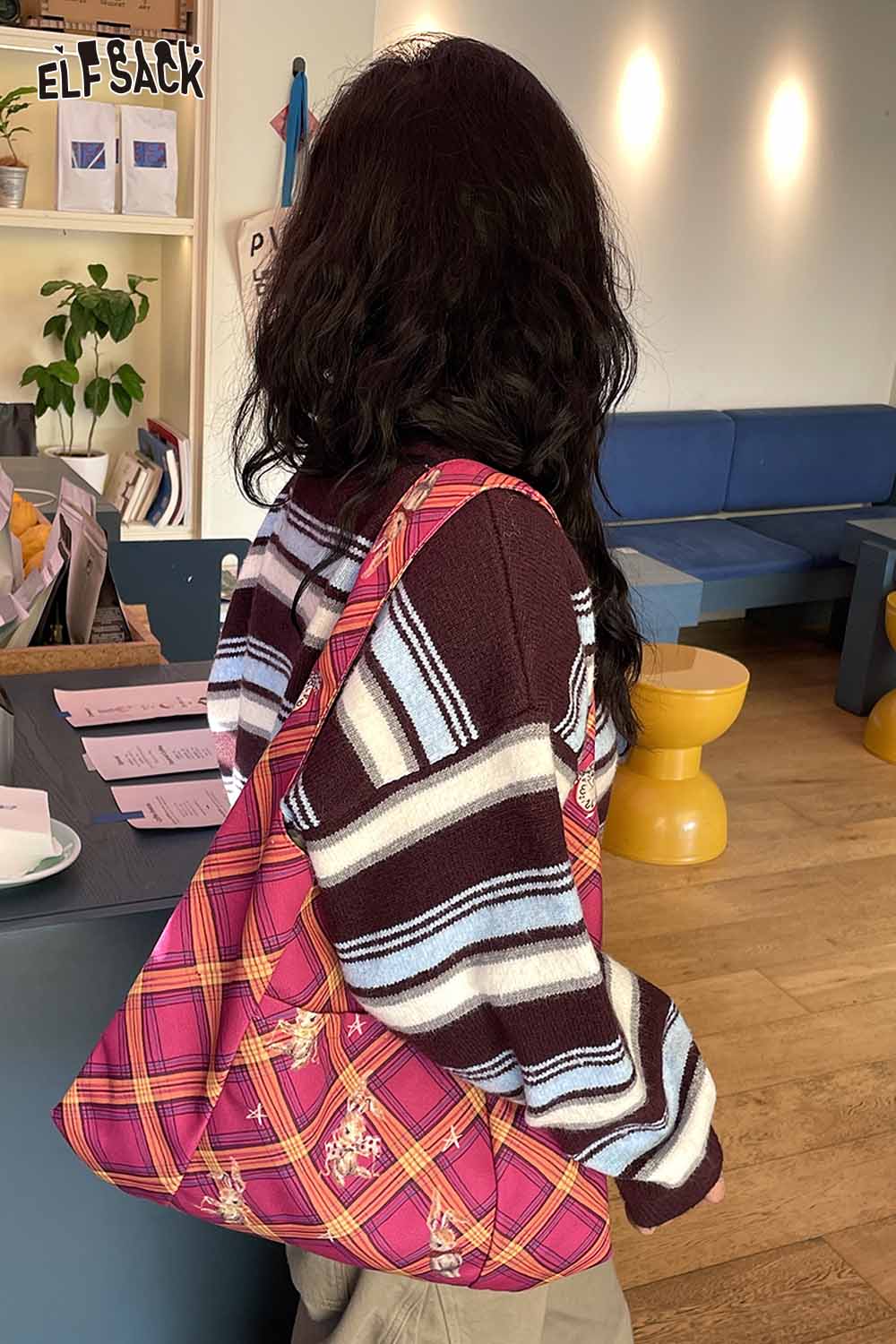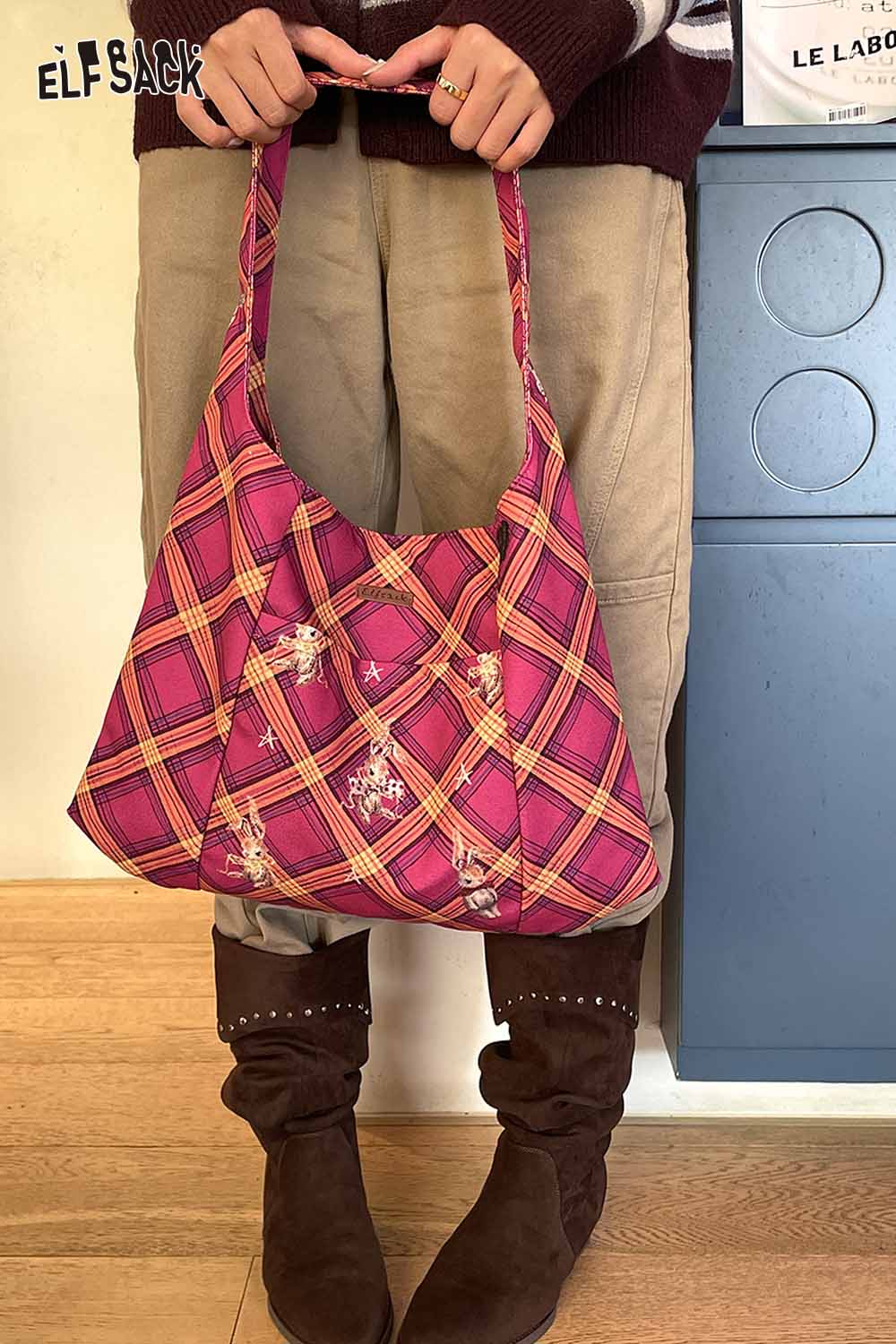 Canvas Color Block Plaid Cartoon Rabbit Print Tote Bag