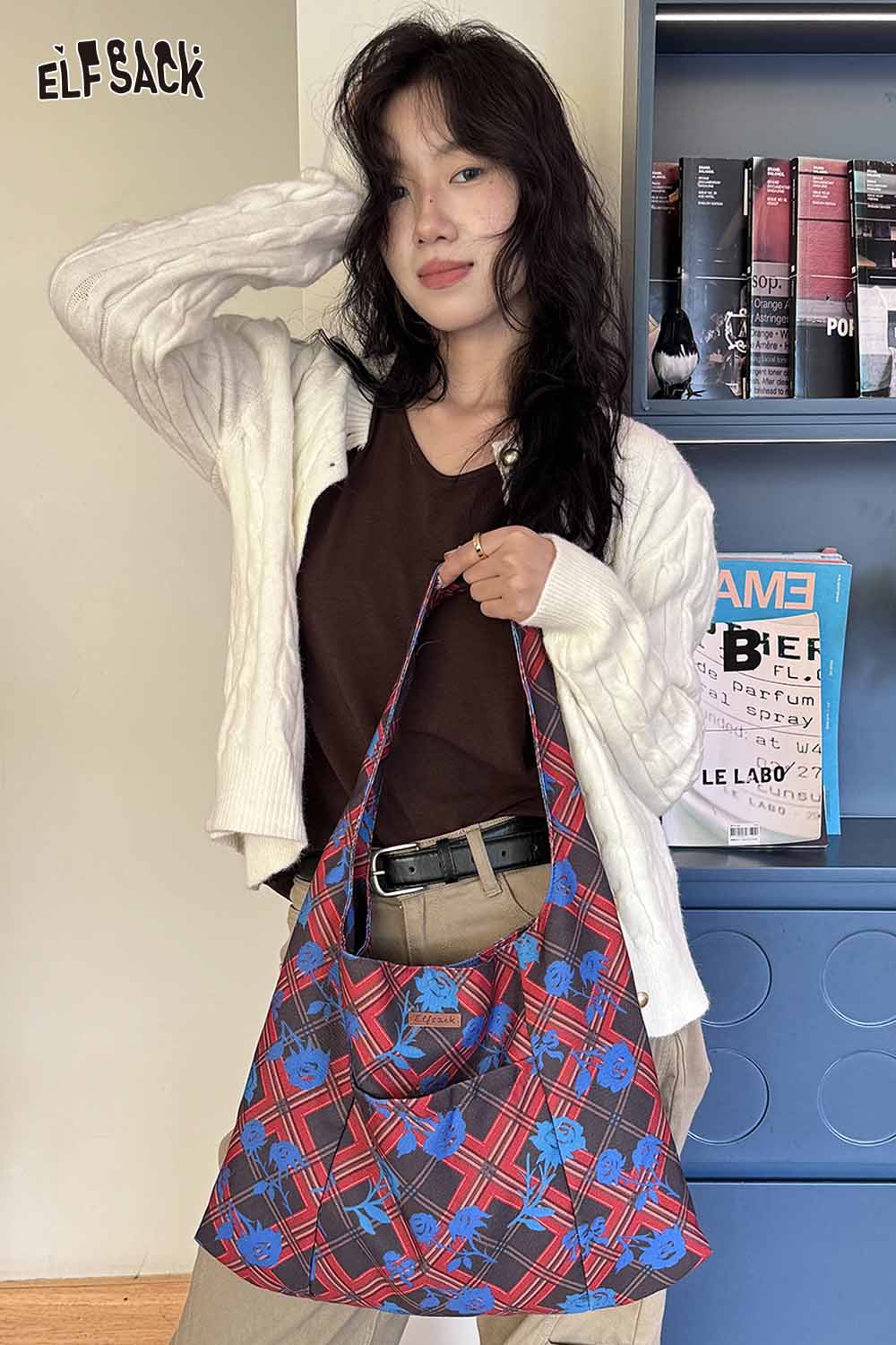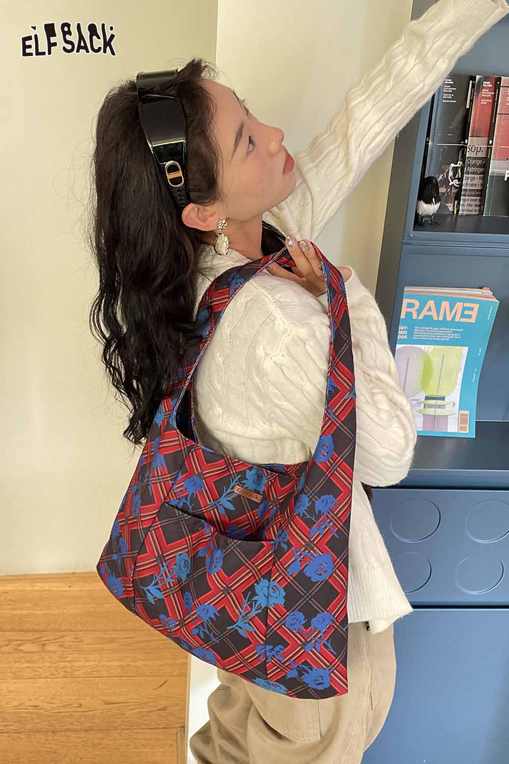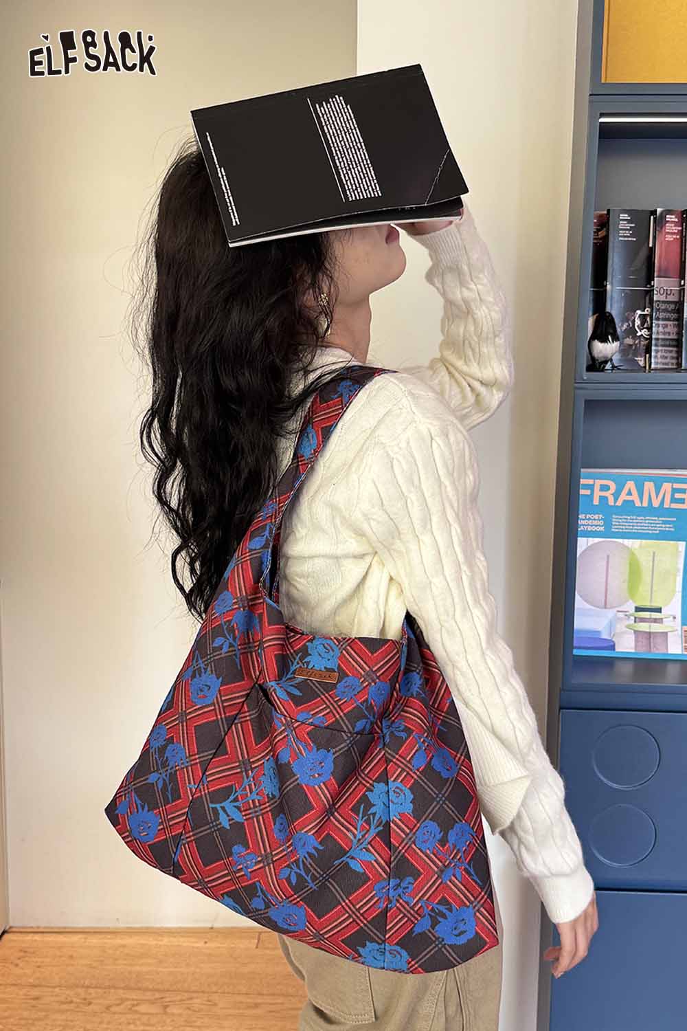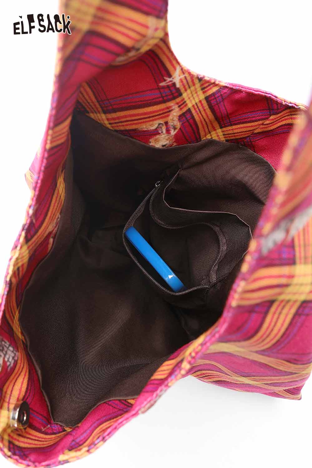 Canvas Color Block Plaid Cartoon Rabbit Print Tote Bag