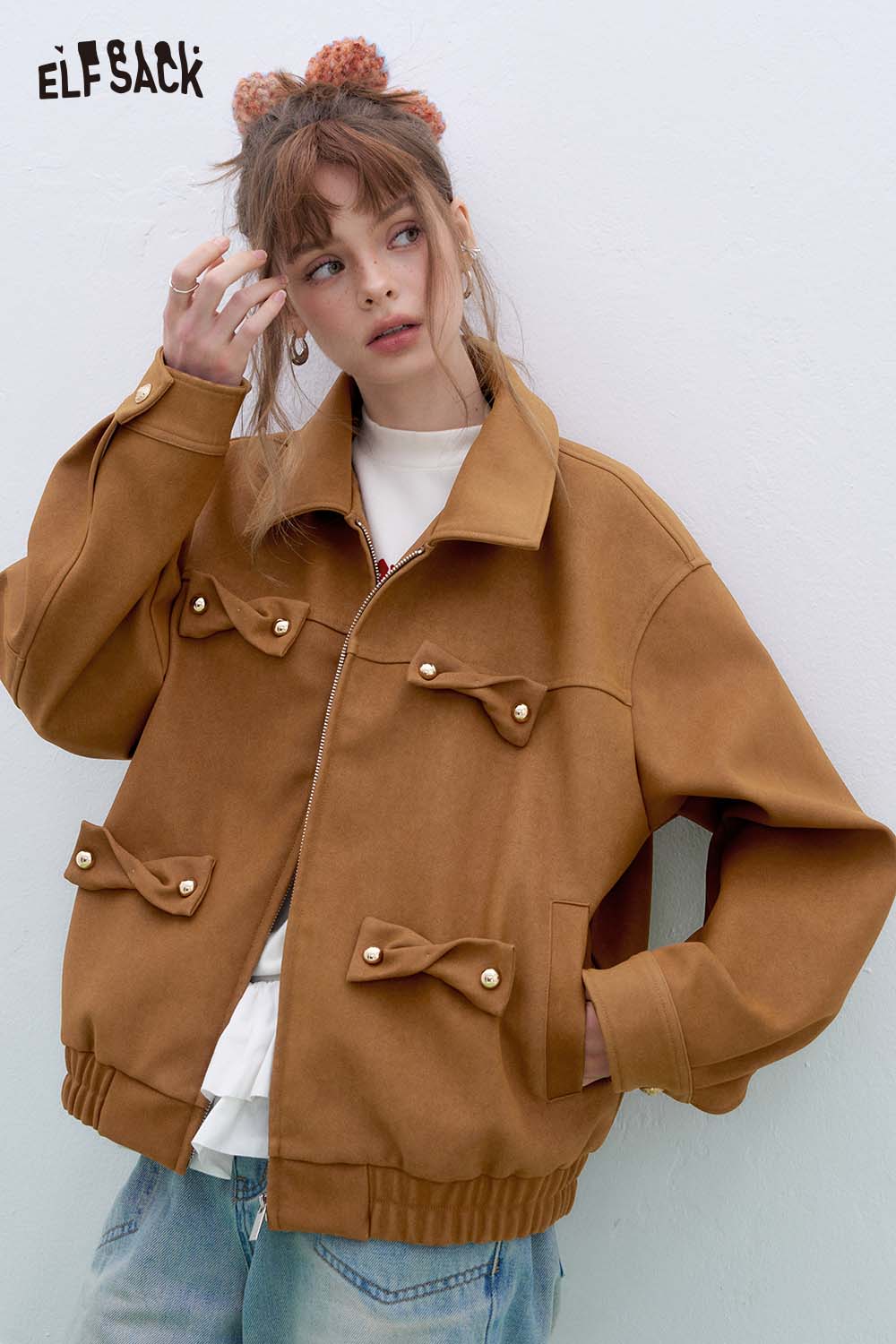 ELFSACK Bowknot diamond pattern stand collar waist down jacket women fashion stand collar glitter woven fabric warm jacket