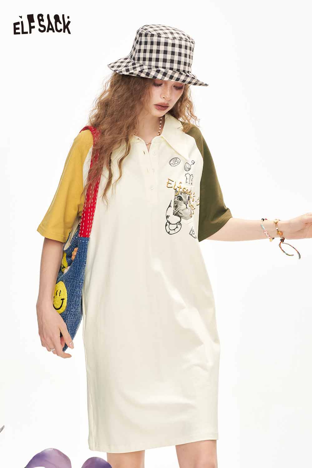 Cute Color Block Raglan Cat Graphic Loose Tshirt Dress