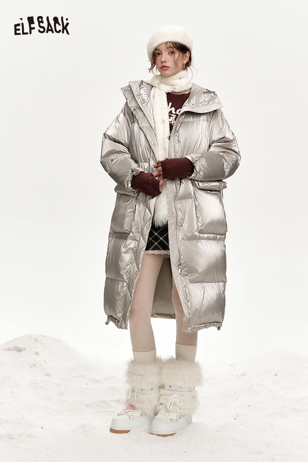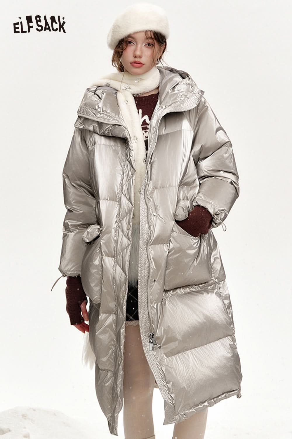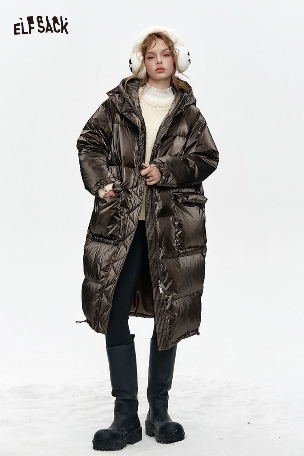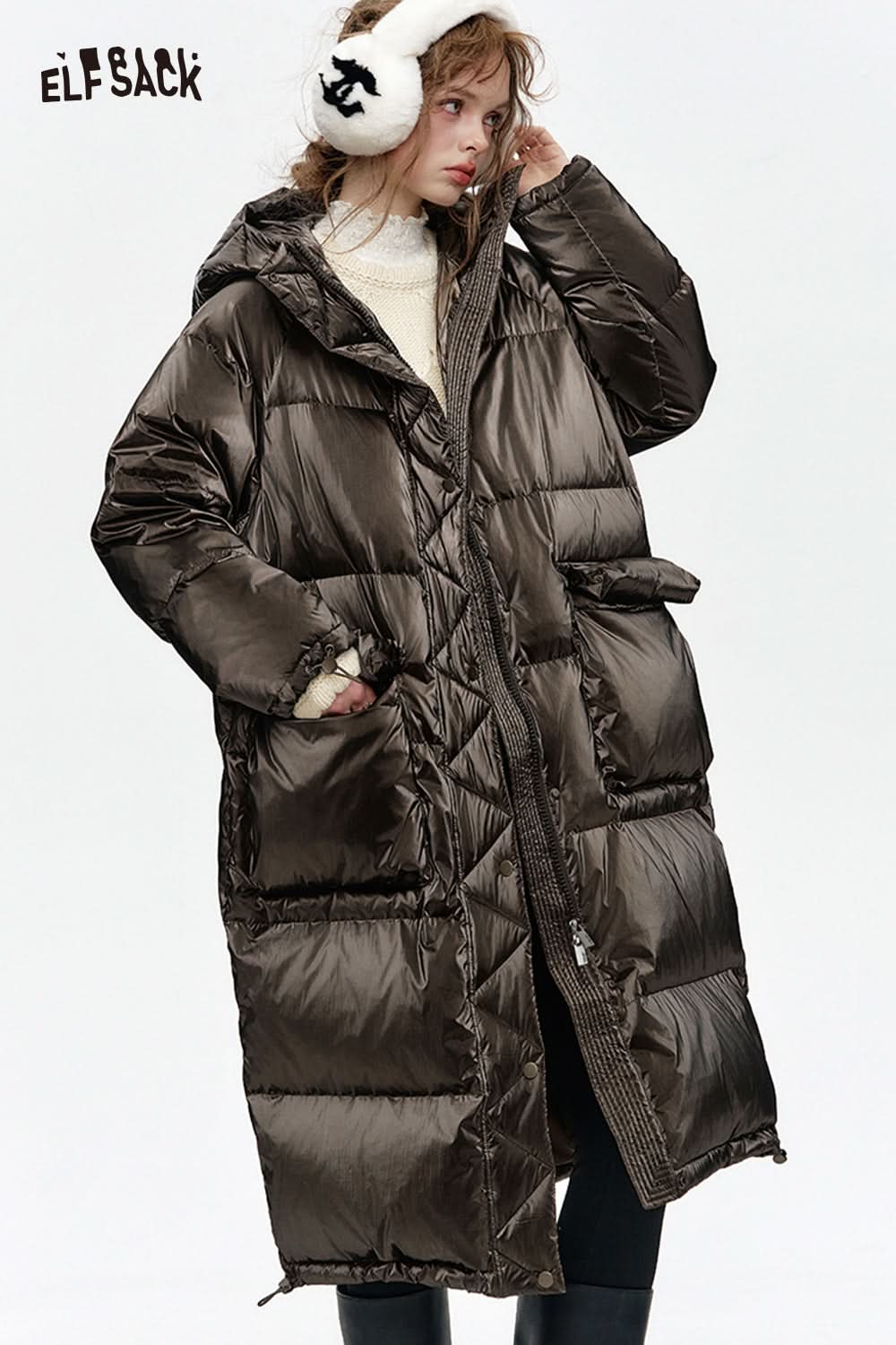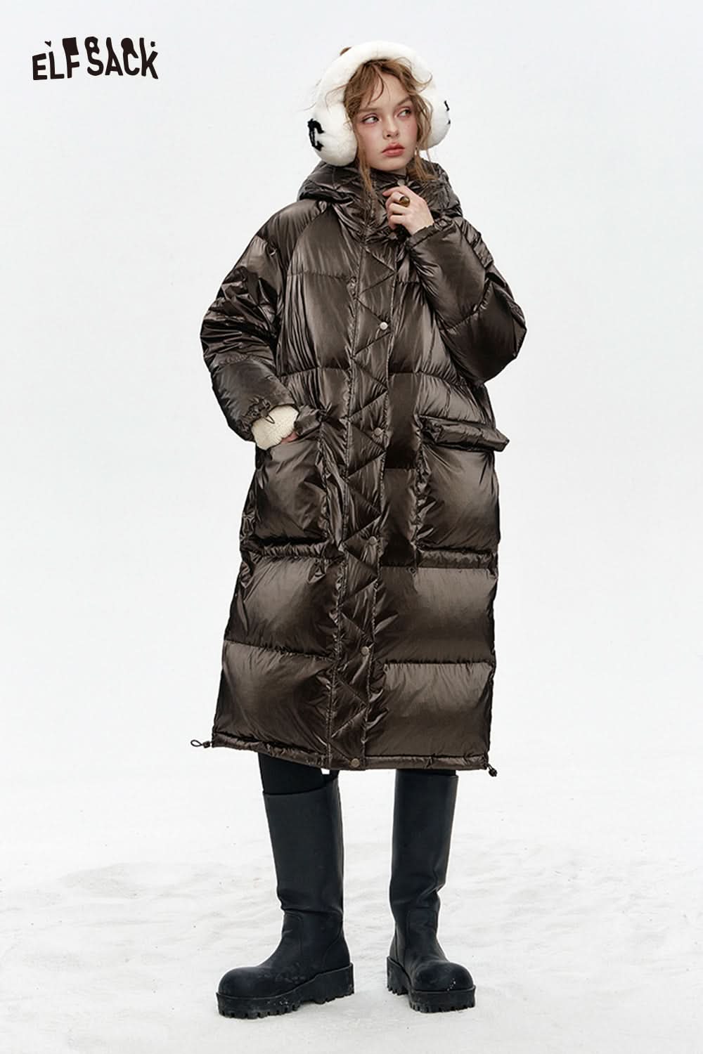 Hooded drawstring pockets long down jacket