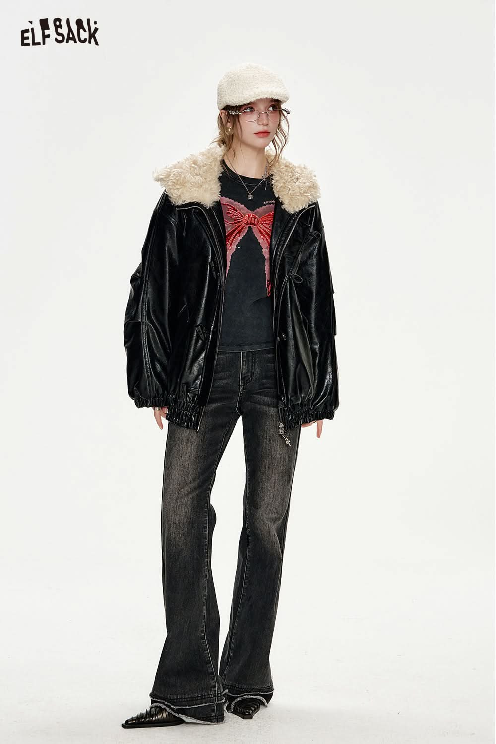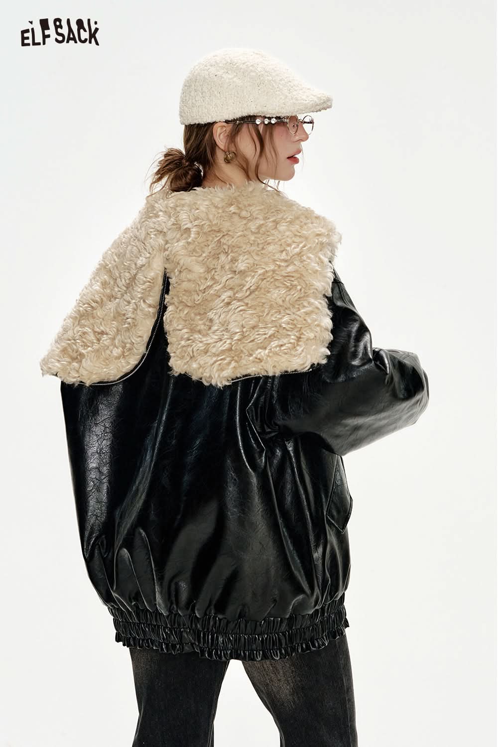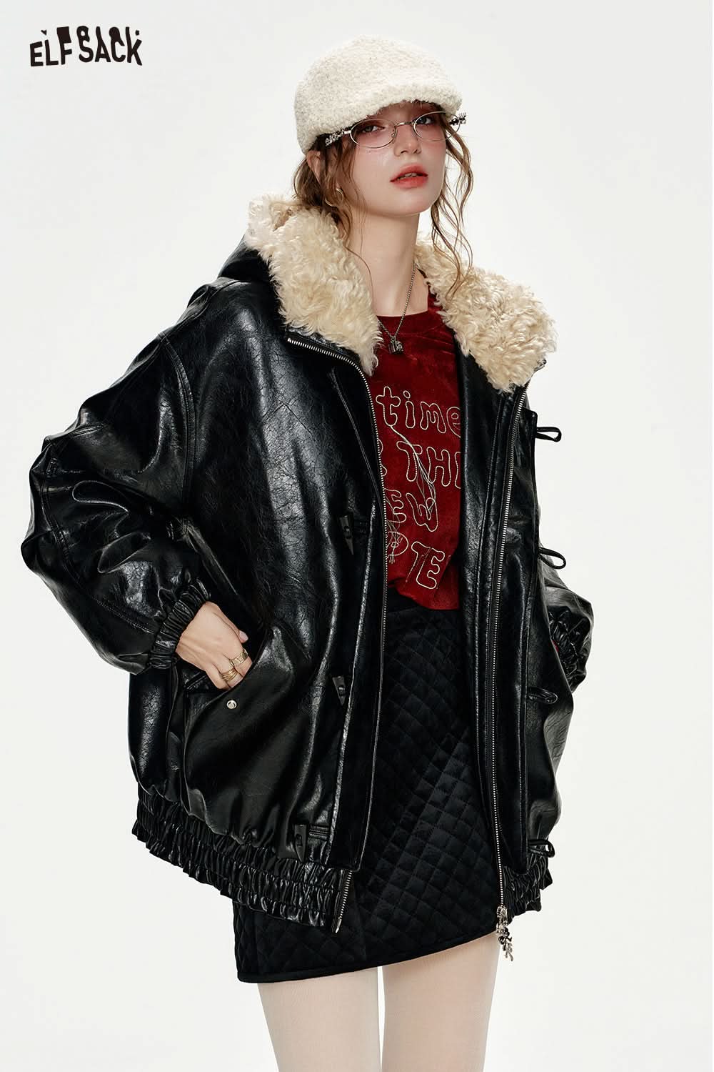 PU Black Large Faux Fur Collar Horn Button Leather Jacket