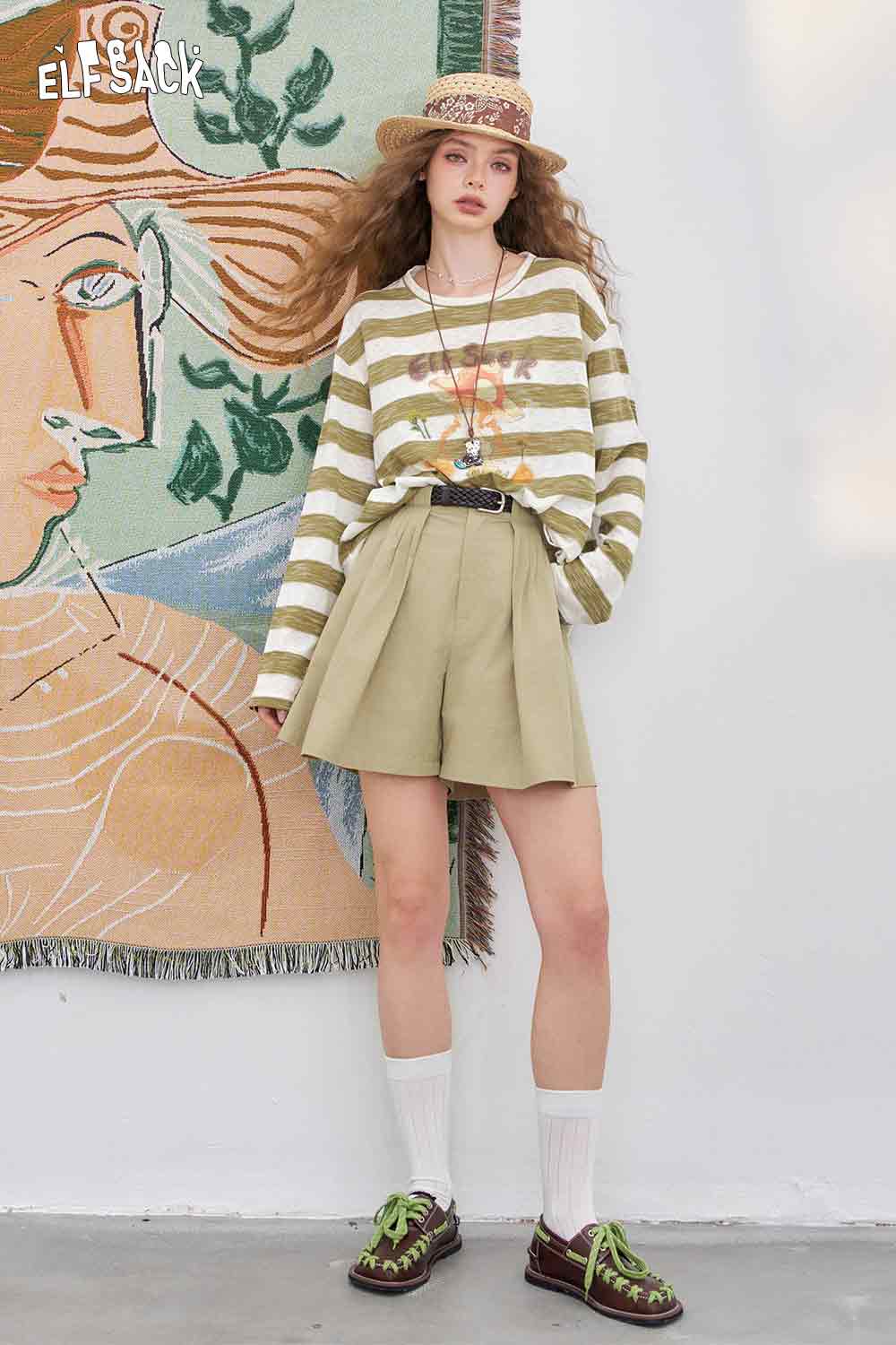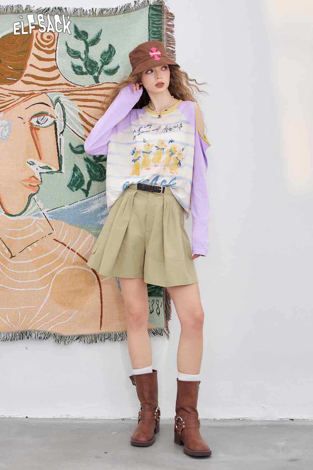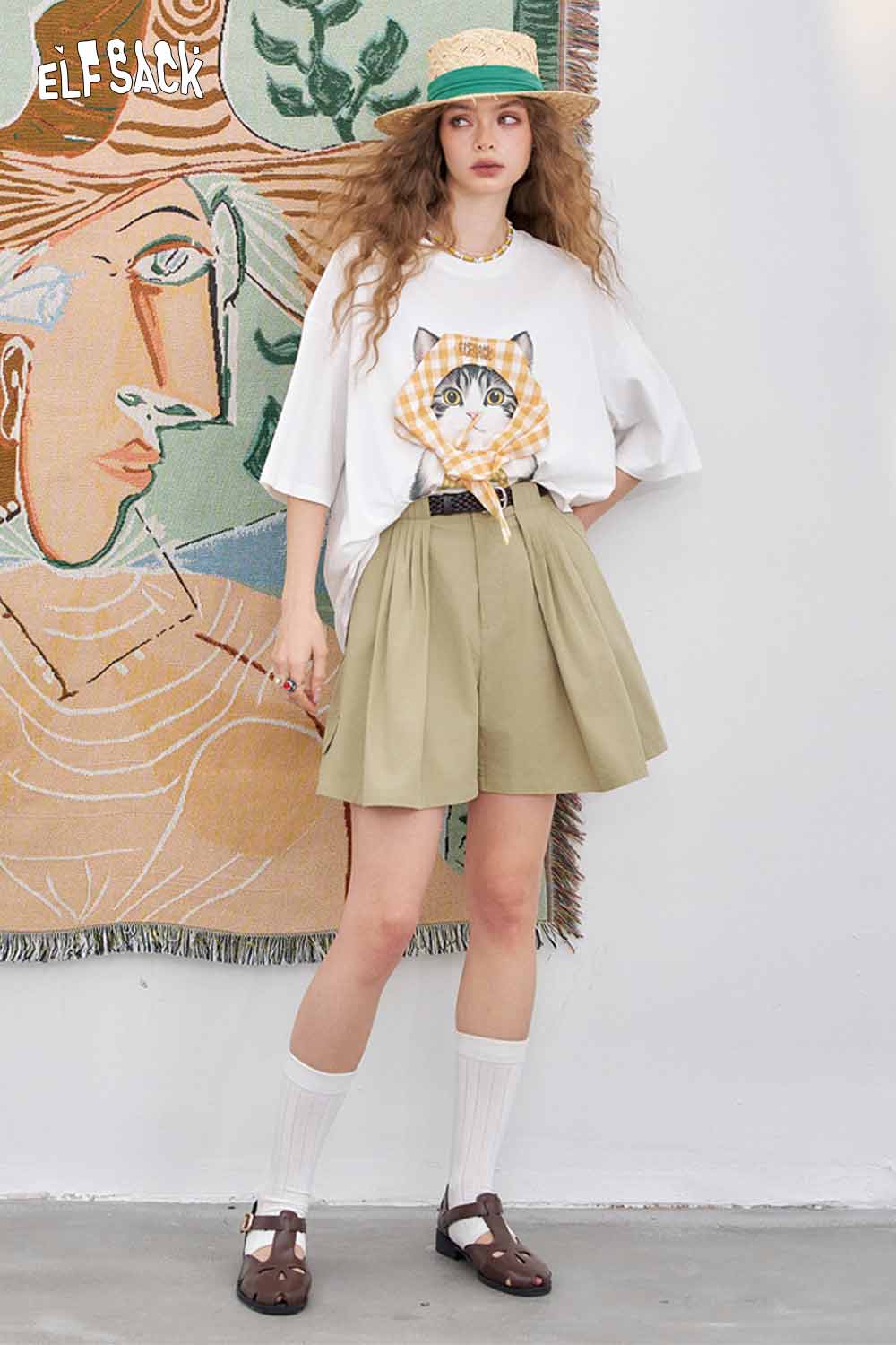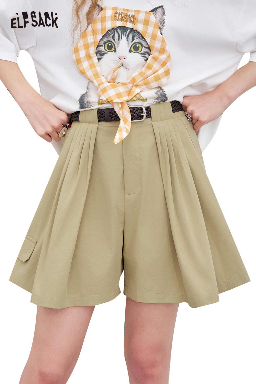 Cotton Loose A-Line Empire Solid Khaki Shorts