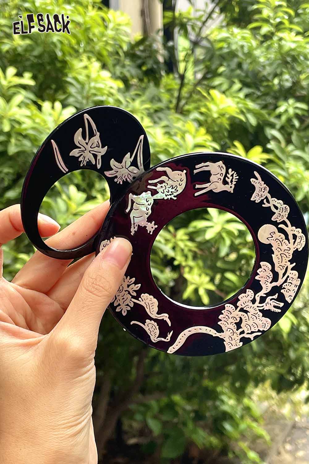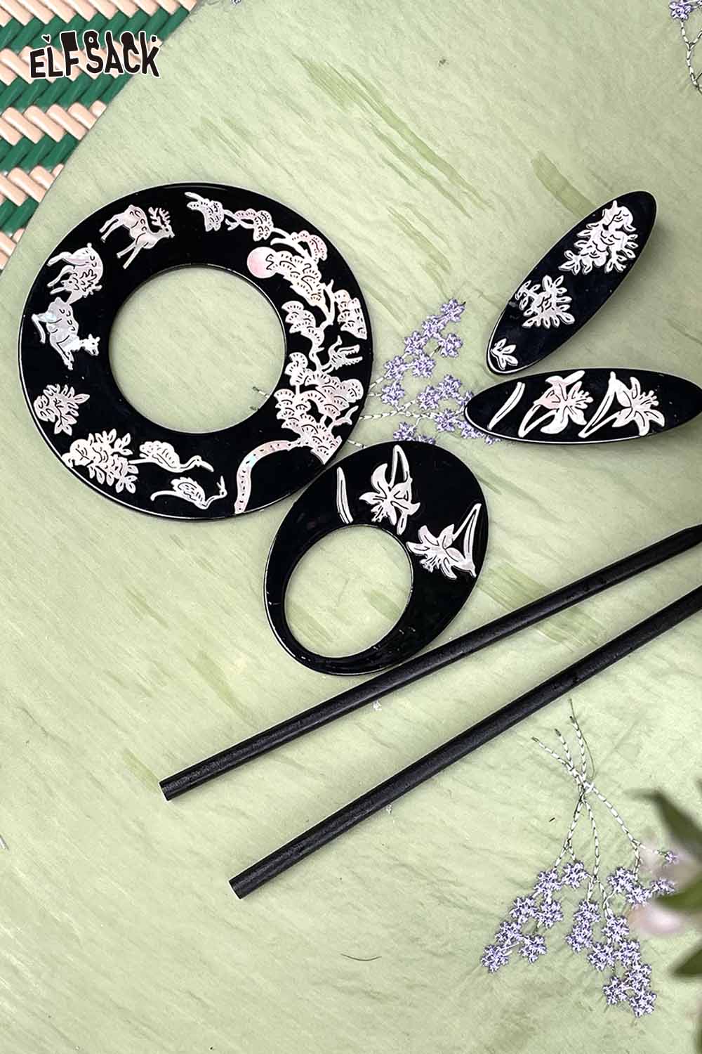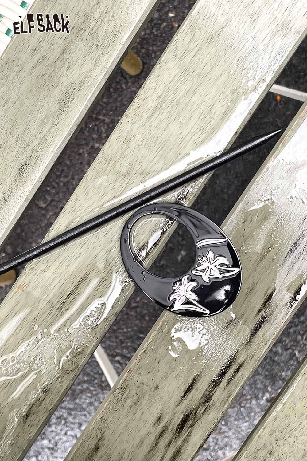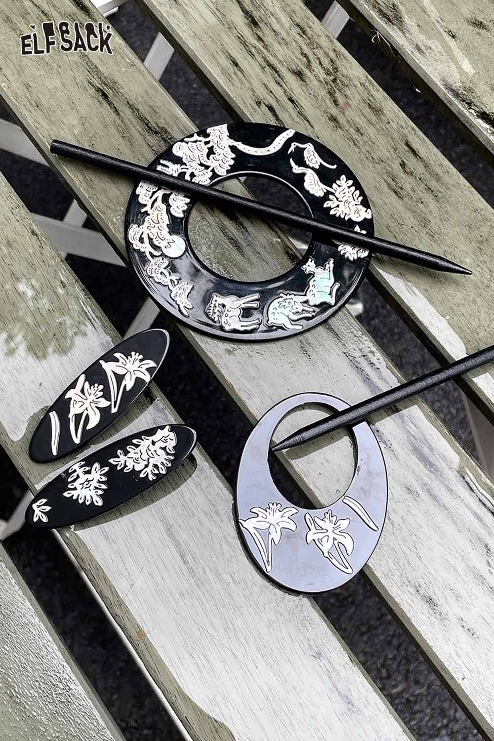 Black Carved Orchid Motif Vintage Inspired Lacquer Hairpin
