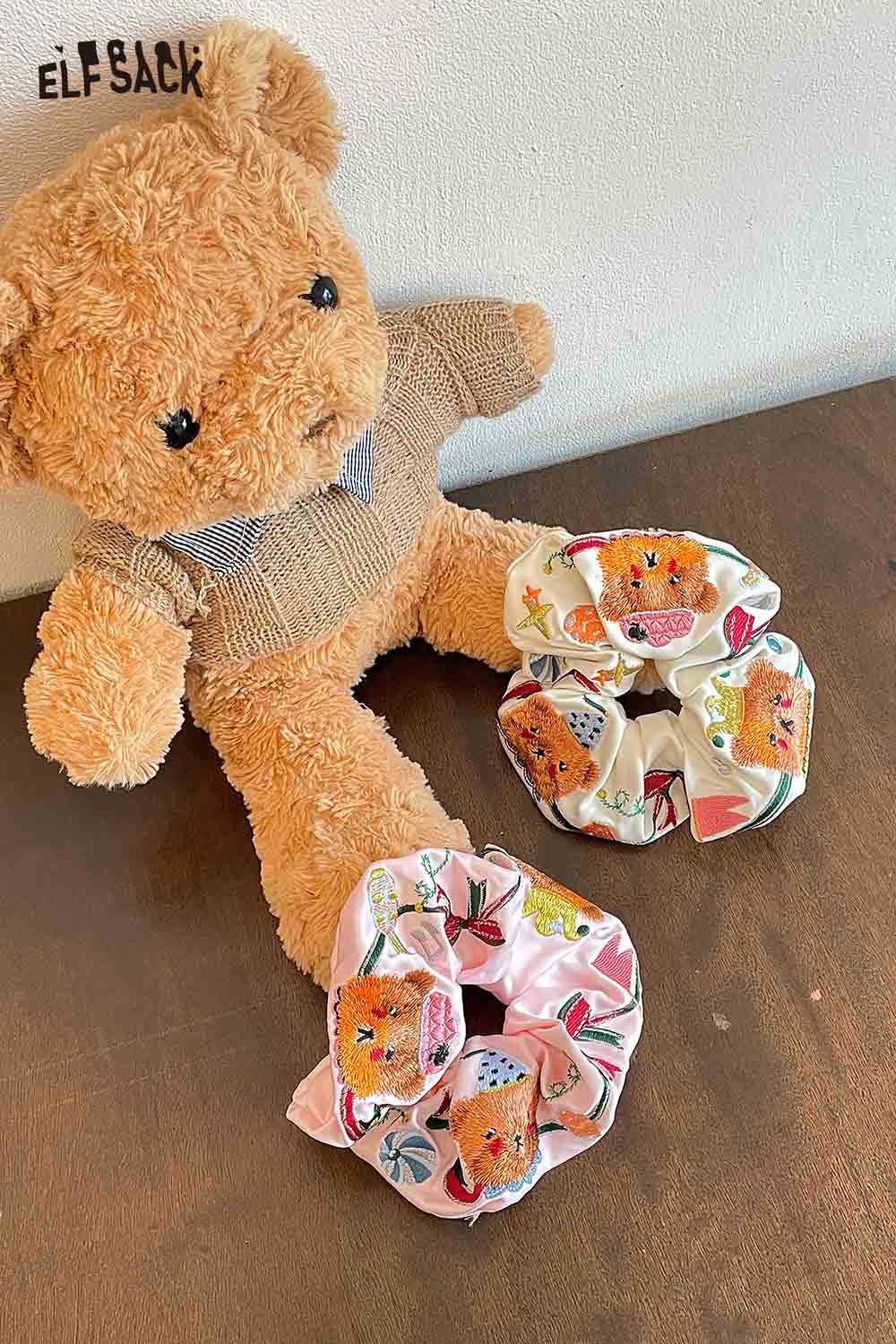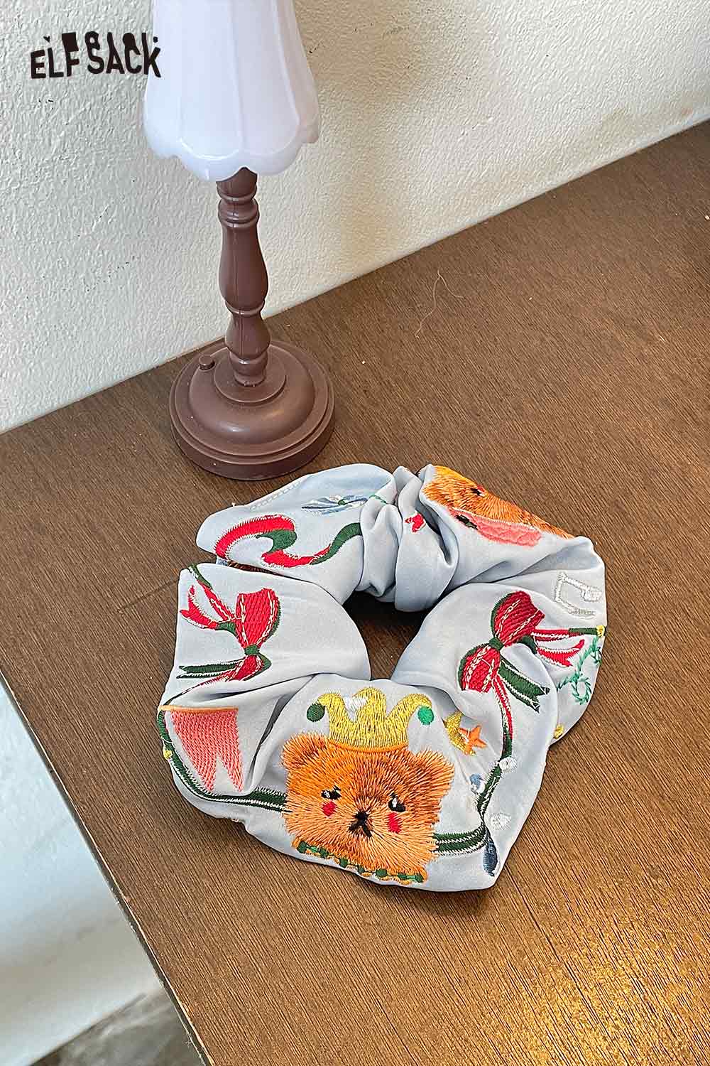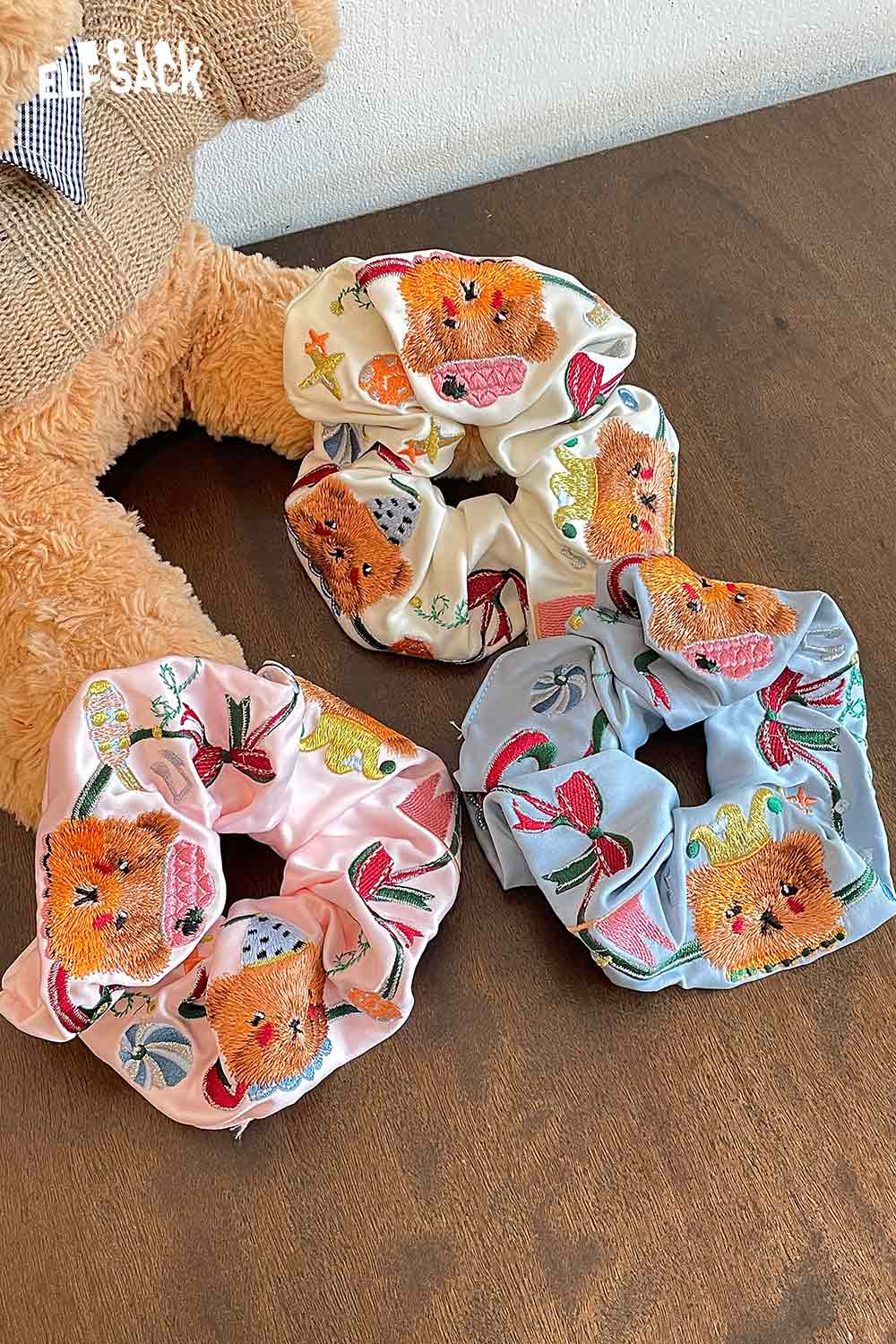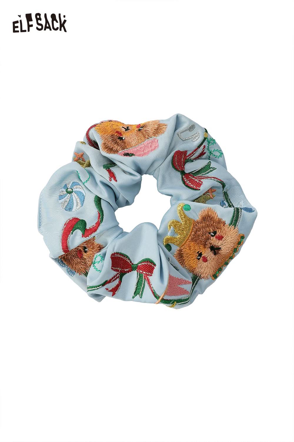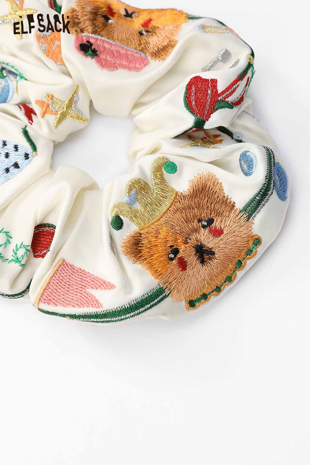 Embroidered Bear and Bow Design Elastic Hair Tie