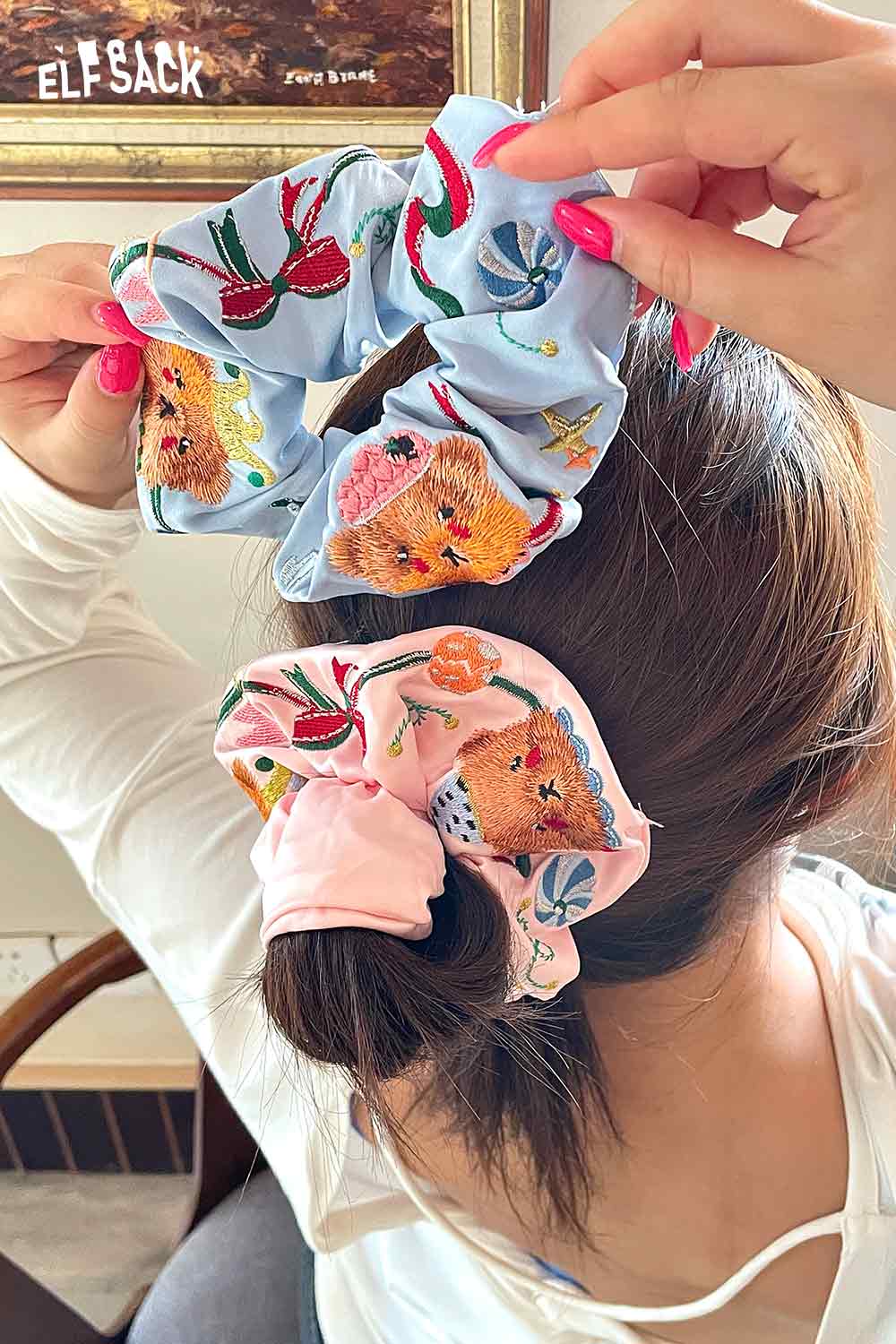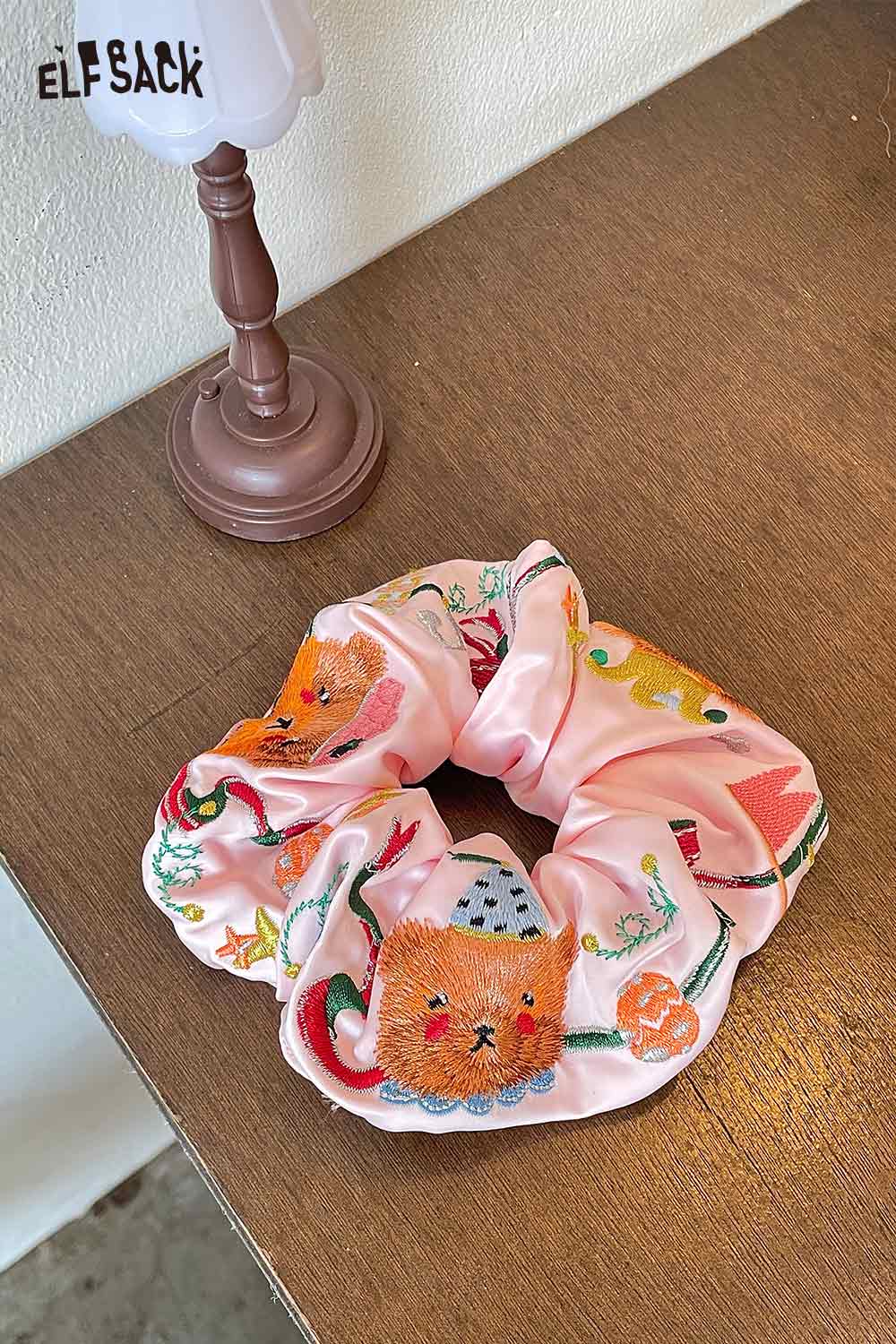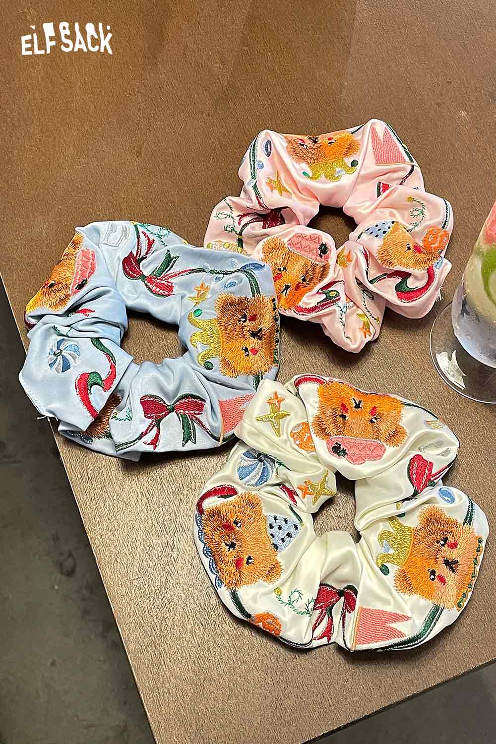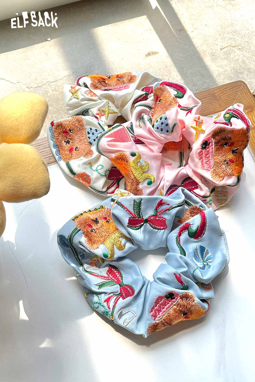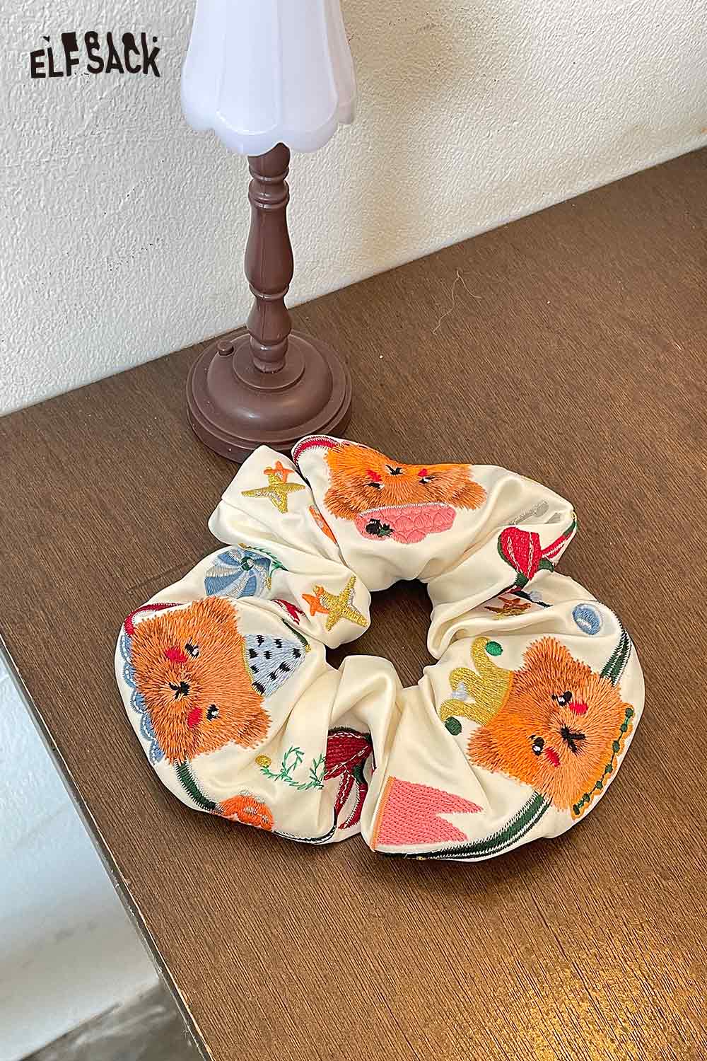 Embroidered Bear and Bow Design Elastic Hair Tie