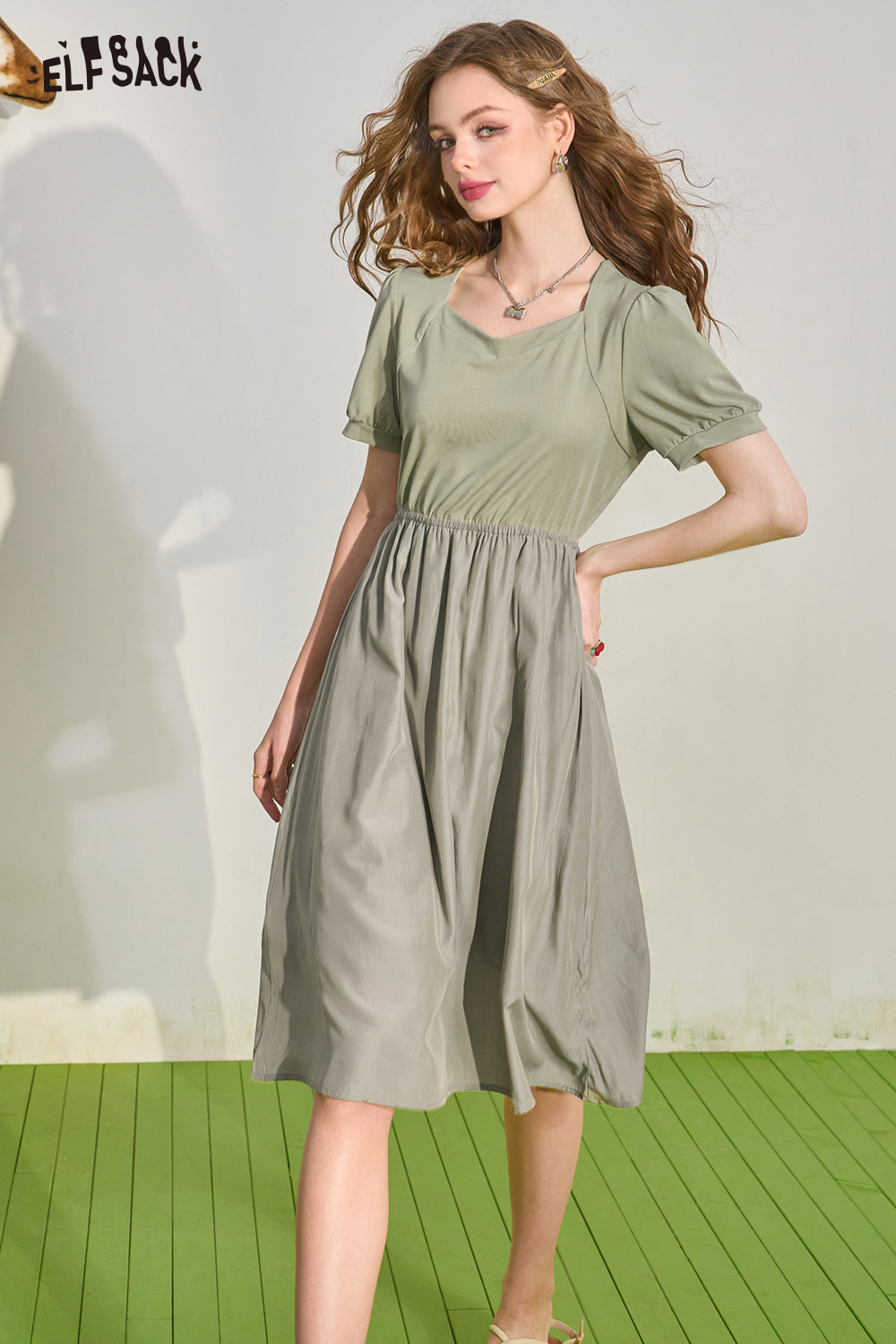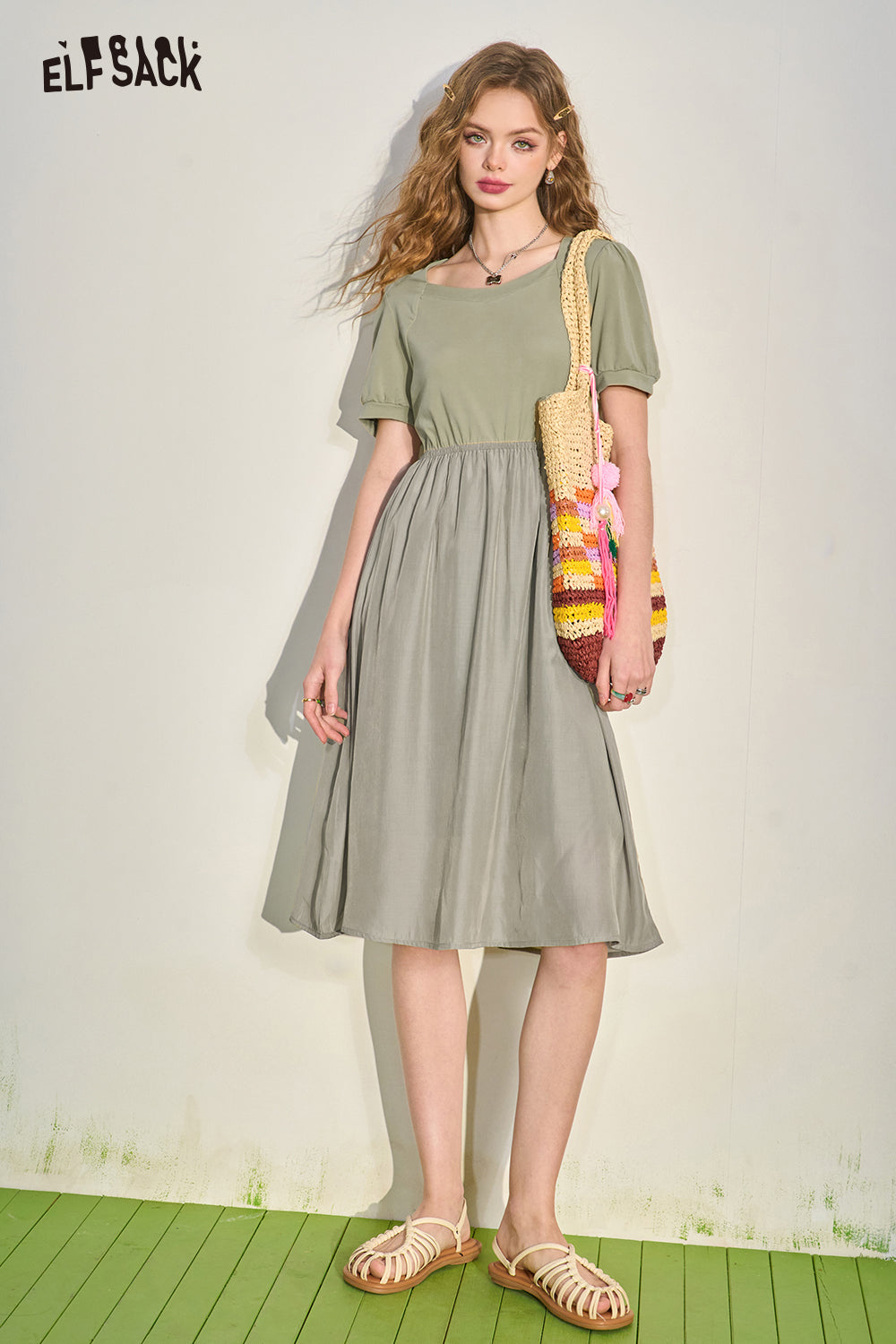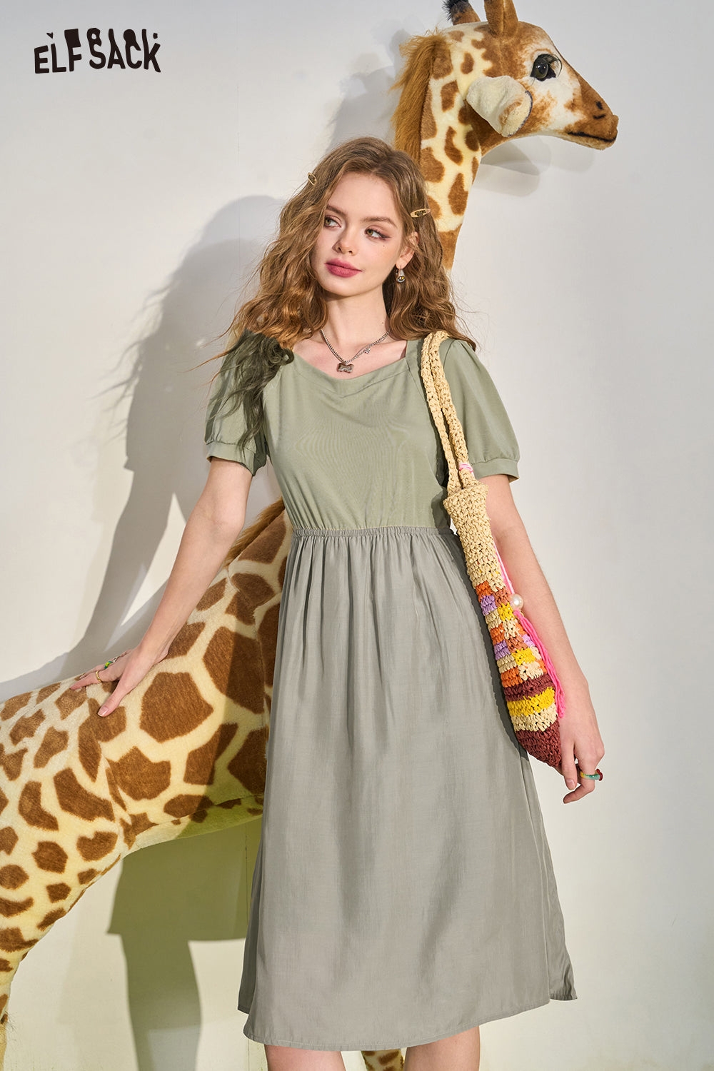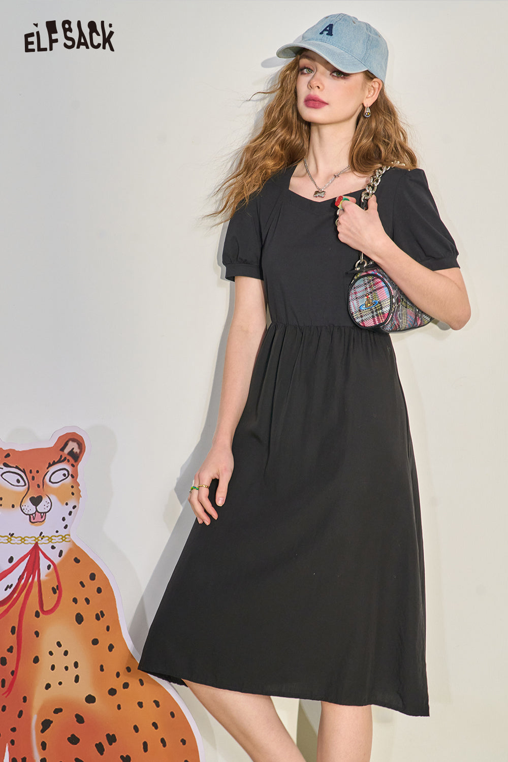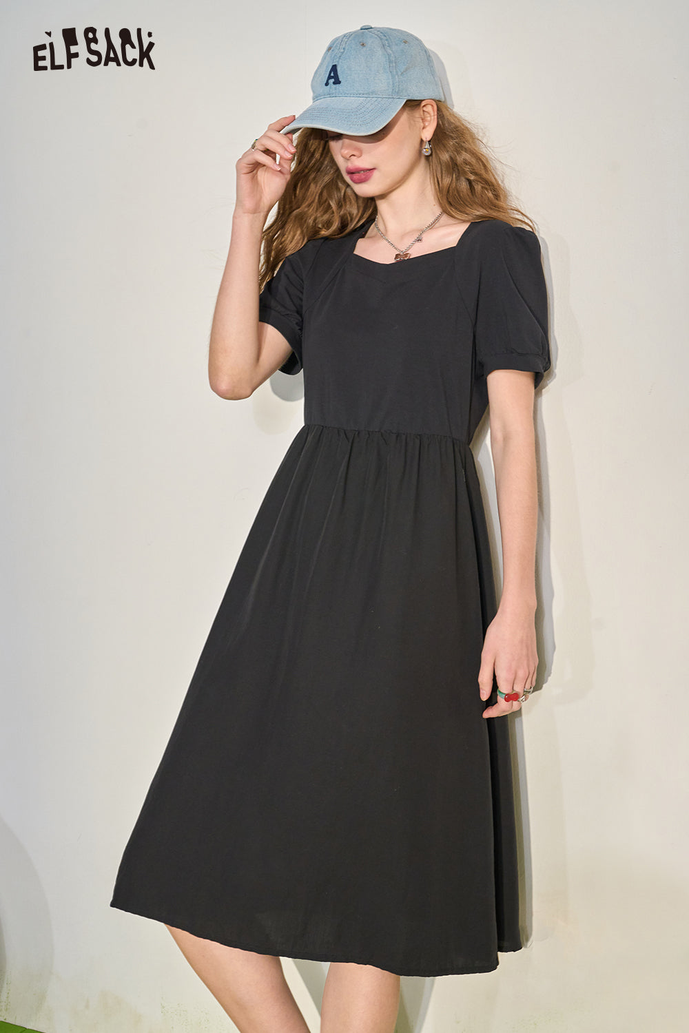 Puff Sleeve Color Block Waist Tie Black Dress